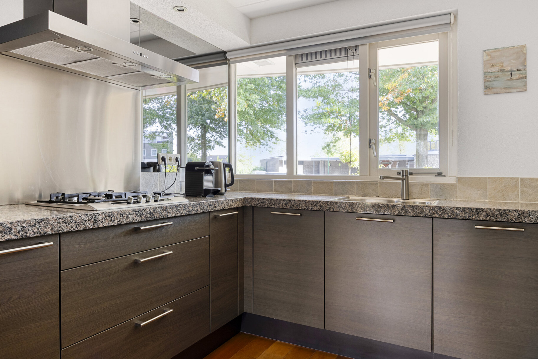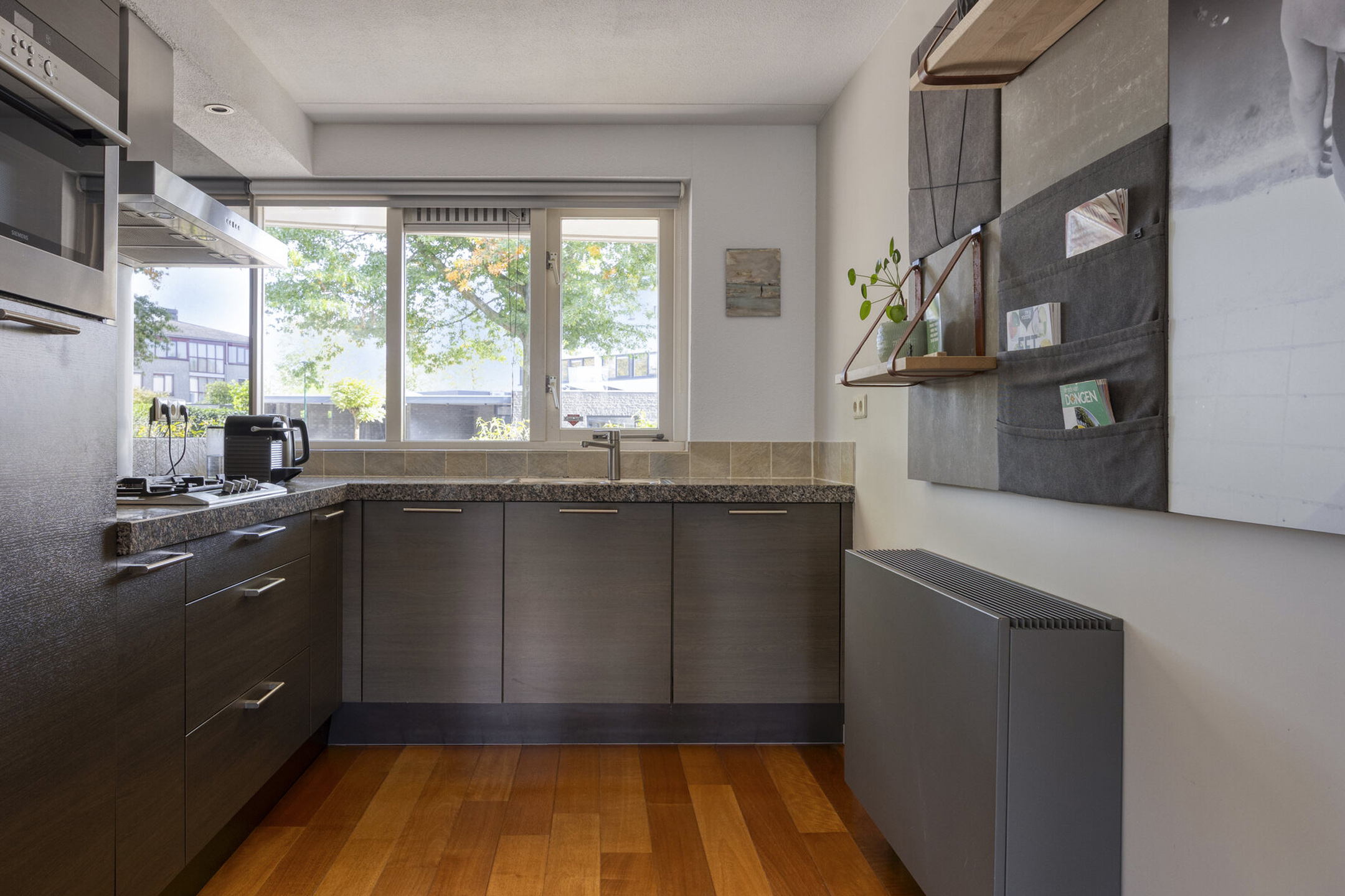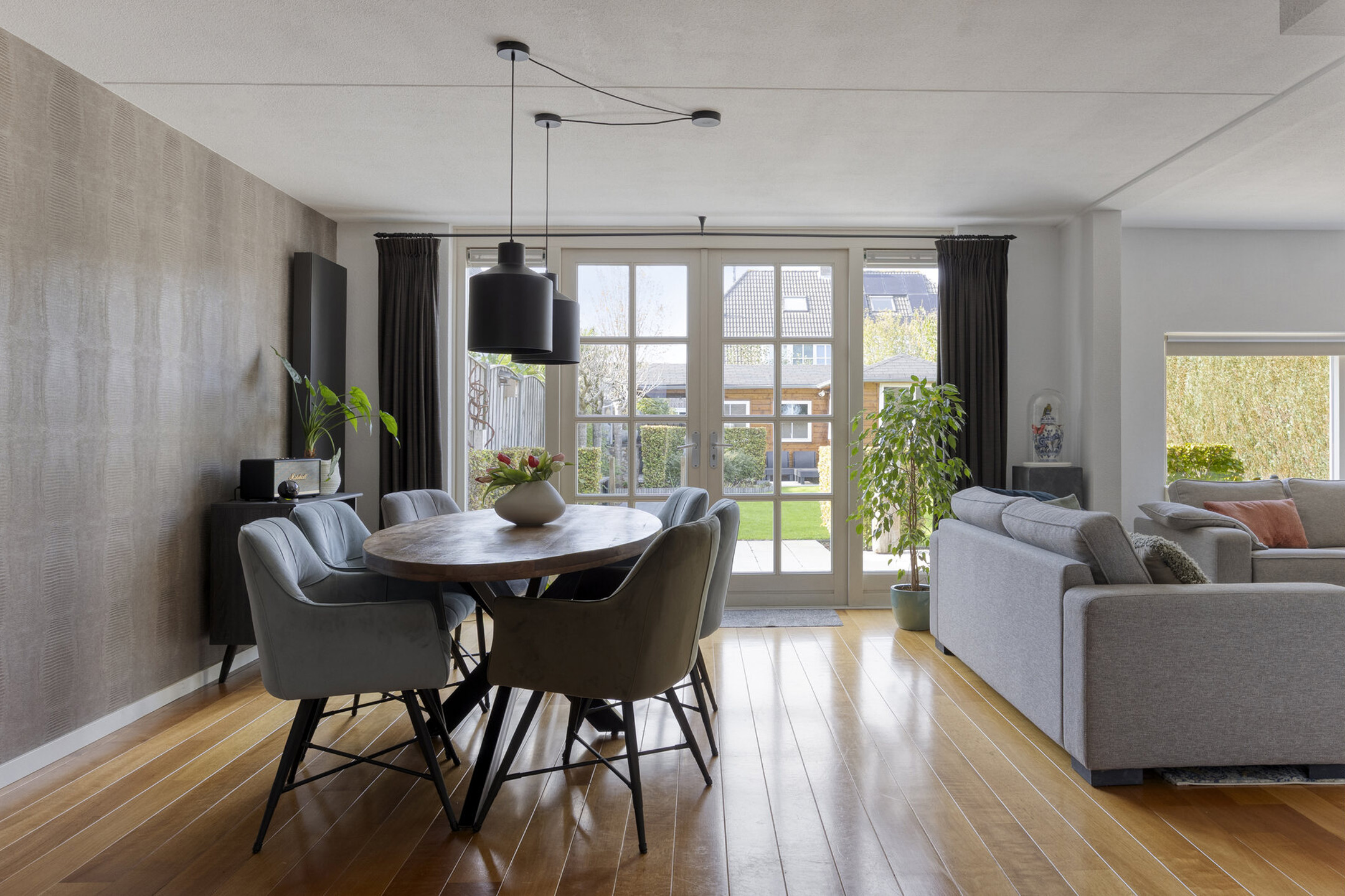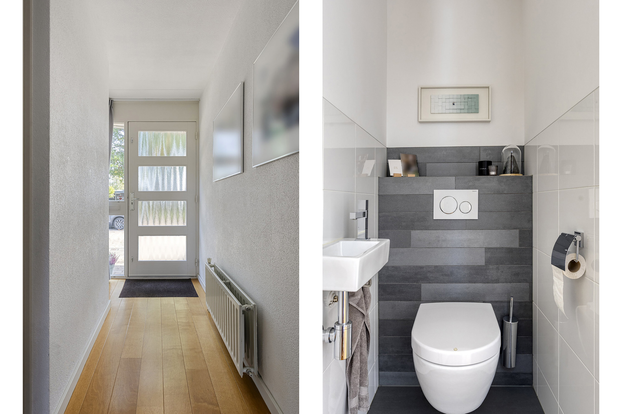 Entree/hal met vernieuwde meterkast (2022), toilet, trapopgang en toegang tot de bijkeuken met wasmachine- en drogeraansluiting. Vanuit de hal toegang tot de lichte woonkamer met robijnhouten lamelparketvloer, sfeervolle gashaard en openslaande tuindeuren naar de achtertuin. Aan de voorzijde bevindt zich de keuken, voorzien van 4-pits gaskookplaat, vaatwasser, koelkast en combi-oven/magnetron. Aangrenzend bevindt zich een praktische kantoor- of speelruimte.