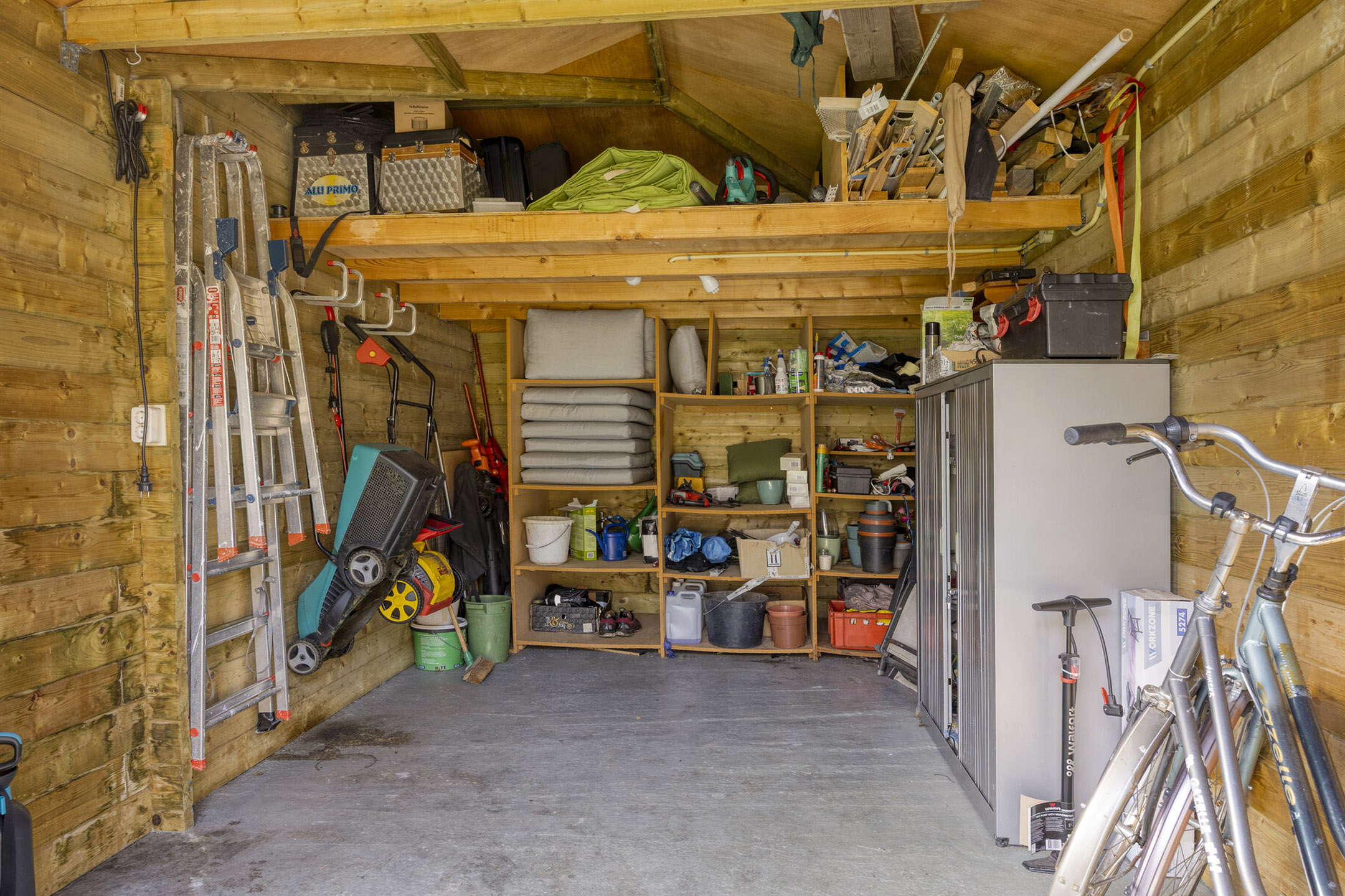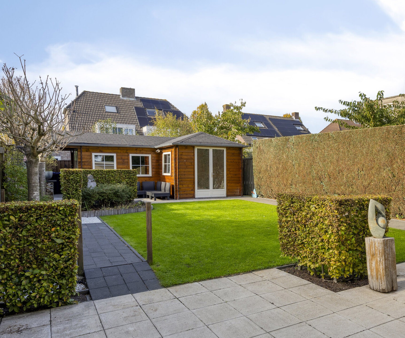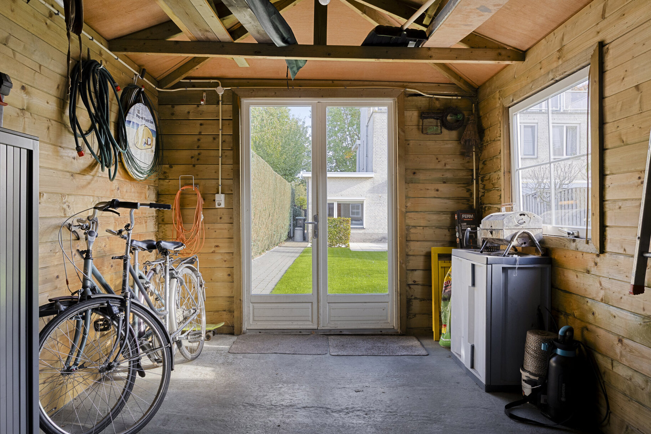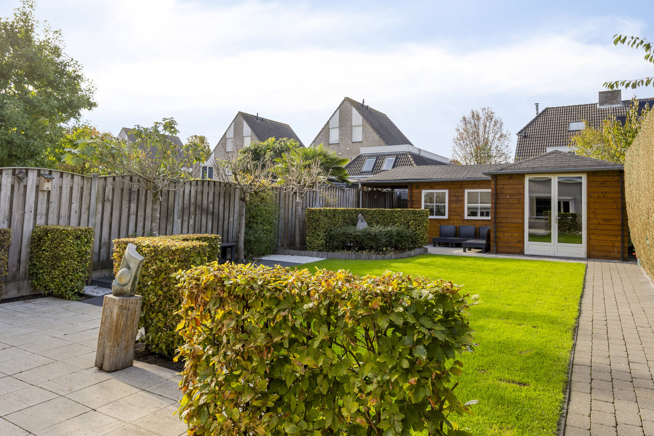 De diepe achtertuin op het westen is verzorgd aangelegd met klinker- en tegelbestrating, gazon, plantenborders en een waterput. Achterin de tuin bevindt zich een ruime houten berging voorzien van elektra en praktische achterom.