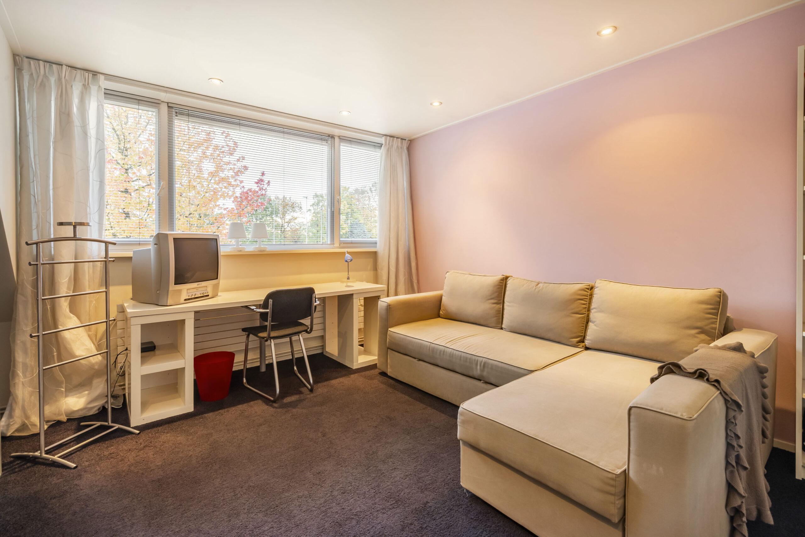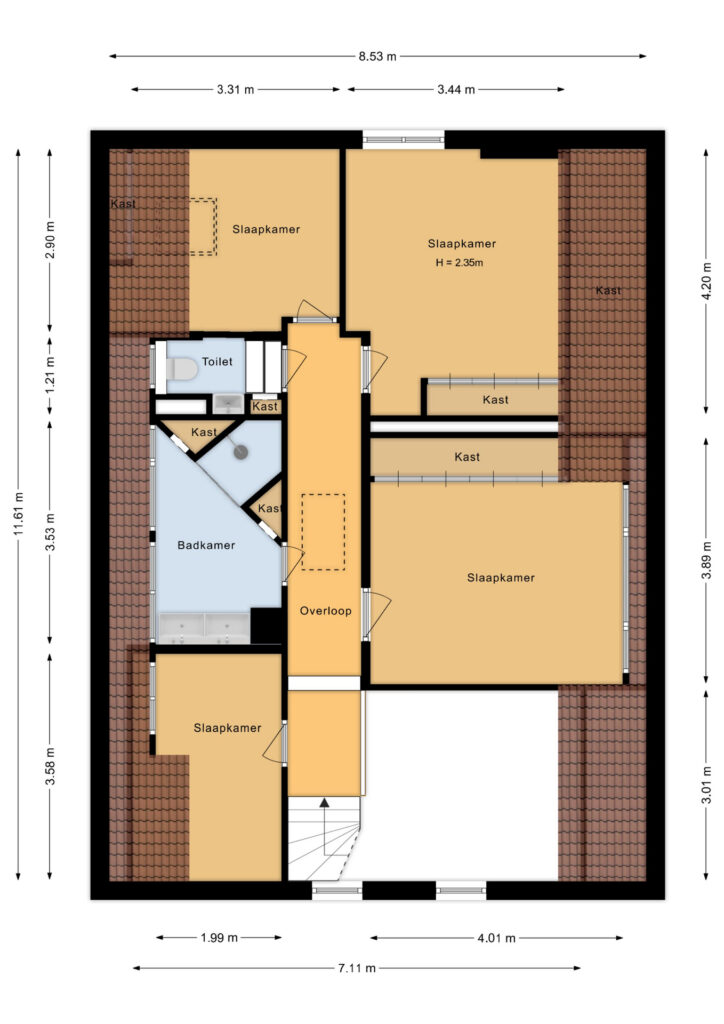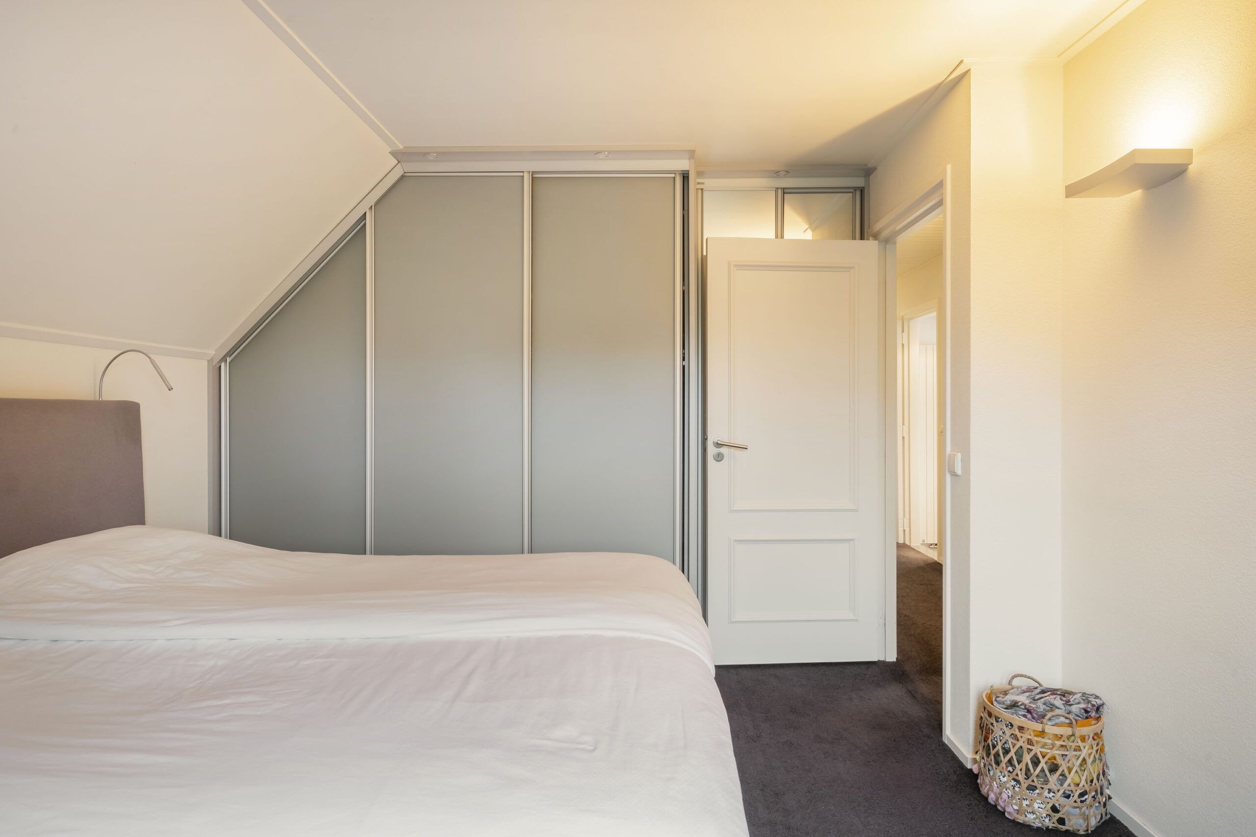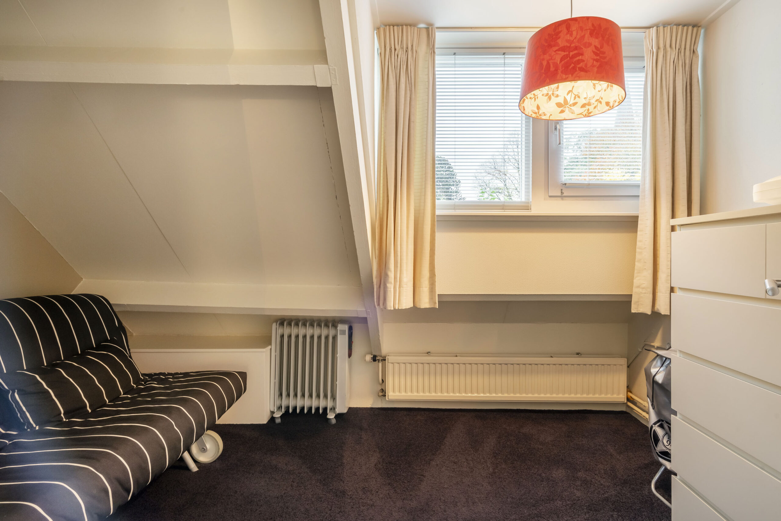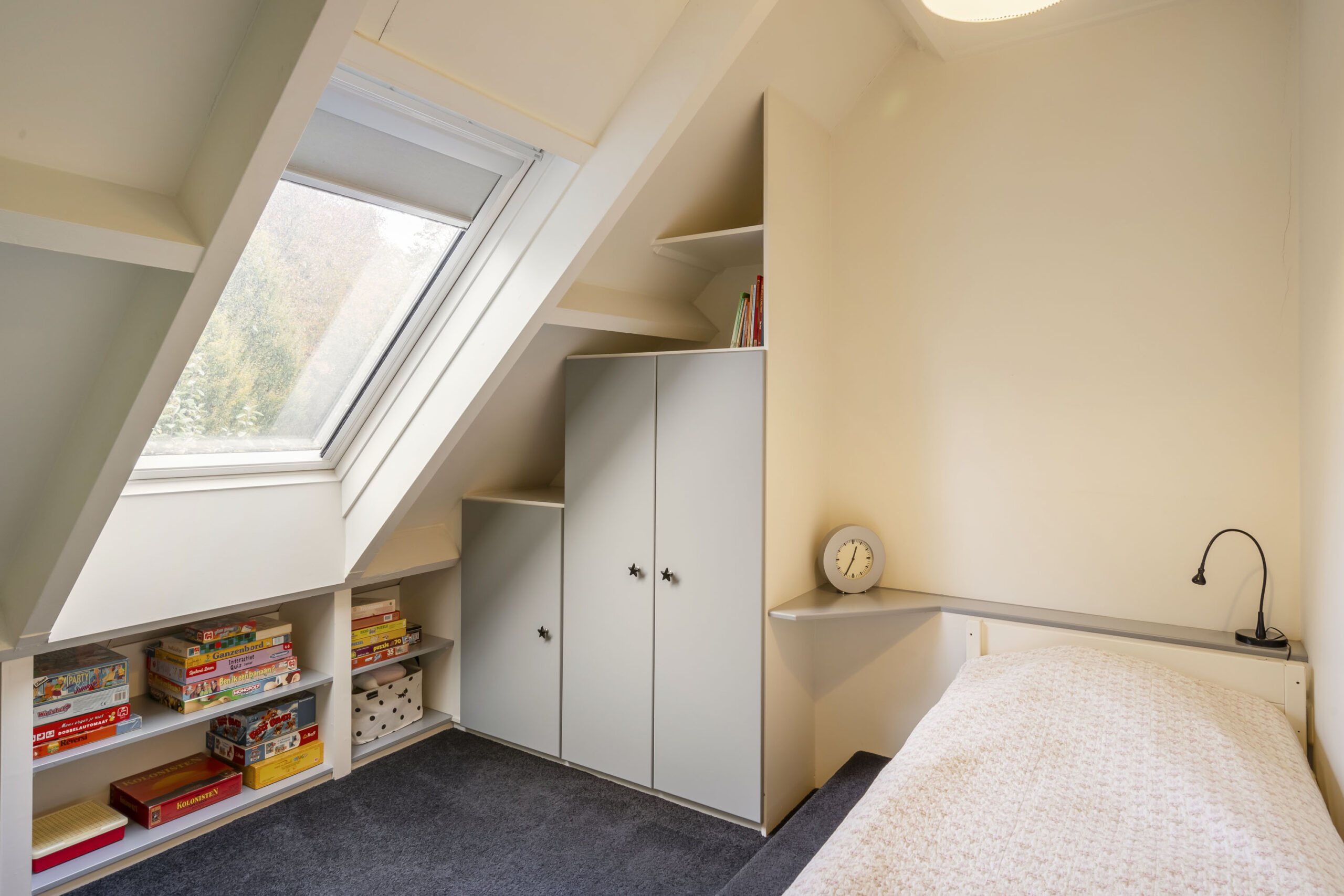 Aan de voorzijde bevindt zich een tweede slaapkamer met dakkapel, bergkast en strak stucwerk. De derde slaapkamer aan de achterzijde heeft een dakraam met verduisteringsgordijn en eveneens een nette afwerking.