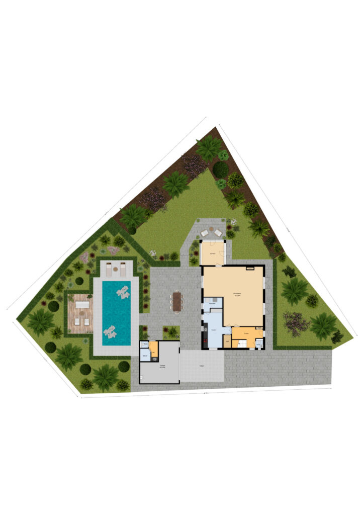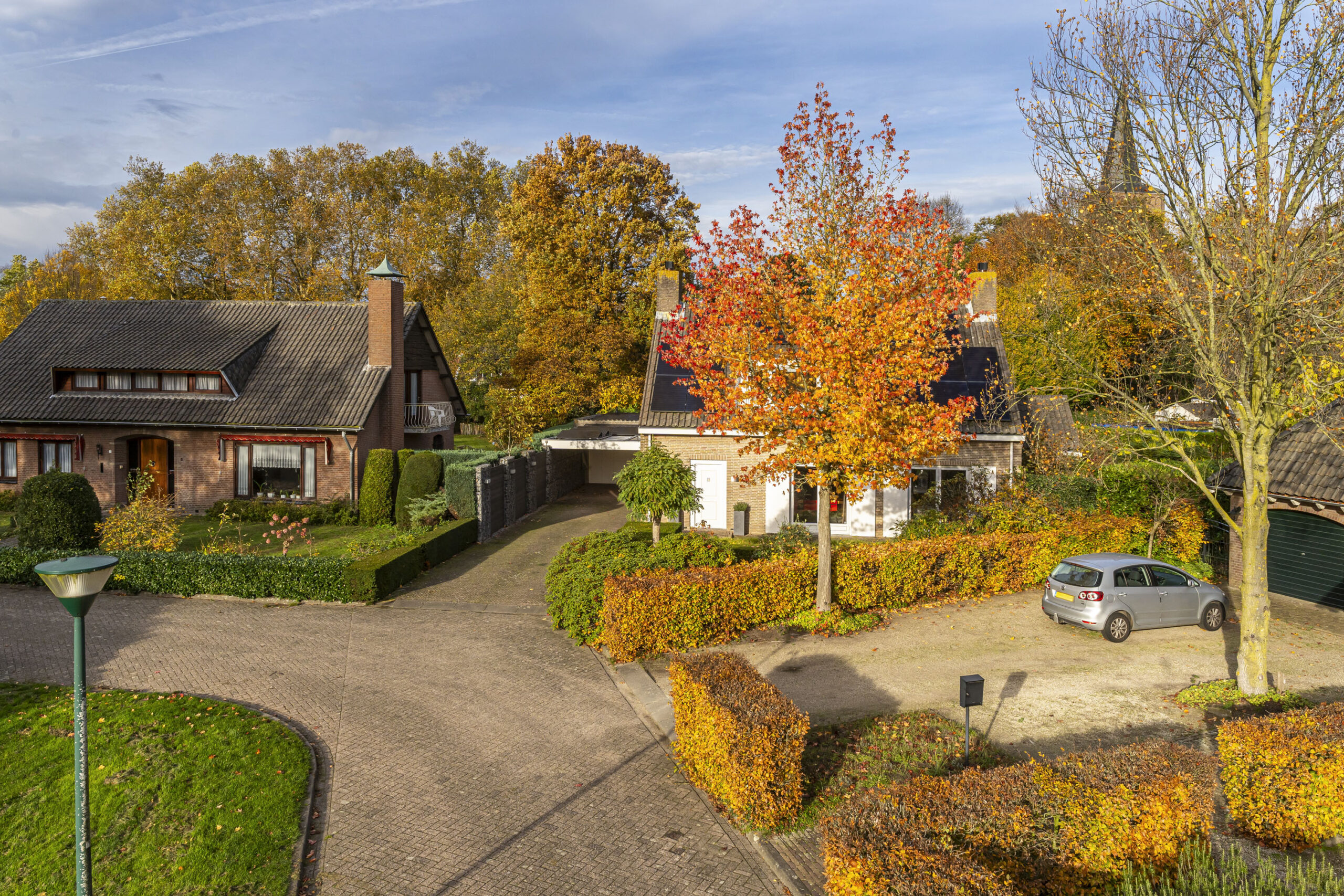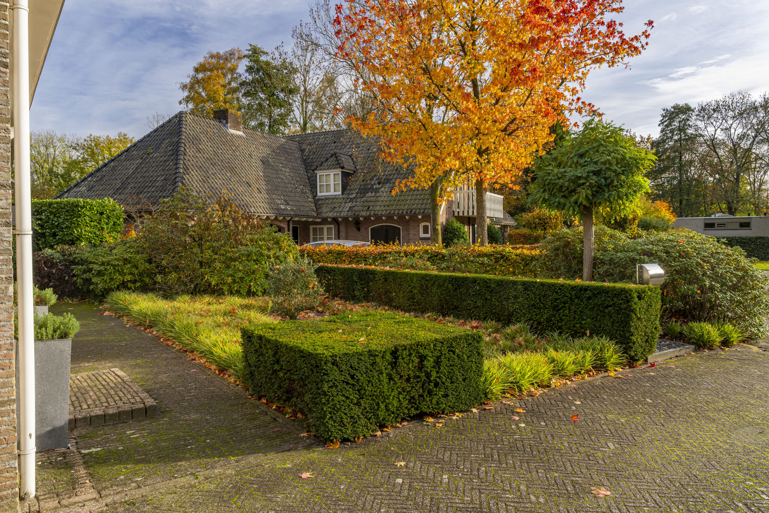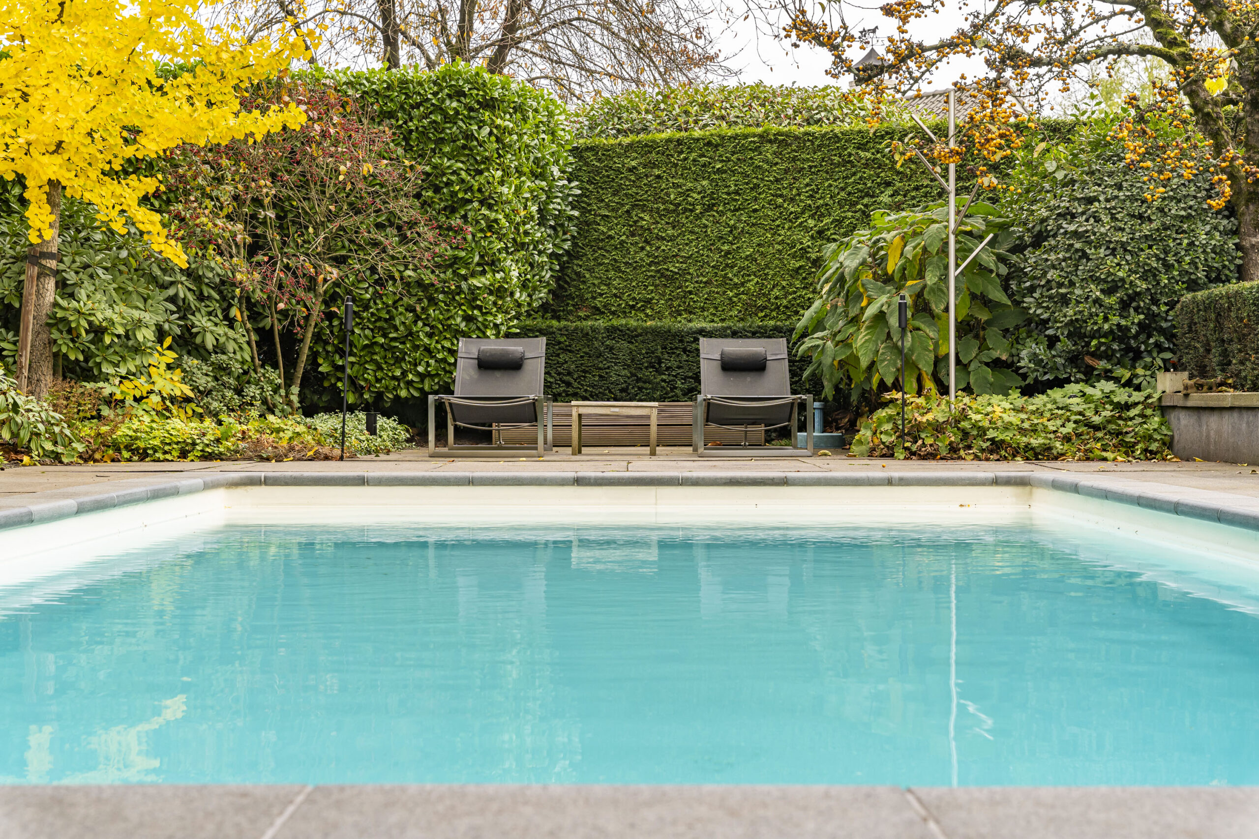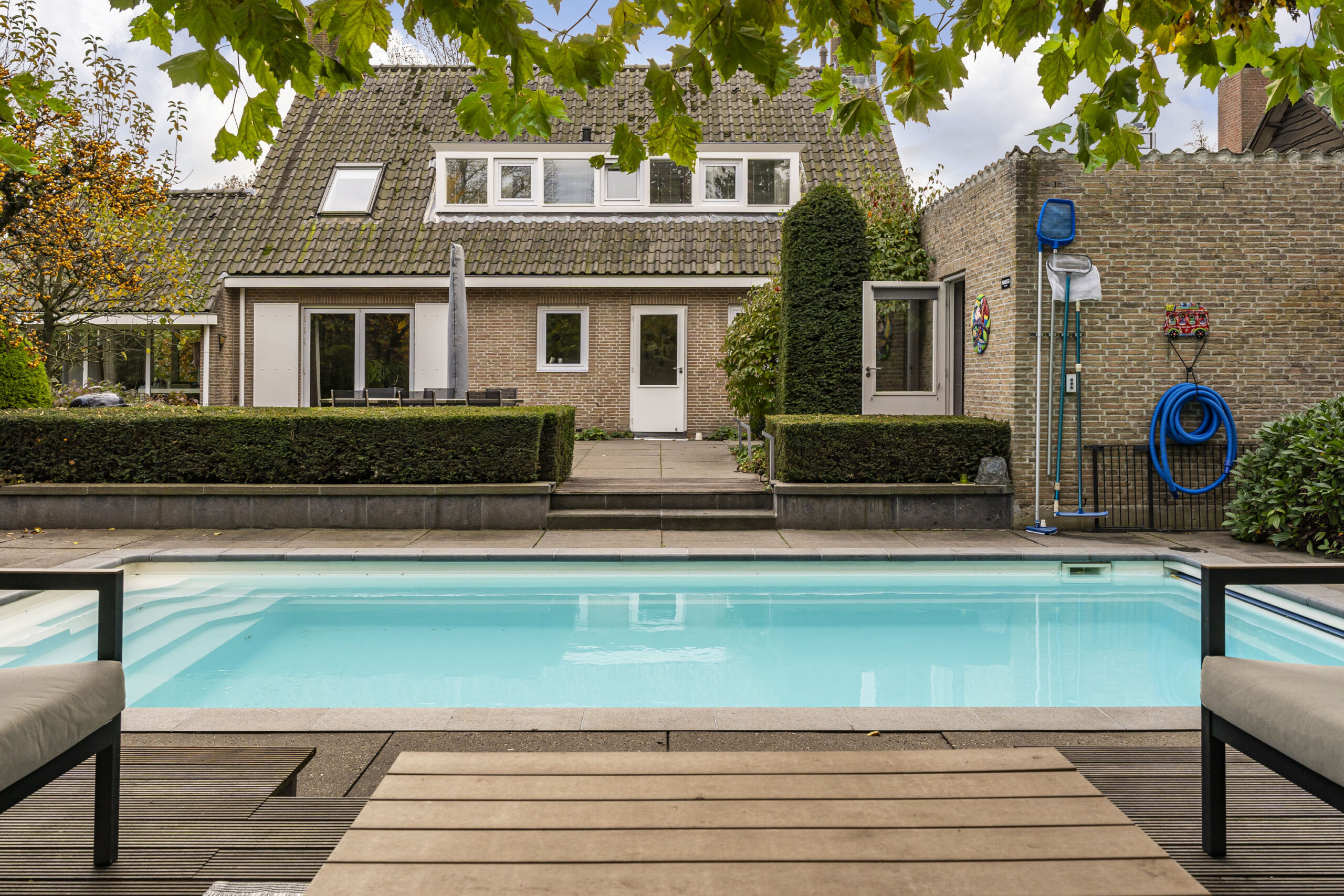 Er is een royaal zwembad met buitendouche, een sauna met wastafelmeubel en toilet, en een garage voorzien van een betonvloer, ketel en zwembadinstallatie. De royale oprit met klinkerbestrating en carport biedt ruimte voor meerdere auto’s.