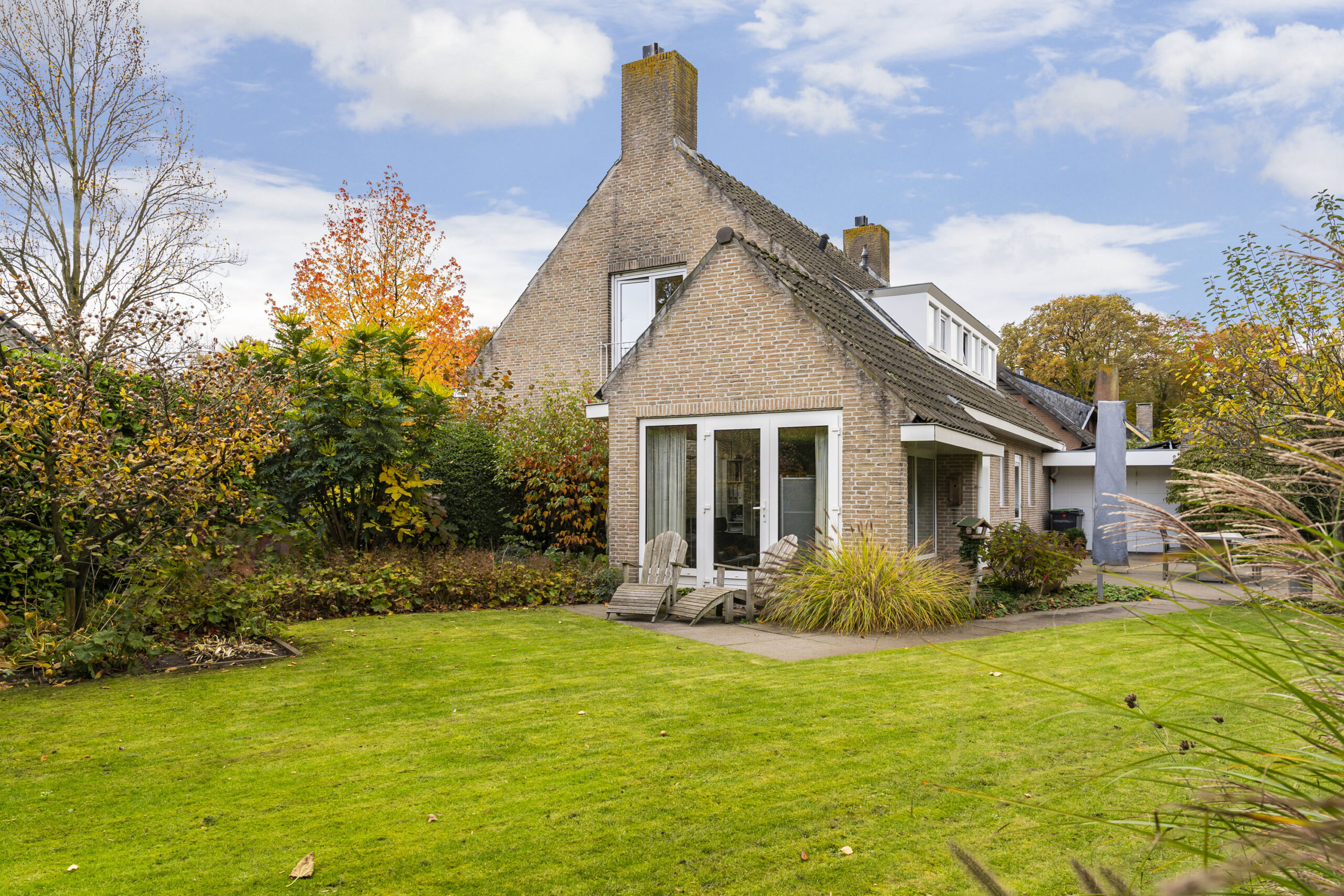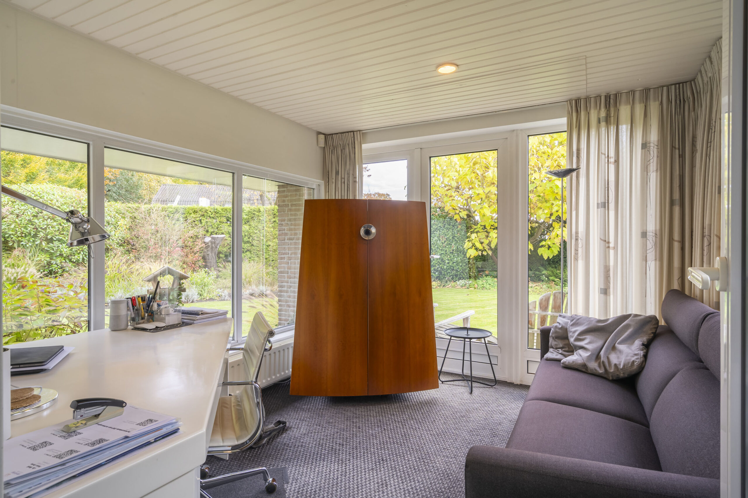Aan de achterzijde bevindt zich de tuinkamer, uitgevoerd met massief houten vloer waarover nu tapijt is gelegd.