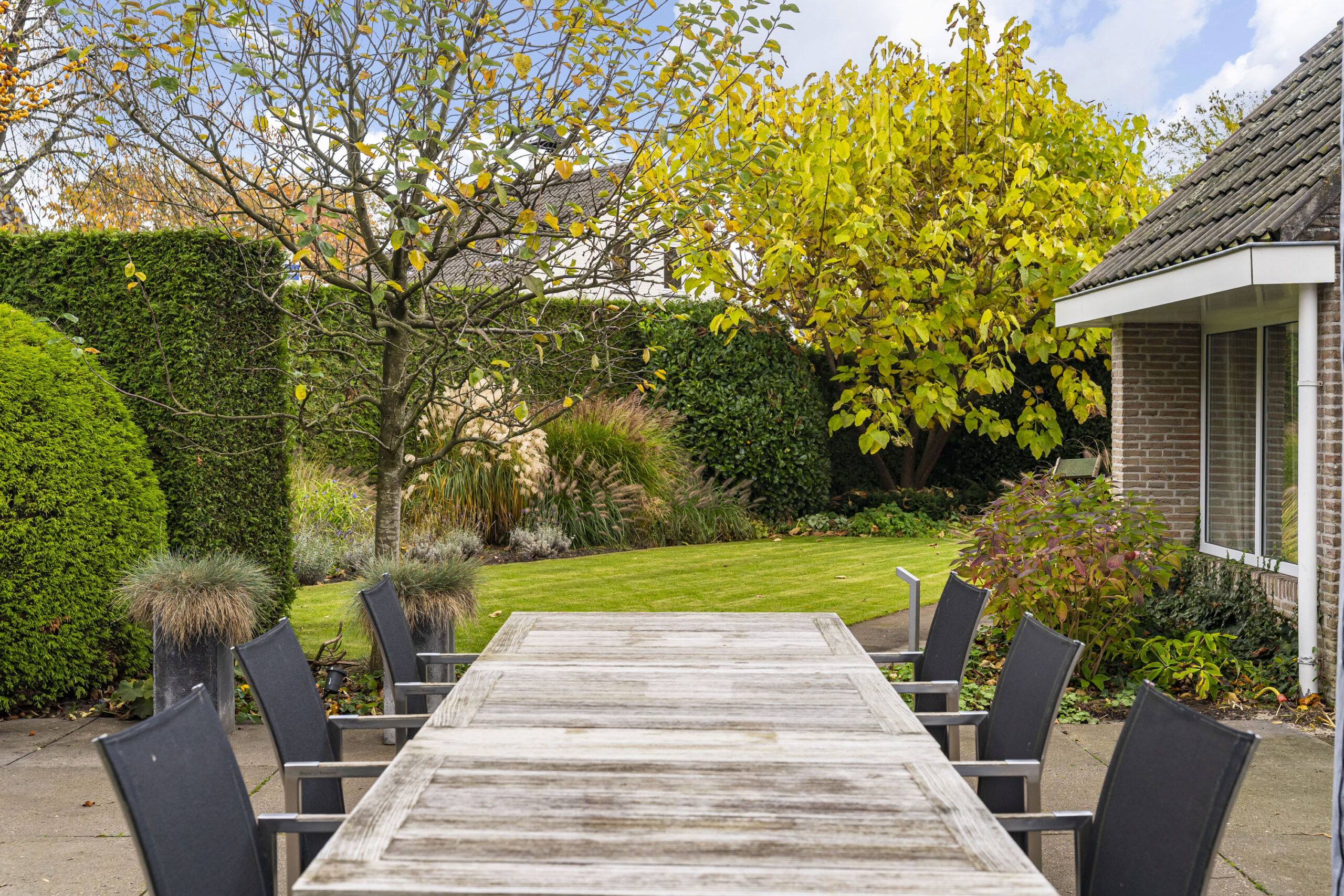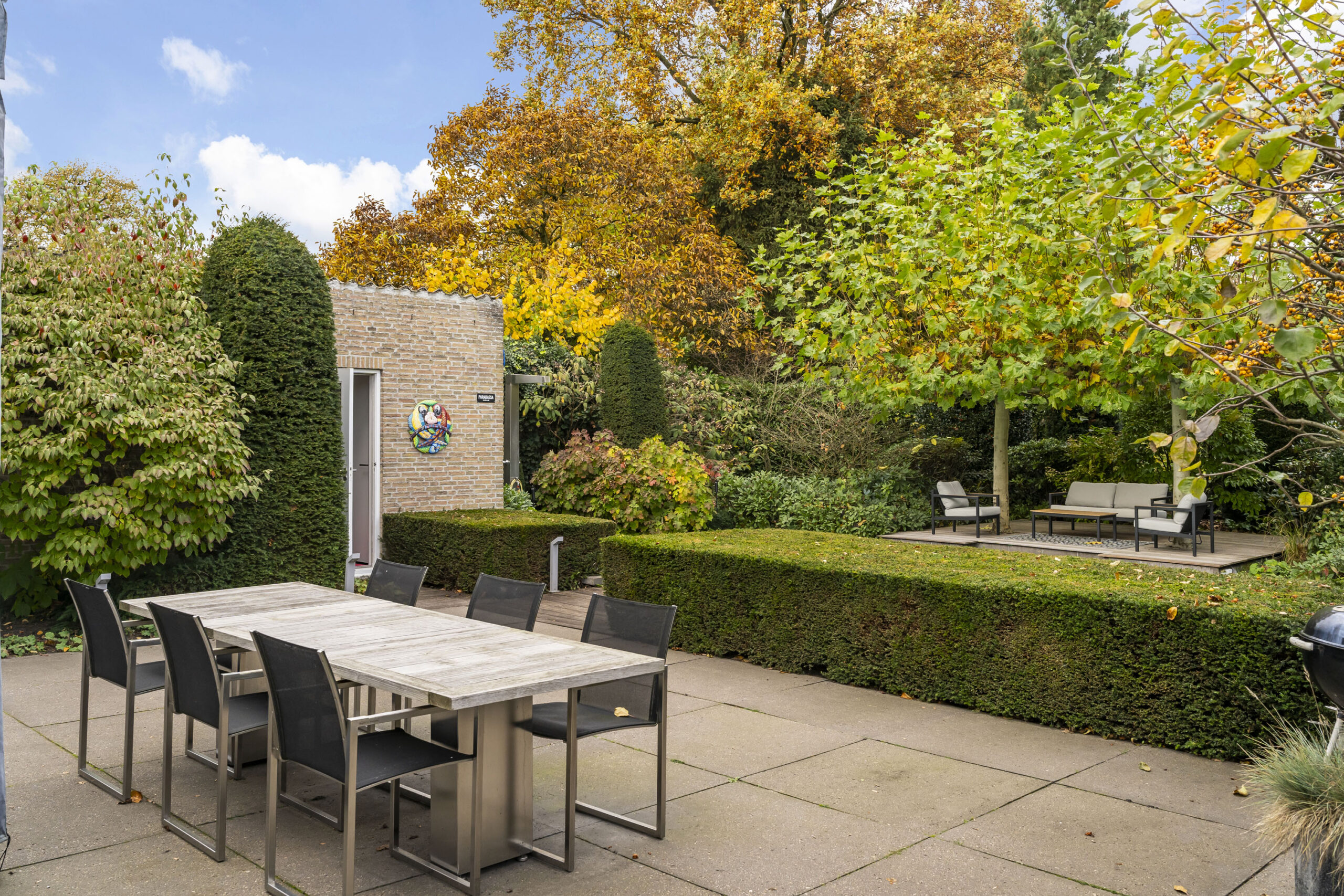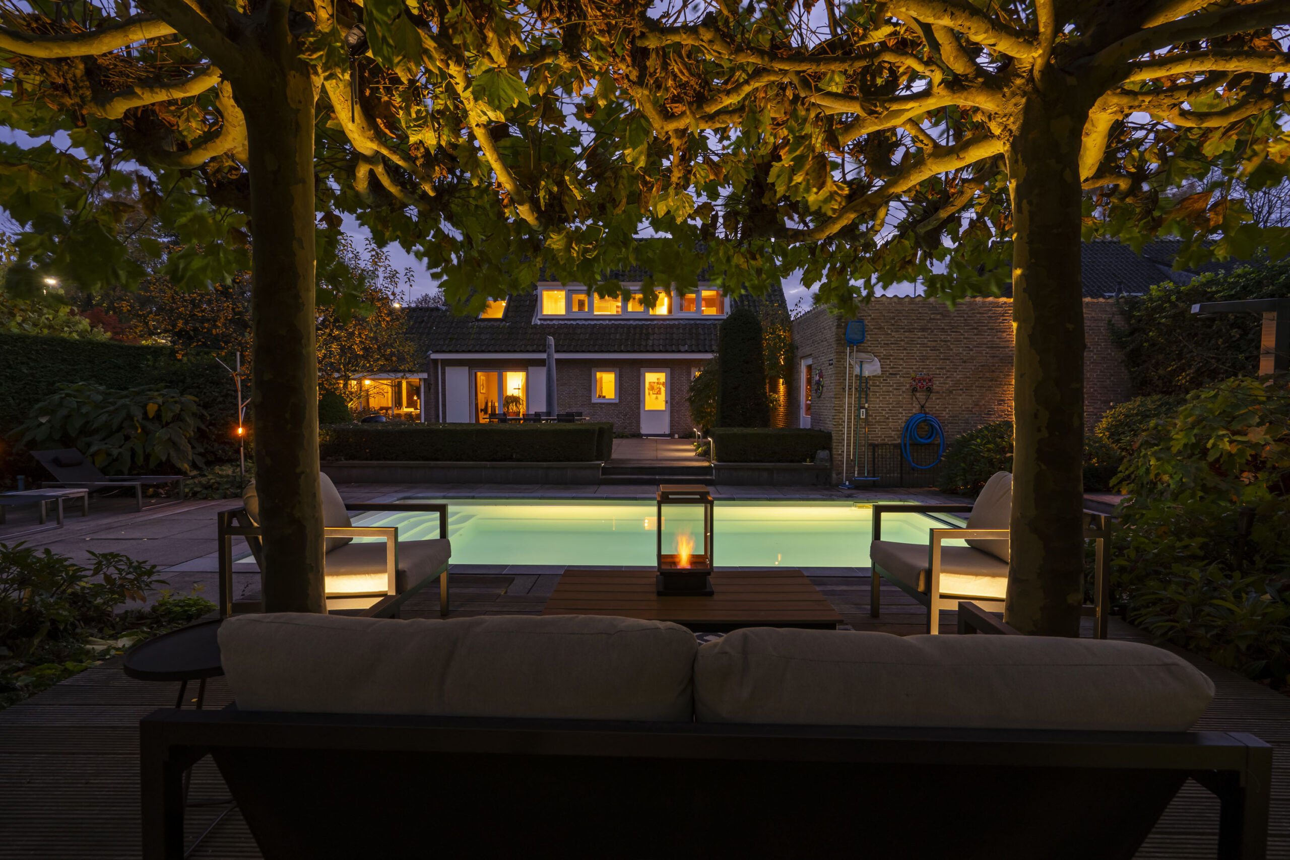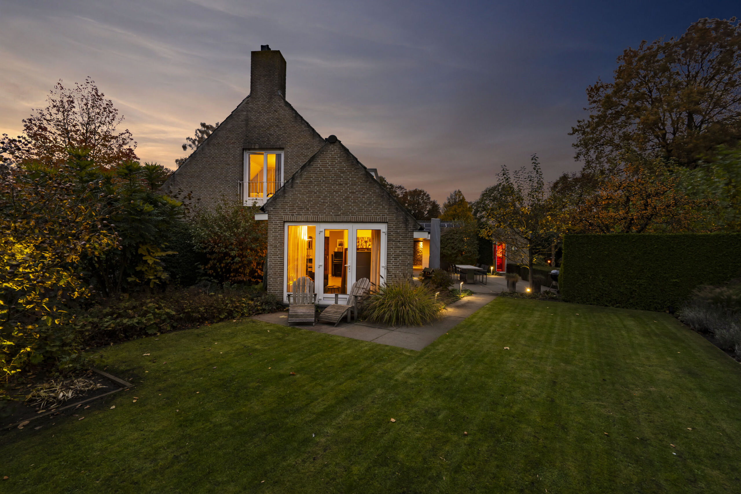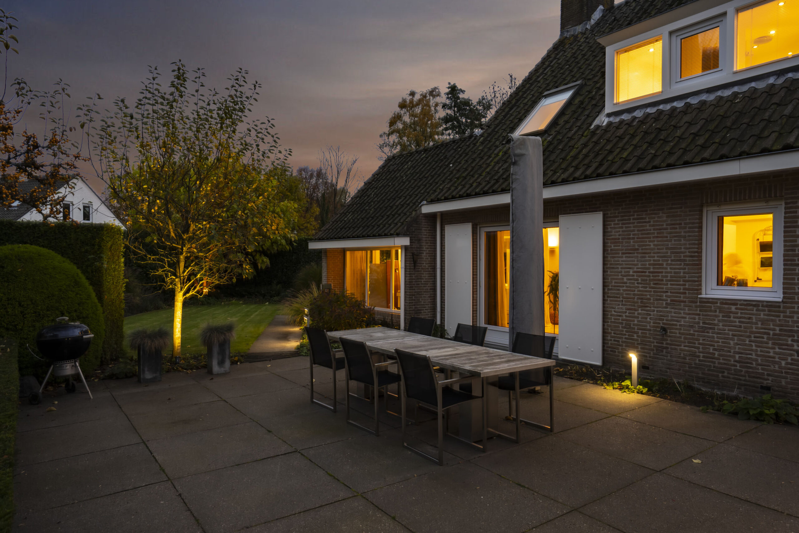 De tuin is met oog voor detail aangelegd en biedt optimale privacy. Verlichting is geautomatiseerd en verwerkt in het ontwerp, met fraaie tegelbestrating en meerdere terrassen.
