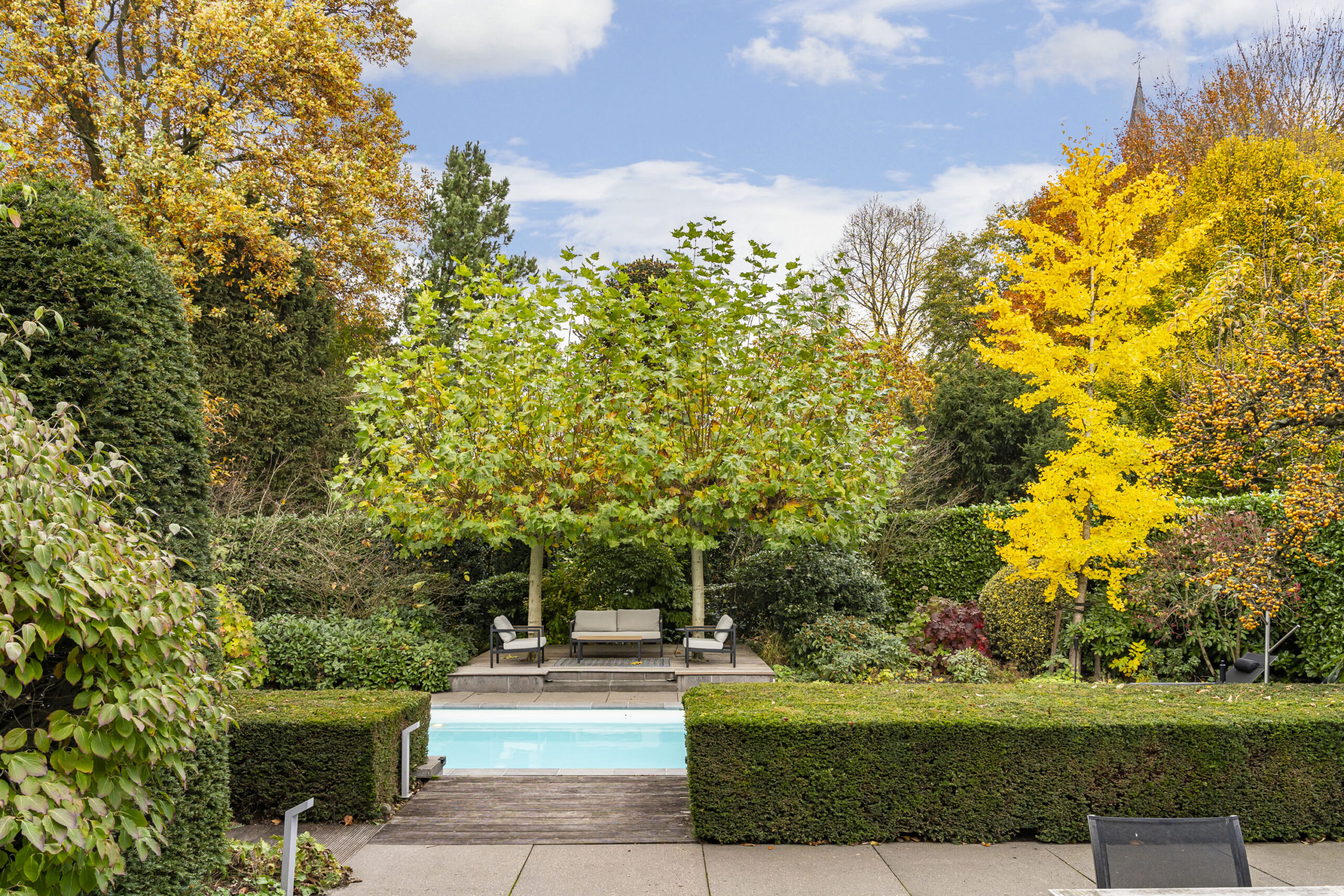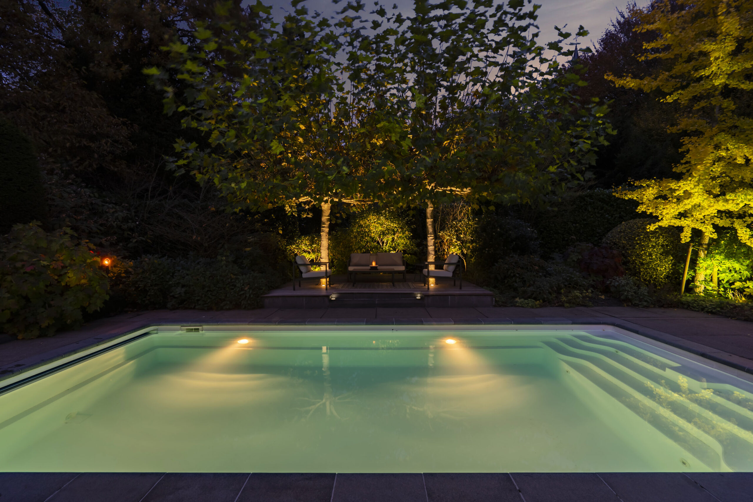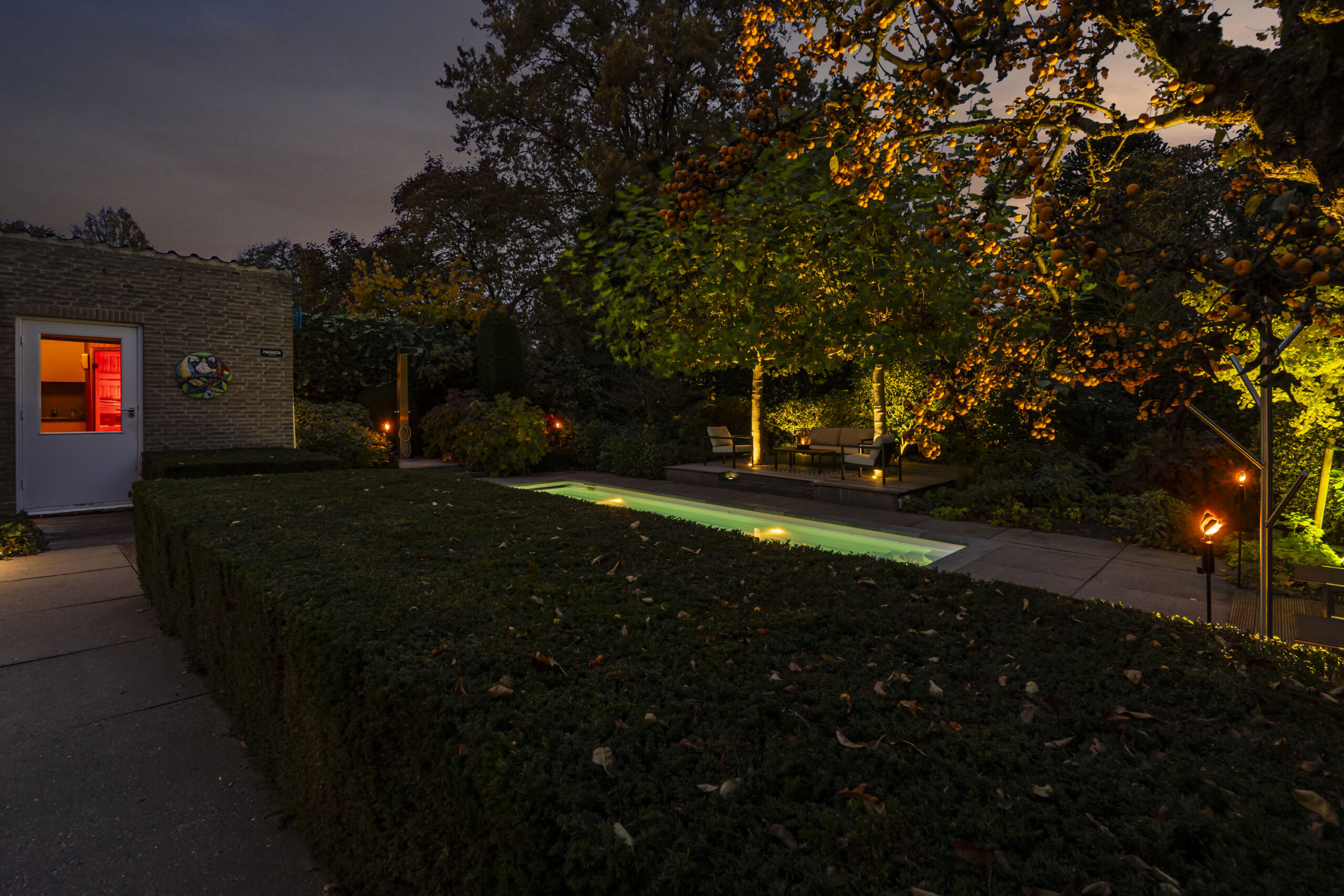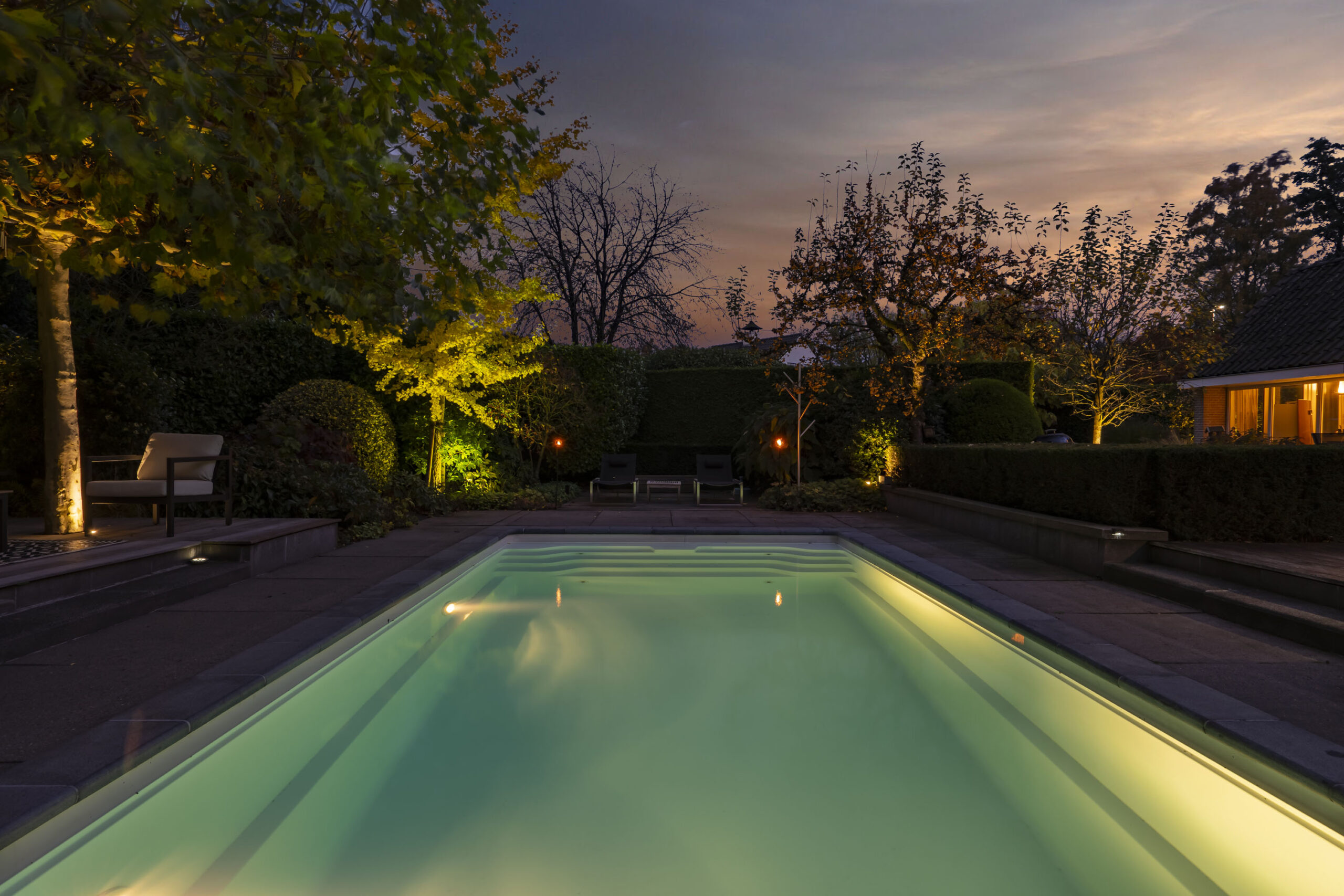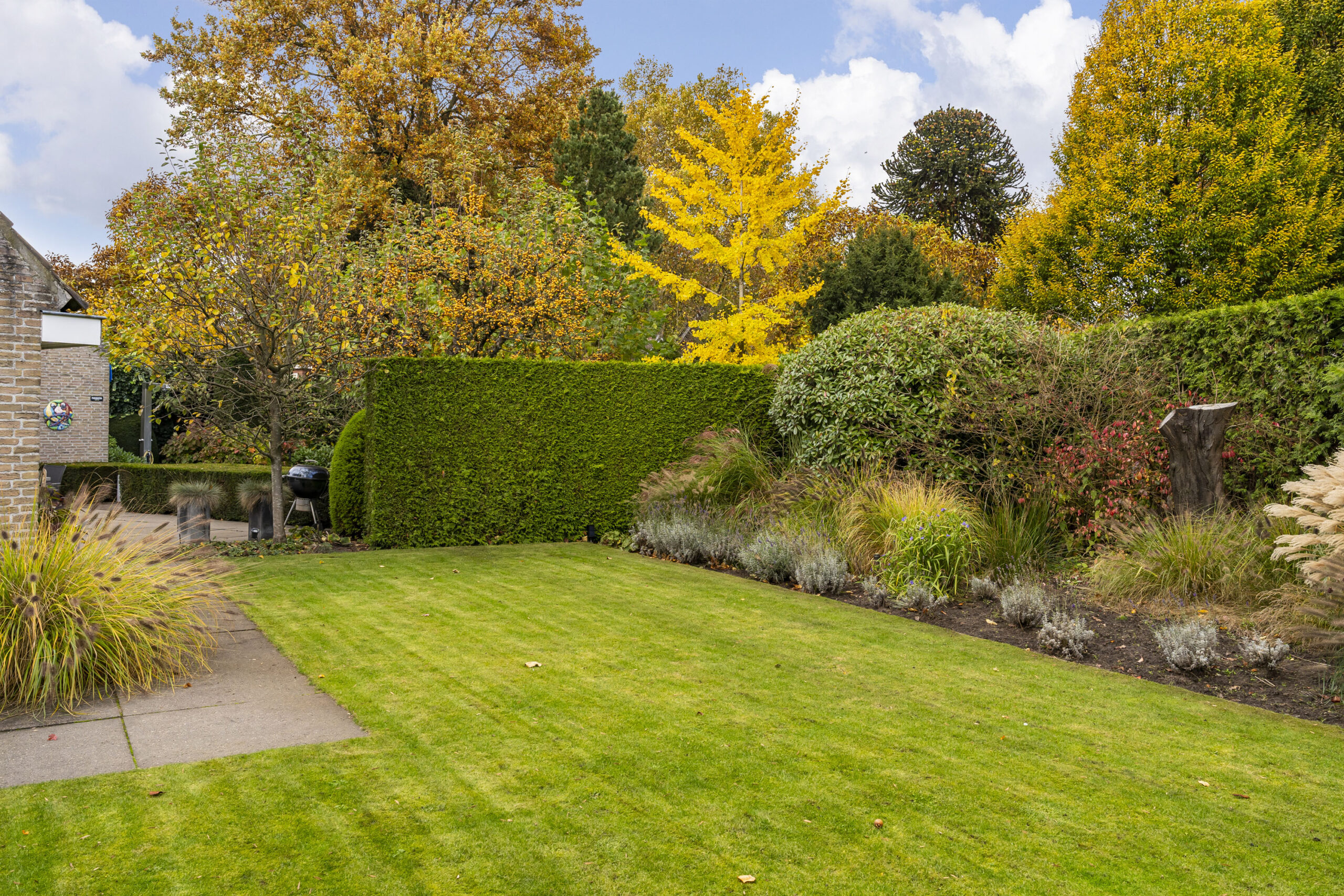 De tuin is met oog voor detail aangelegd en biedt optimale privacy. Verlichting is geautomatiseerd en verwerkt in het ontwerp, met fraaie tegelbestrating en meerdere terrassen.
