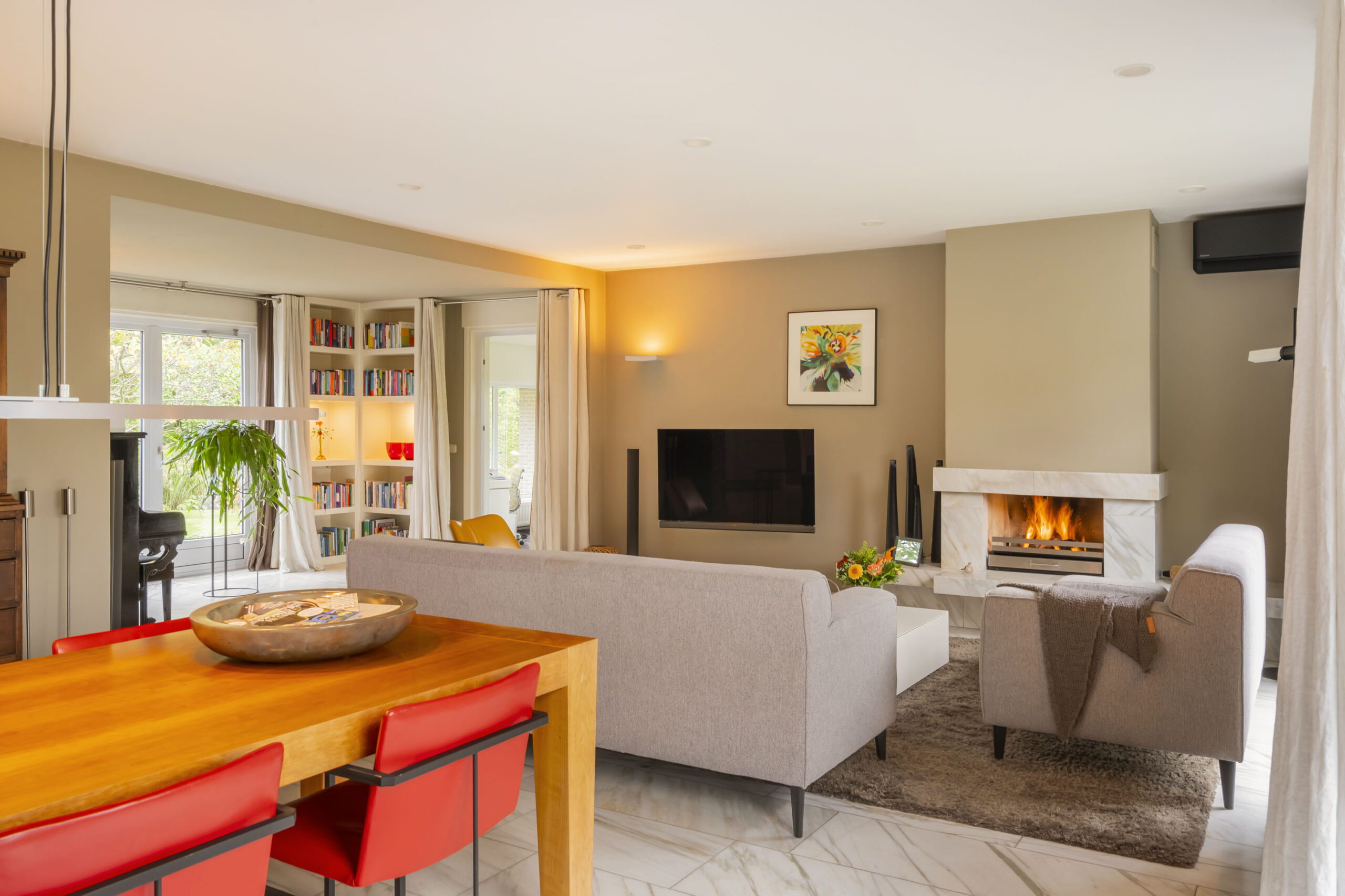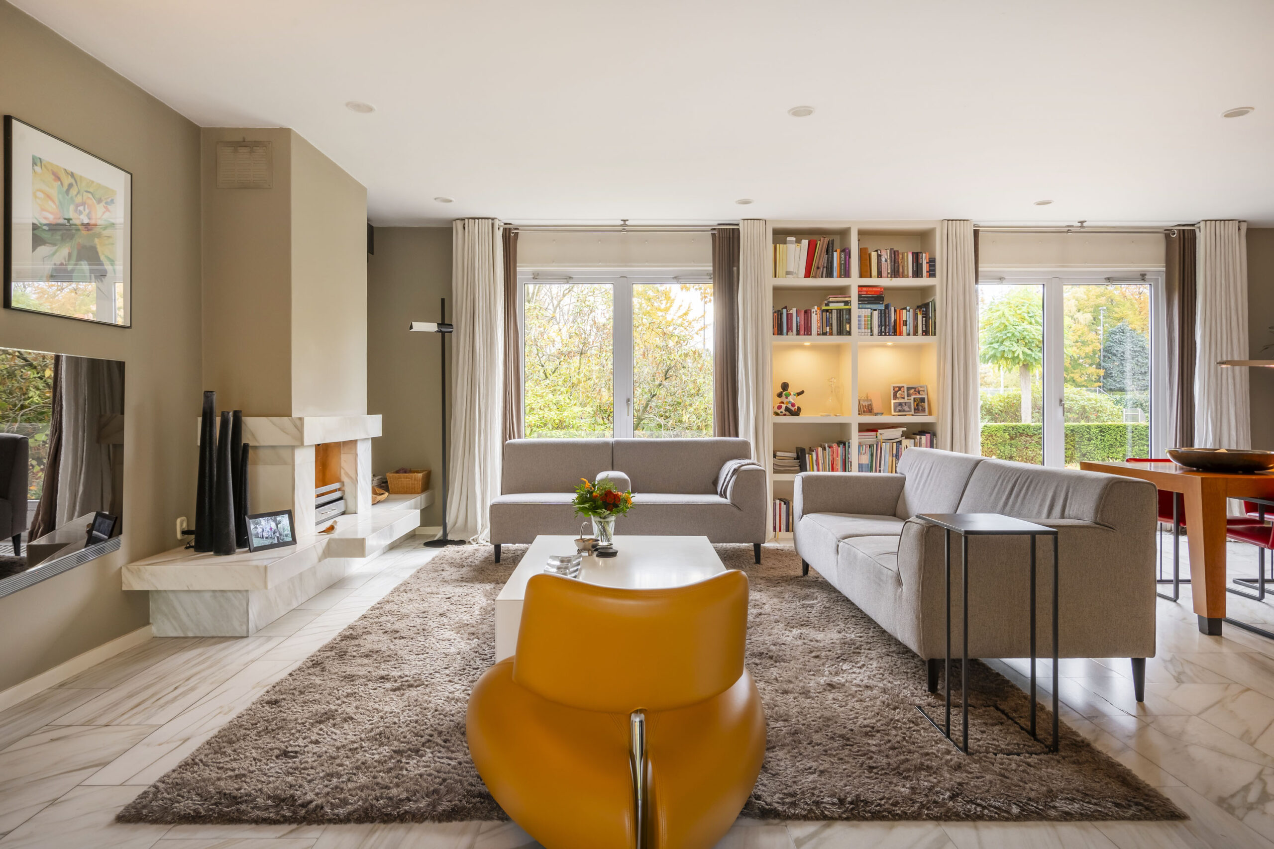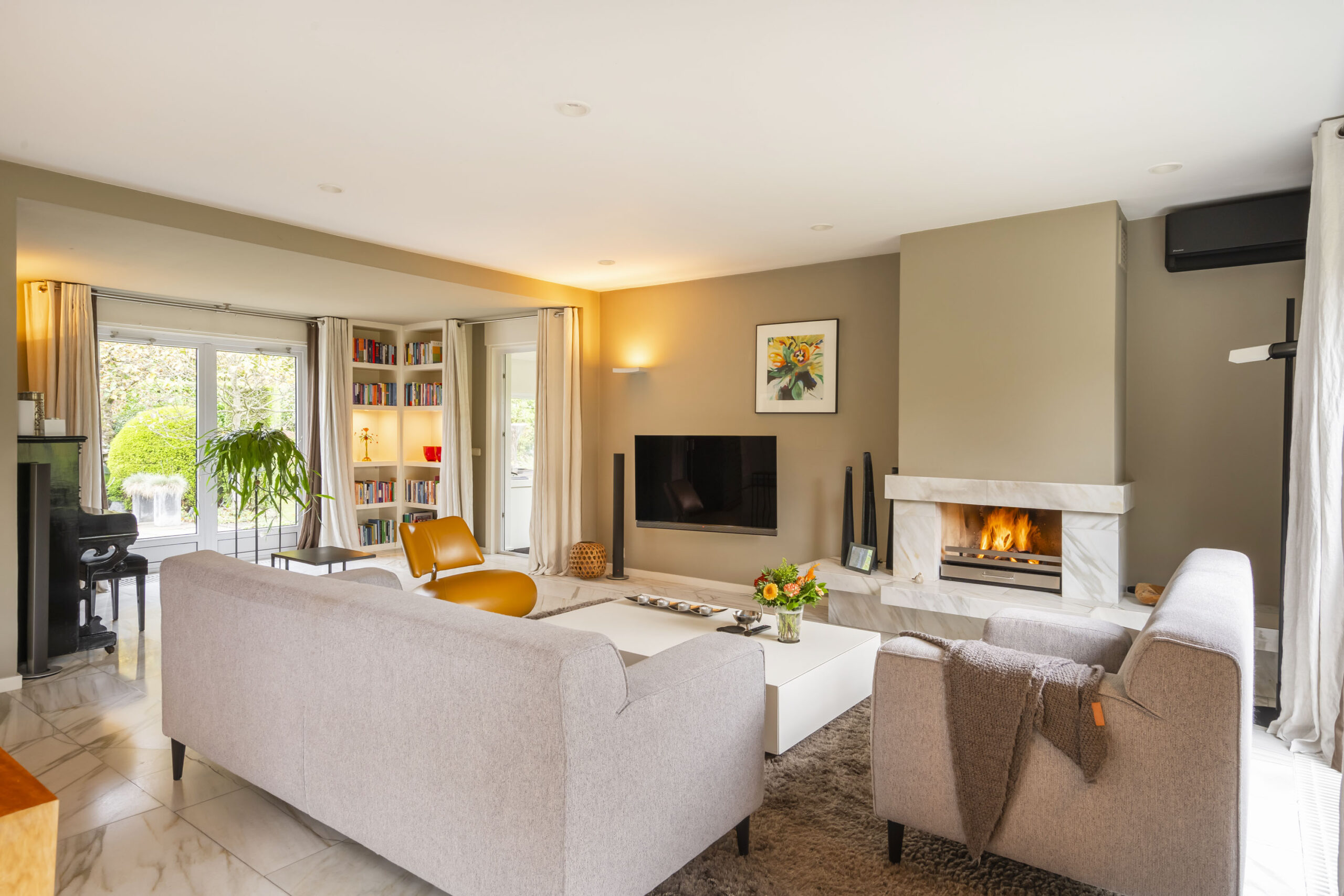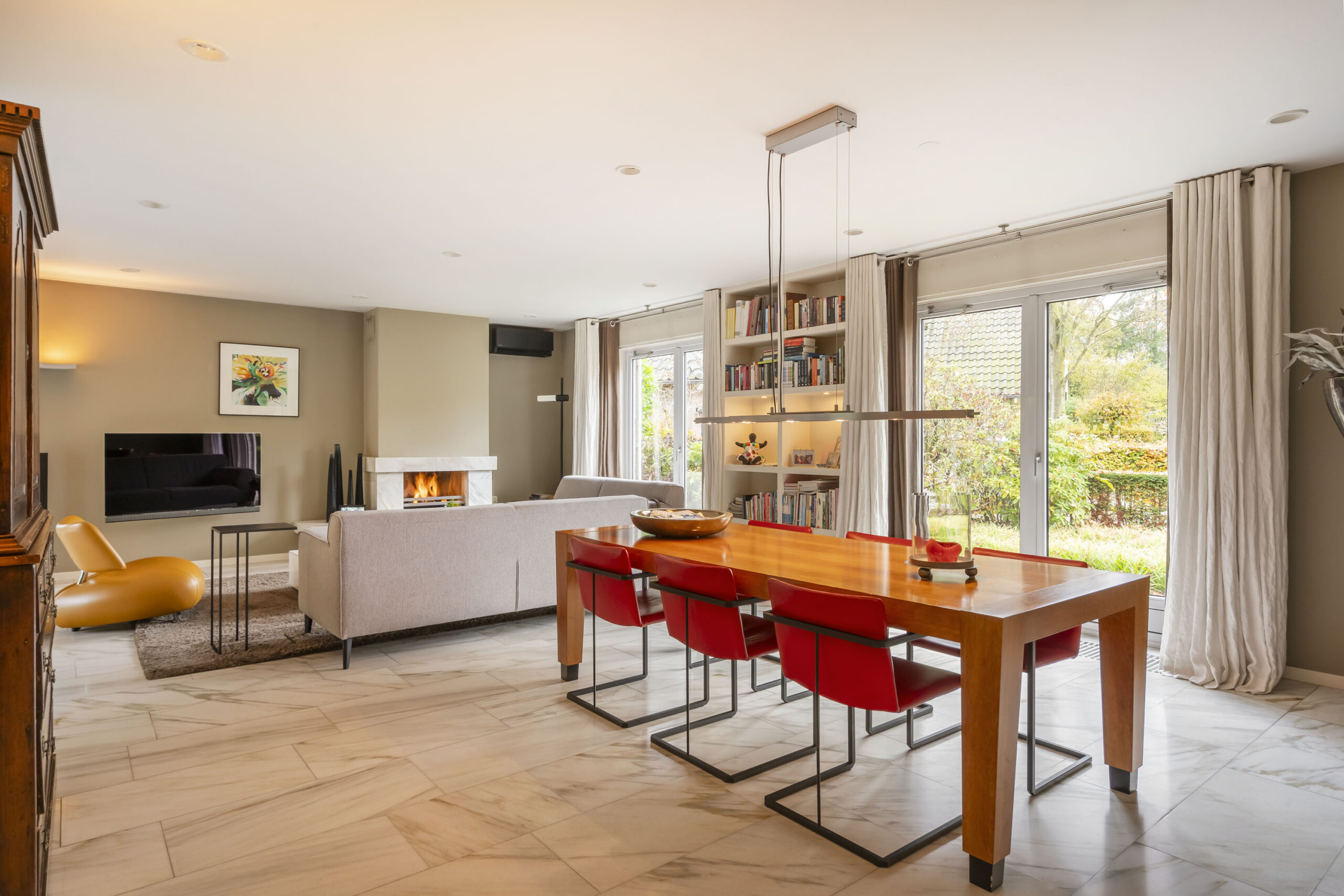 De woonkamer is een prettige leefruimte met veel lichtinval, mede dankzij de drie dubbele openslaande deuren, een marmeren vloer, gashaard en vaste kasten. De afwerking is verzorgd met strak stucwerk op wanden en plafonds.