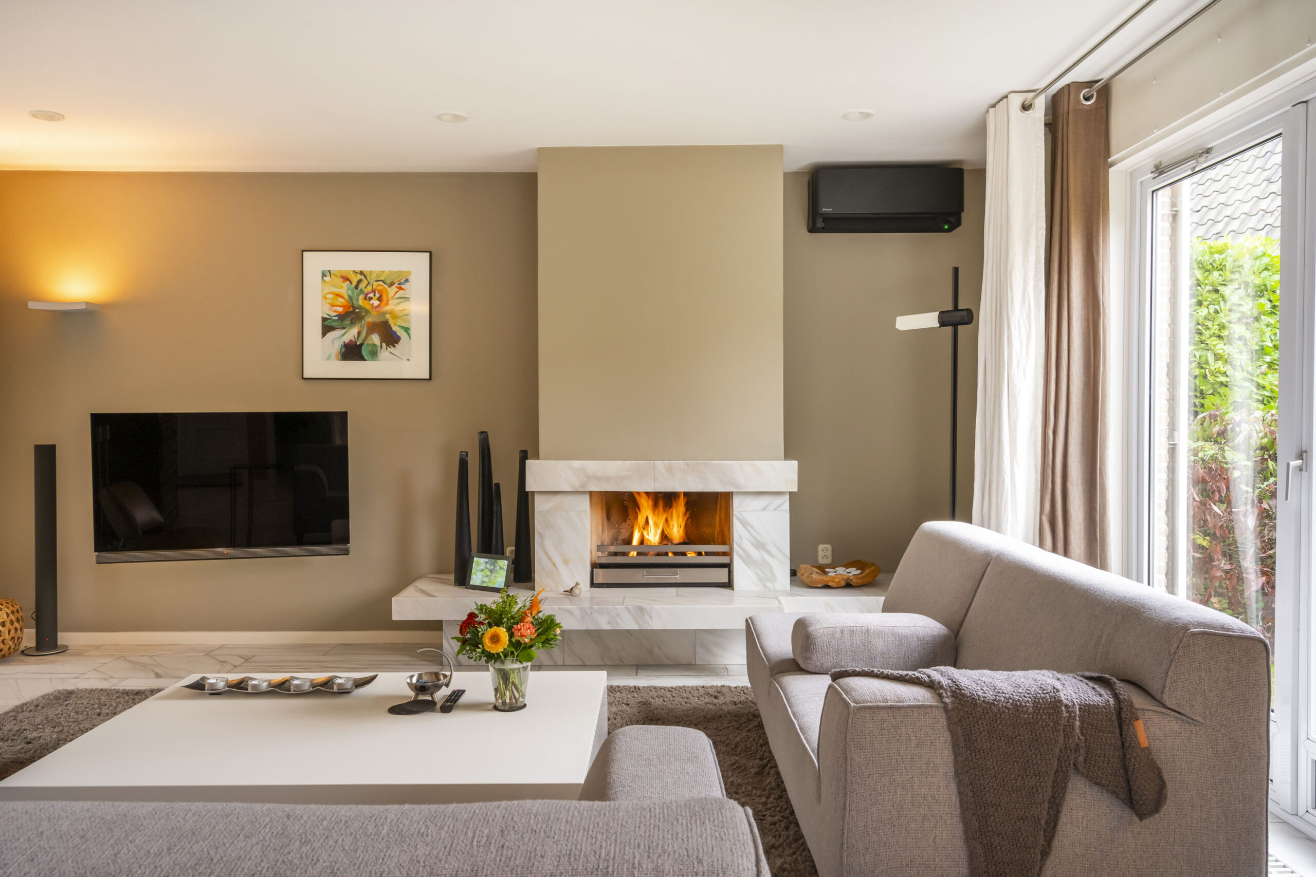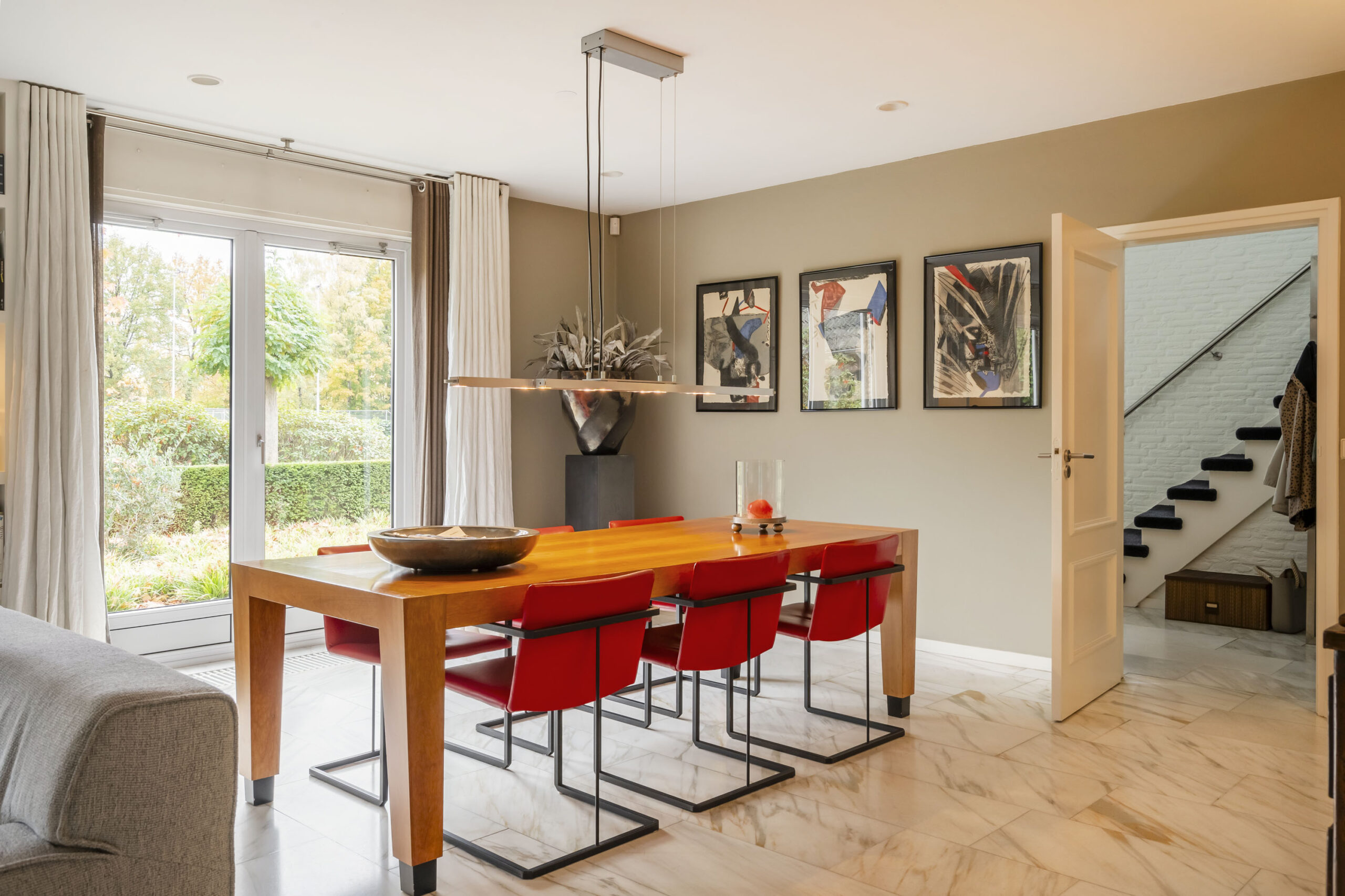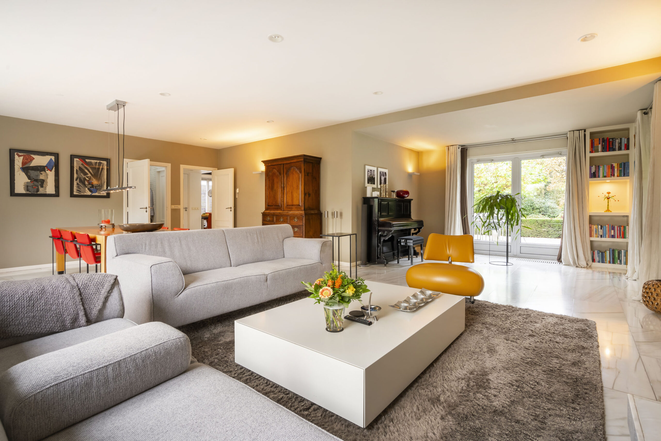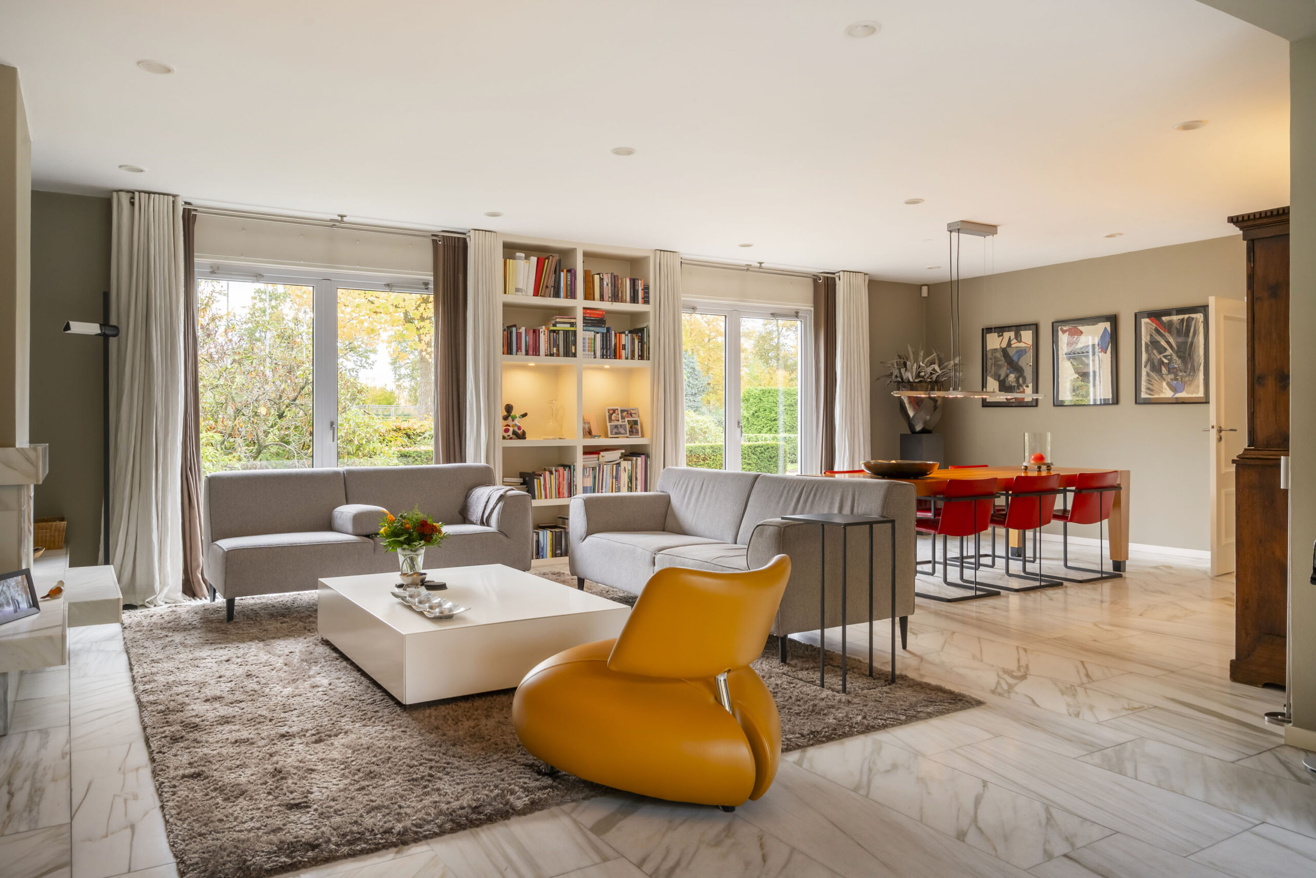 De woonkamer is een prettige leefruimte met veel lichtinval, mede dankzij de drie dubbele openslaande deuren, een marmeren vloer, gashaard en vaste kasten. De afwerking is verzorgd met strak stucwerk op wanden en plafonds.
