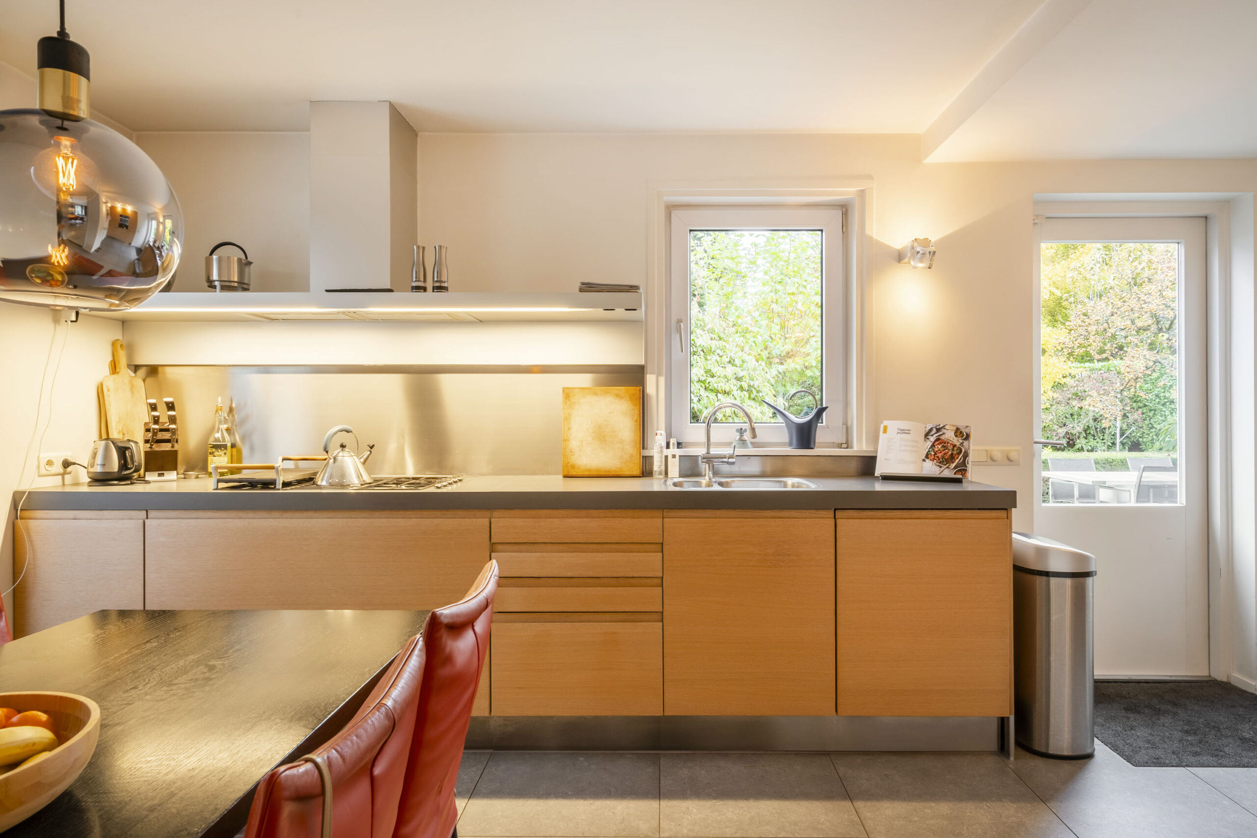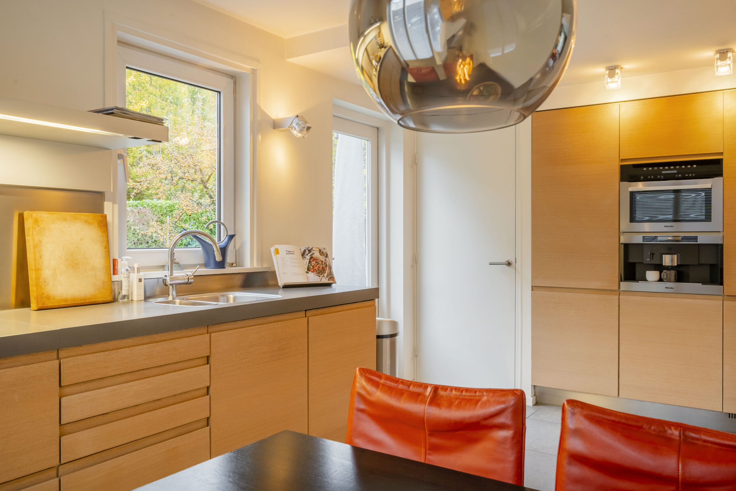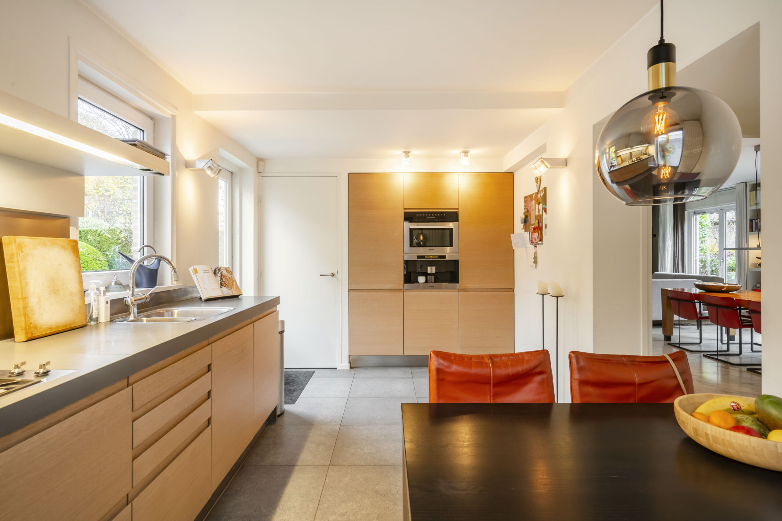 De keuken ligt aan de achterzijde en is compleet uitgevoerd met 5-pits gasfornuis, vaatwasser en combi-oven (2024), RVS-afzuigschouw, koelkast, vriezer en ingebouwd koffiezetapparaat. Alle apparatuur is van Miele. De vloer is voorzien van tegels met vloerverwarming en de wanden en plafonds zijn strak gestuct.