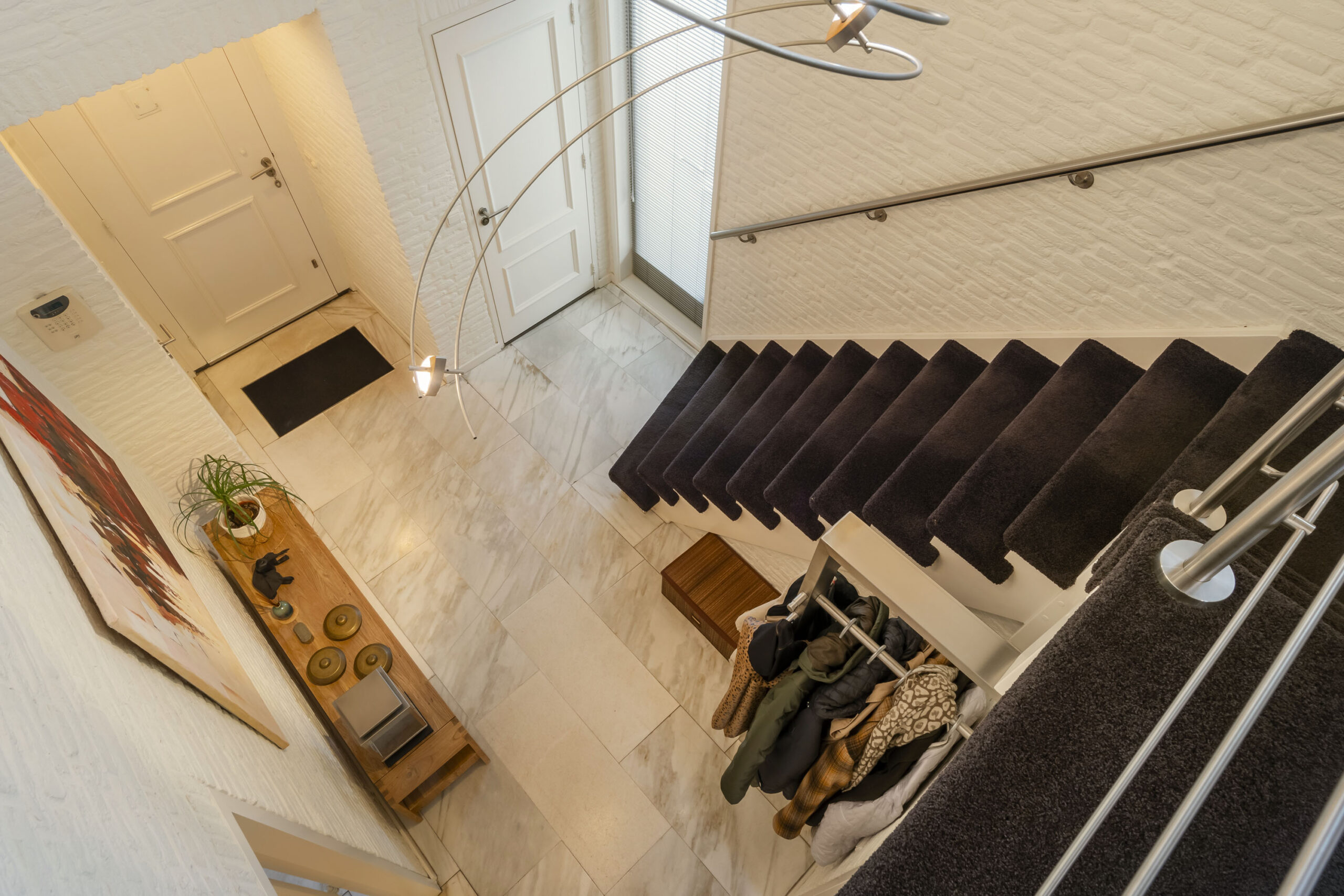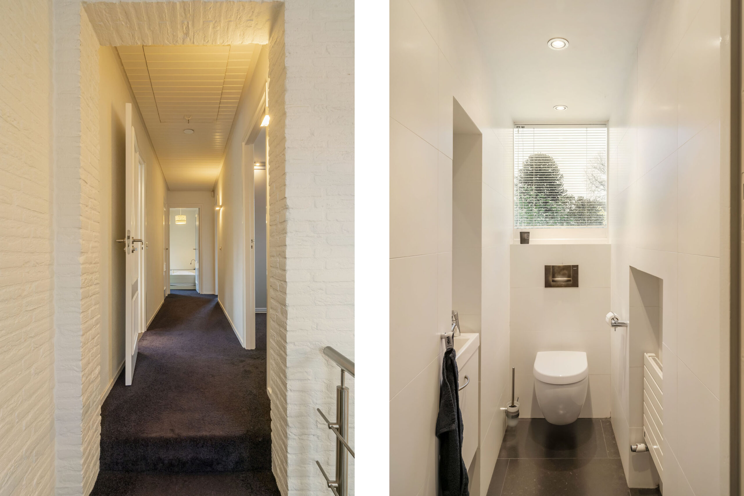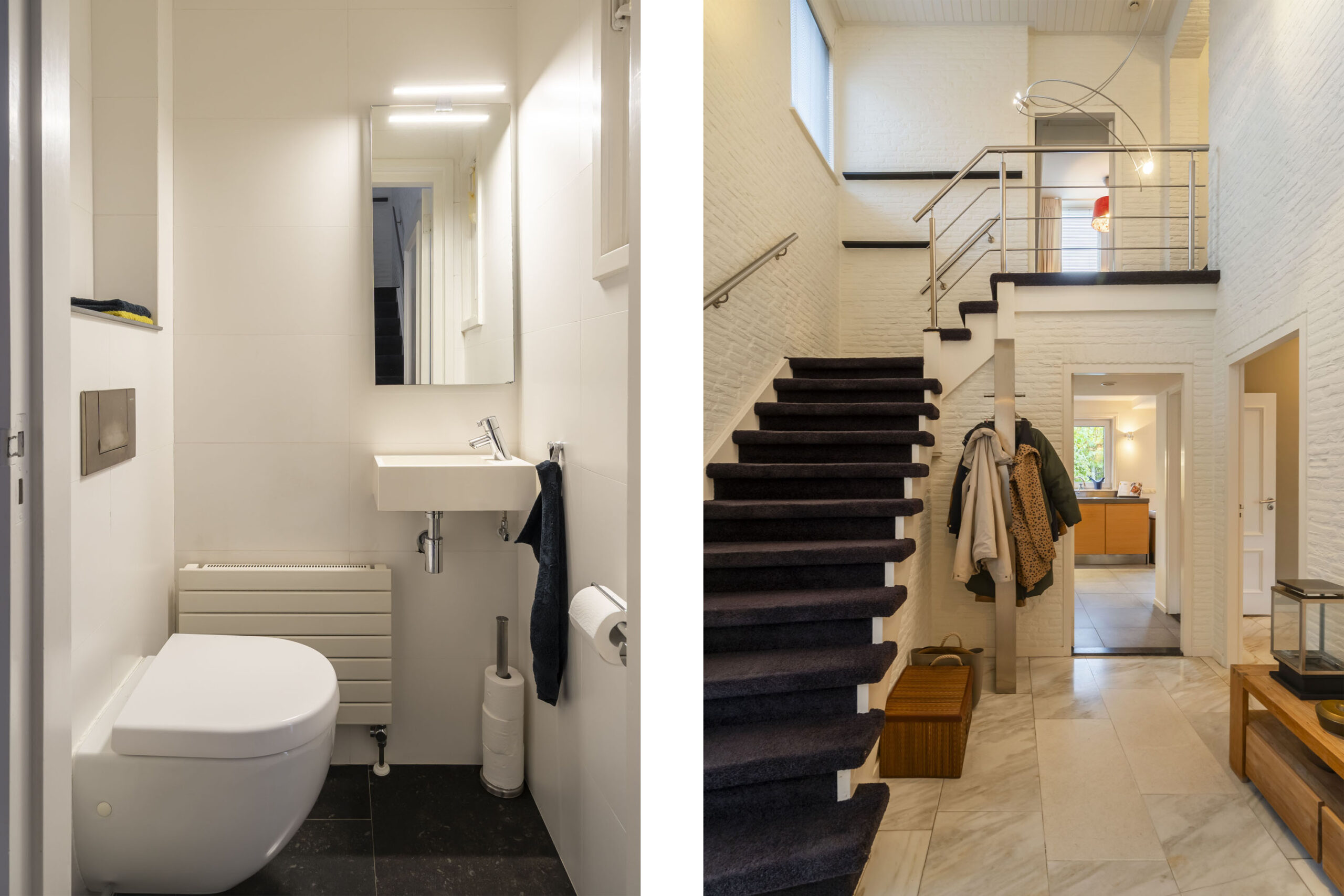 Ruime entree met vide, meterkast en toilet met fontein en strak tegelwerk. Vanuit de hal toegang tot de keuken, woonkamer en de trapopgang naar de eerste verdieping.
