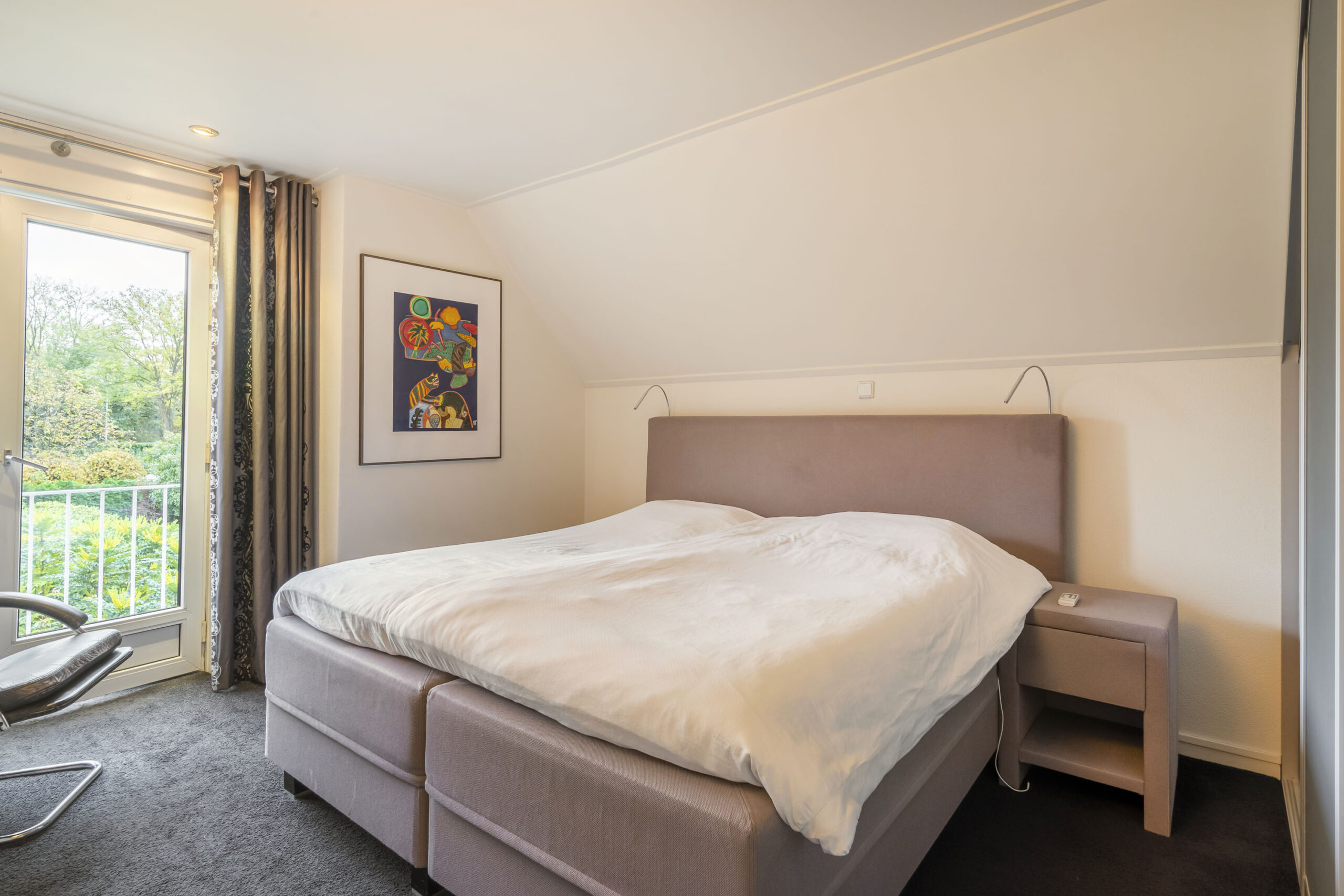 De hoofdslaapkamer beschikt over een Frans balkon met uitzicht op de tuin, vaste kast, tapijtvloer, wanden met fijne korrel en een plafond met strak stucwerk.