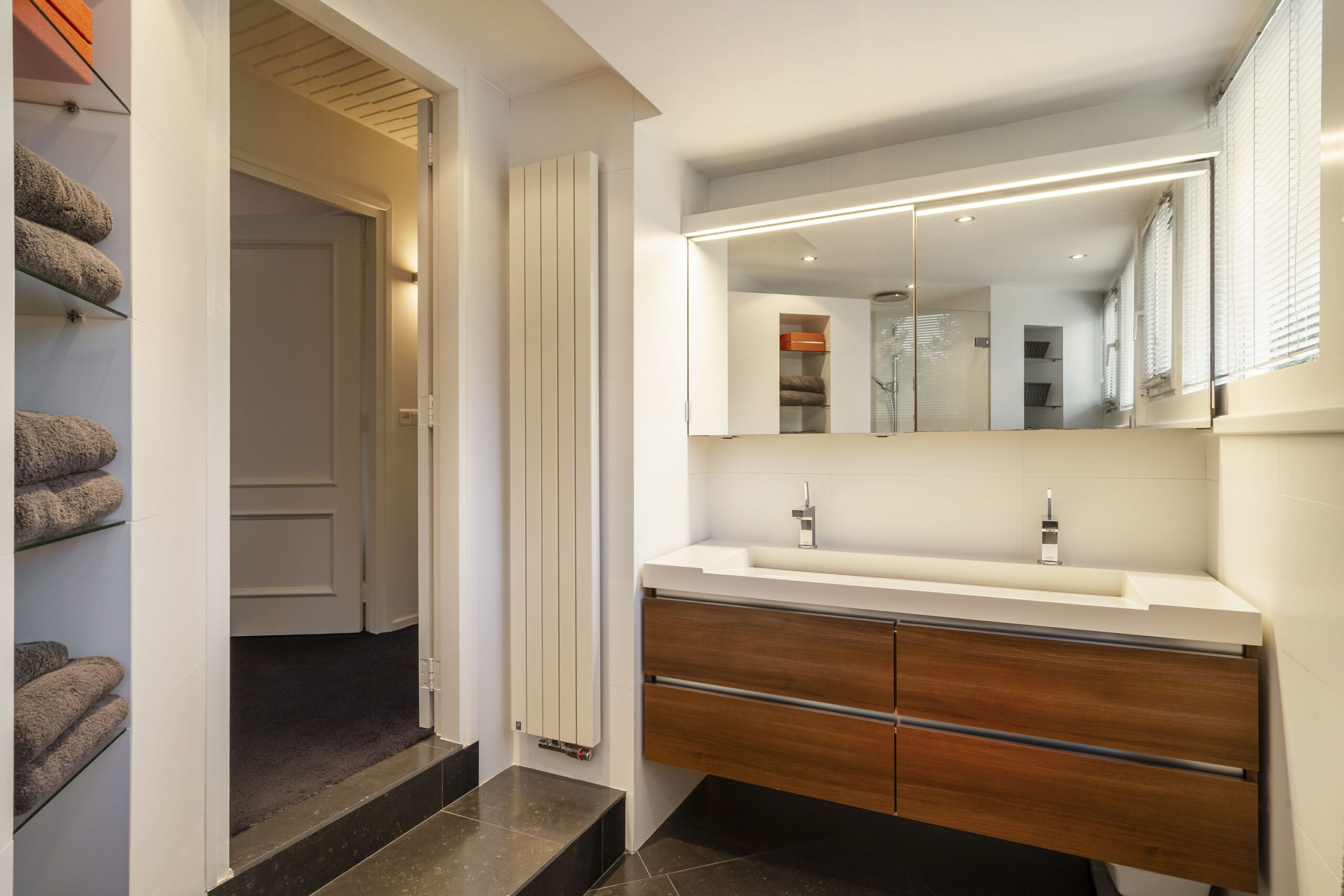 De badkamer aan de achterzijde is modern uitgevoerd met dubbel wastafelmeubel, inloopdouche, praktische bergvakken, dakkapel en elektrische vloerverwarming.
