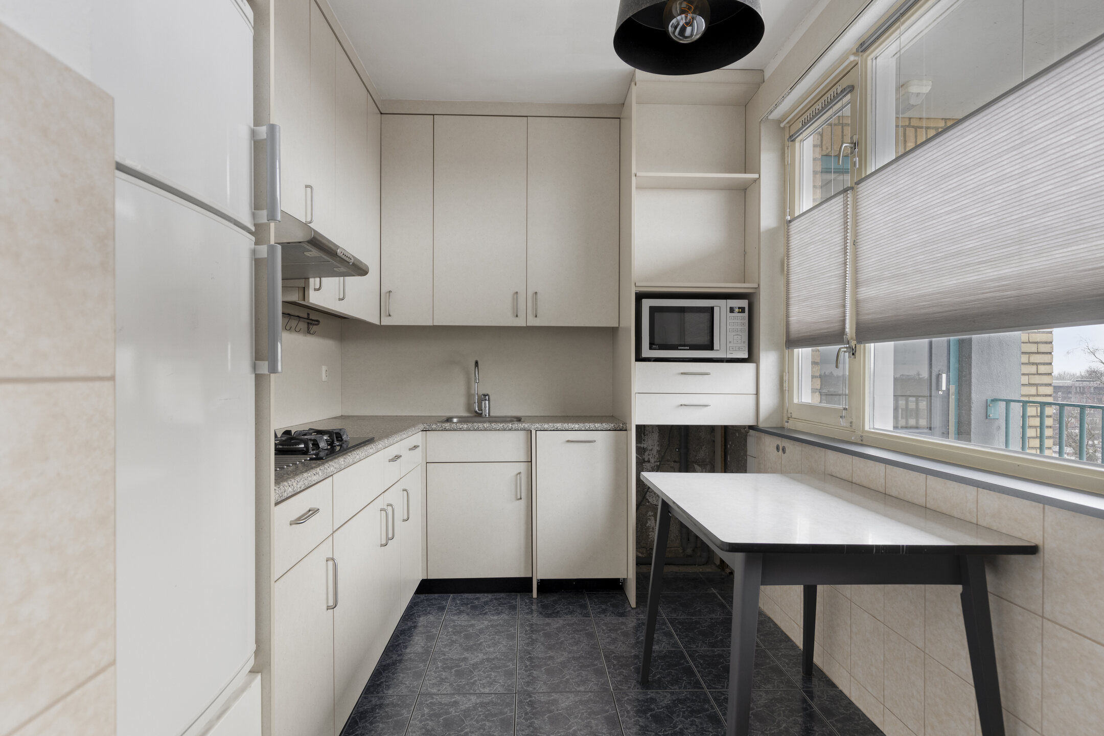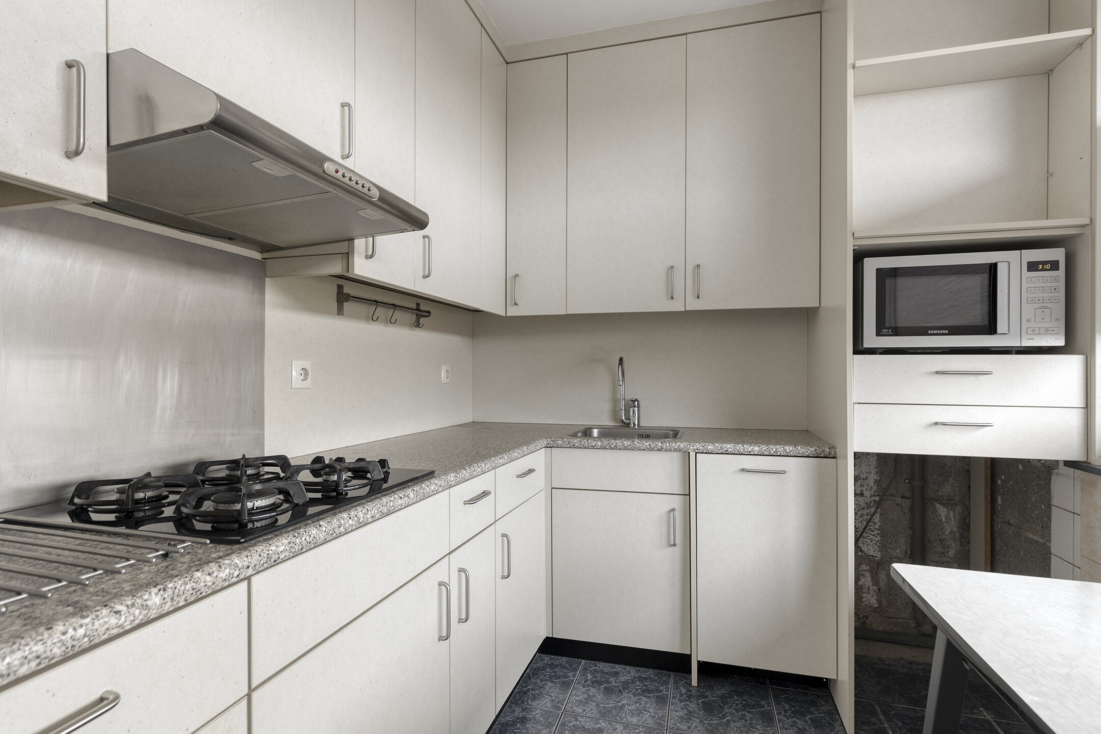 De woonkamer is modern afgewerkt en voorzien van airco-installatie. Vanuit hier heeft u toegang tot het balkon, waar u fijn buiten kunt zitten. De keuken, gelegen aan de galerij-zijde, is uitgerust met een koelkast met vriesvak, magnetron, 4-pits gaskookplaat, afzuigkap, mini vaatwasser en de elektrische boiler voor het warm water.