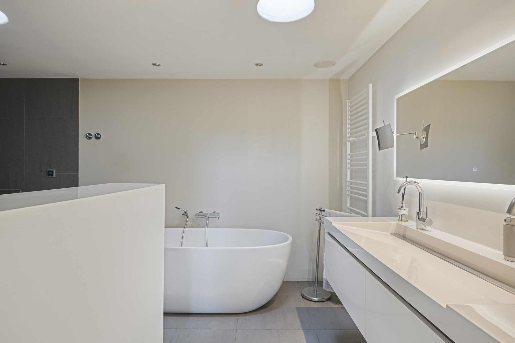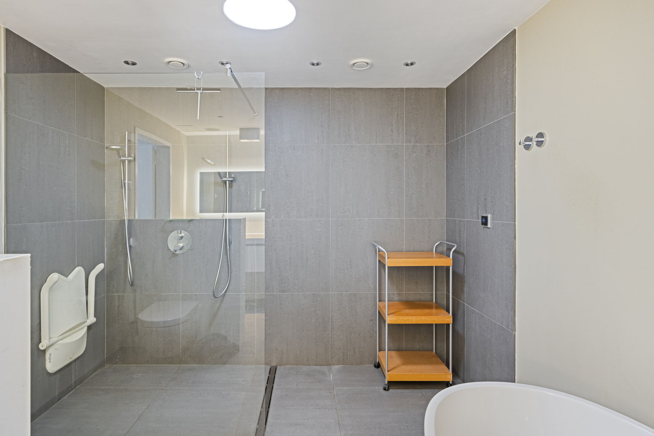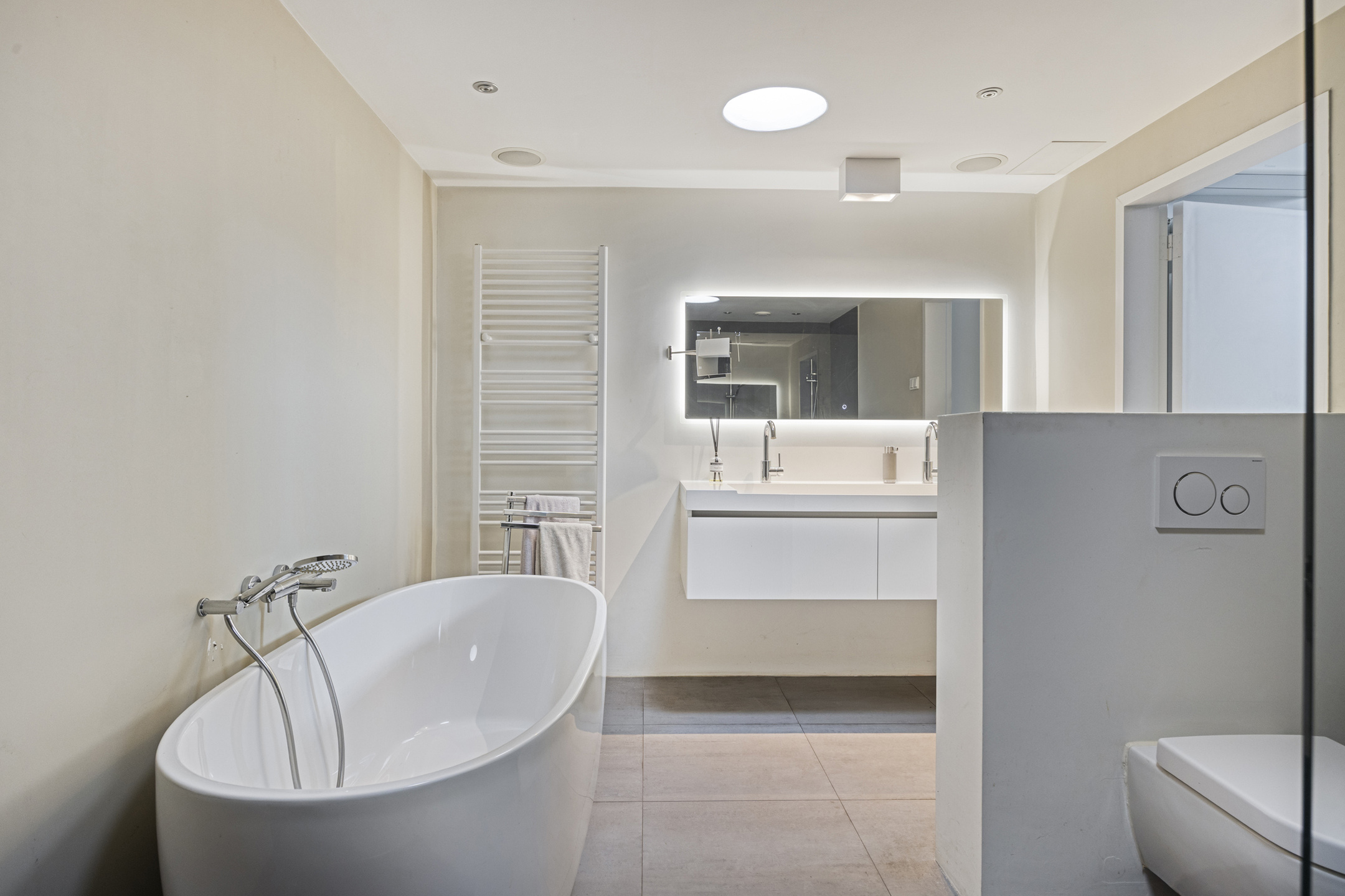 Centraal in de woning bevindt zich de master bedroom, een comfortabele en rustige ruimte voorzien van airconditioning en een ruime inloopkast. De aangrenzende badkamer is modern en compleet uitgevoerd met een wastafelmeubel, ligbad, inloopdouche en toilet. Vloerverwarming zorgt hier voor extra comfort.
