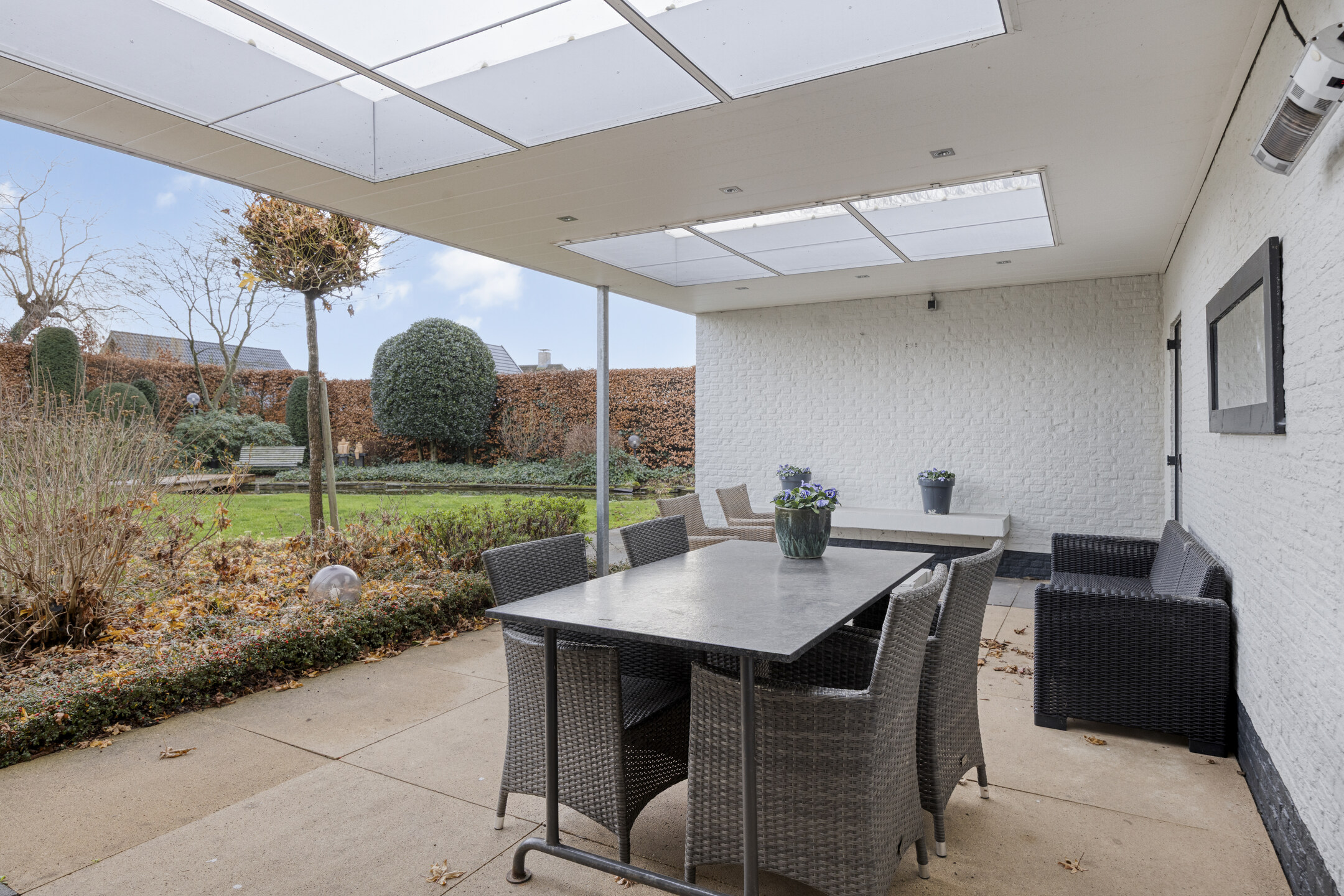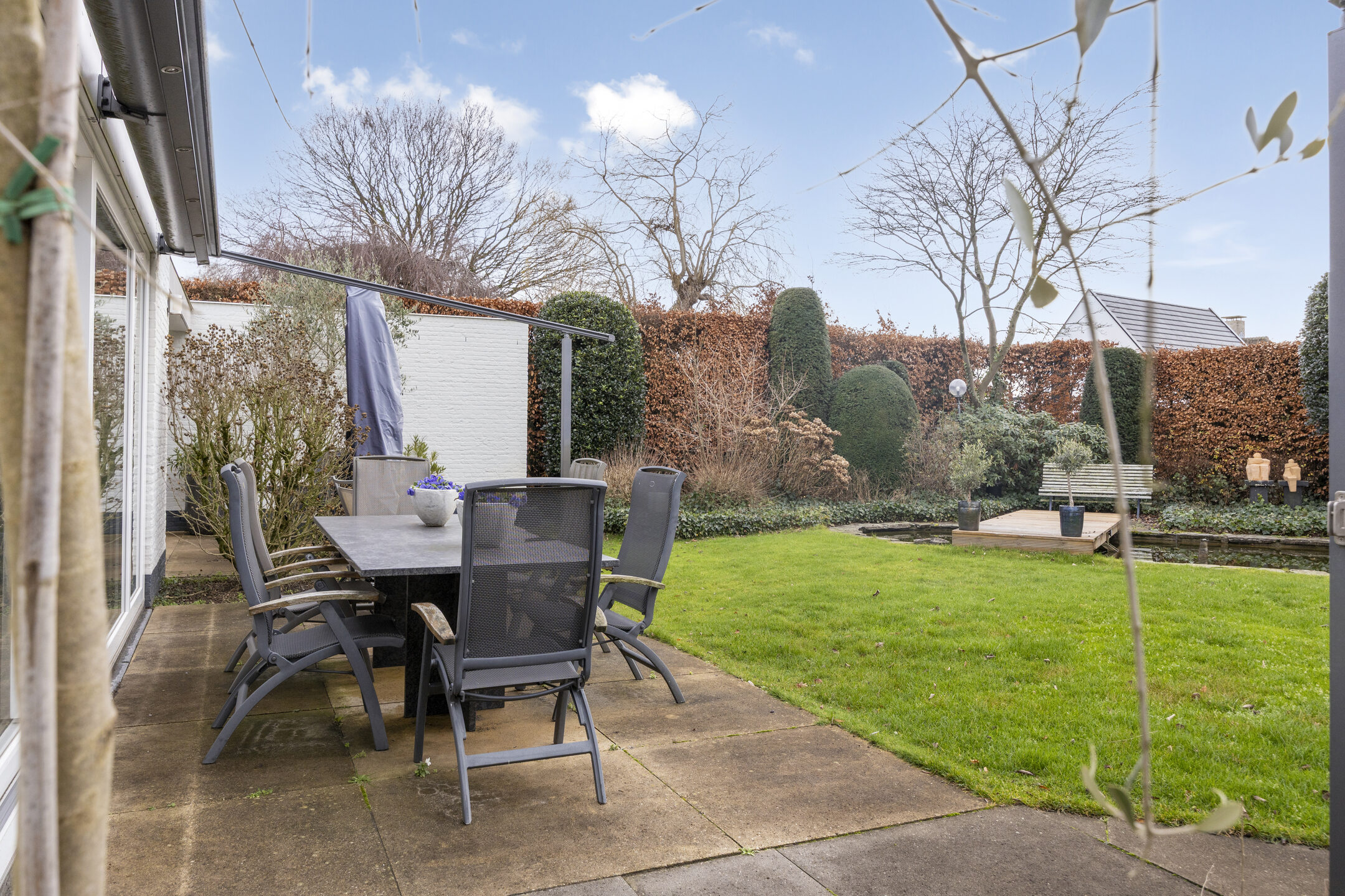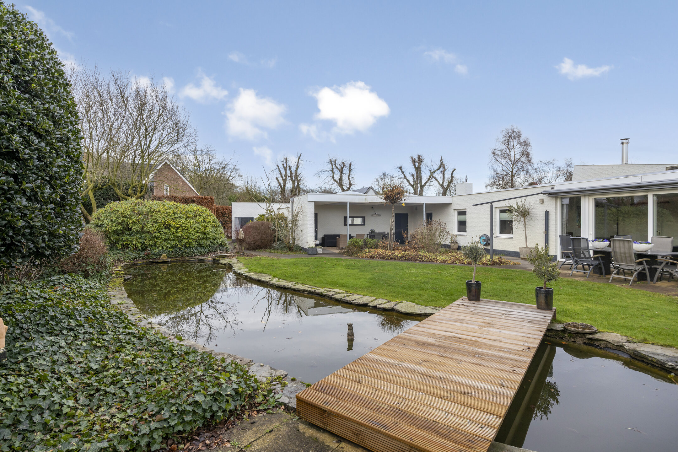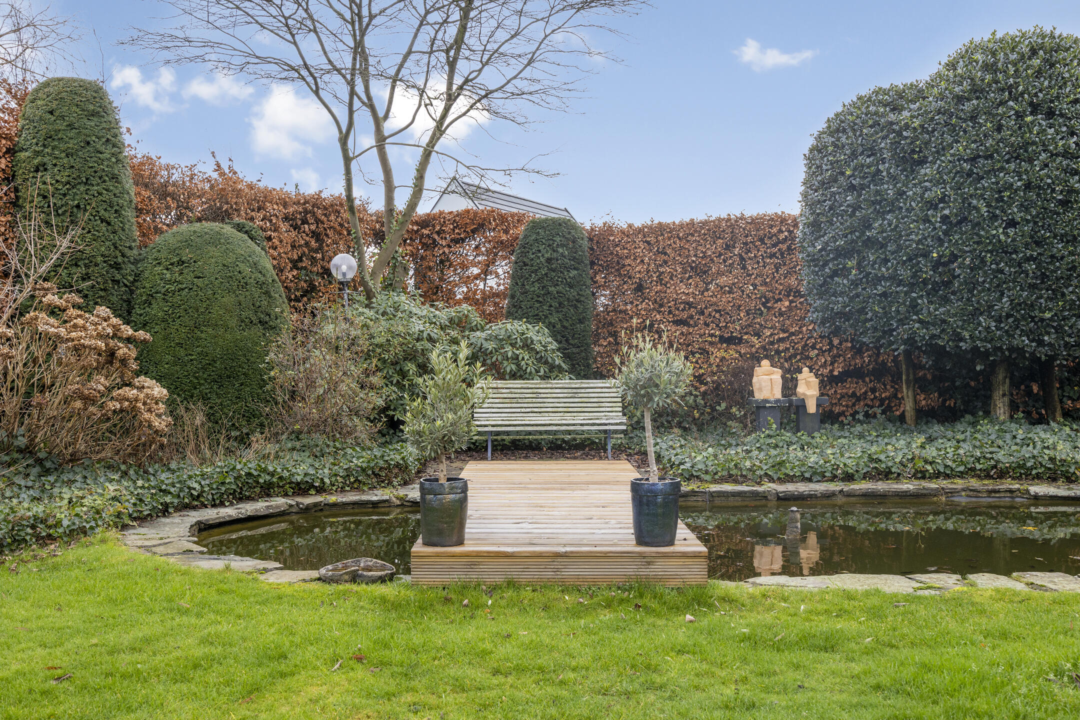 De achtertuin is een oase van rust en privacy. De tuin is zonnig gelegen en fraai ingericht met een combinatie van bestrating en gazon. De sfeervolle veranda nodigt uit tot lange zomeravonden, terwijl de vijver een extra gevoel van kalmte toevoegt. Een plek waar u in alle rust kunt genieten van het buitenleven.