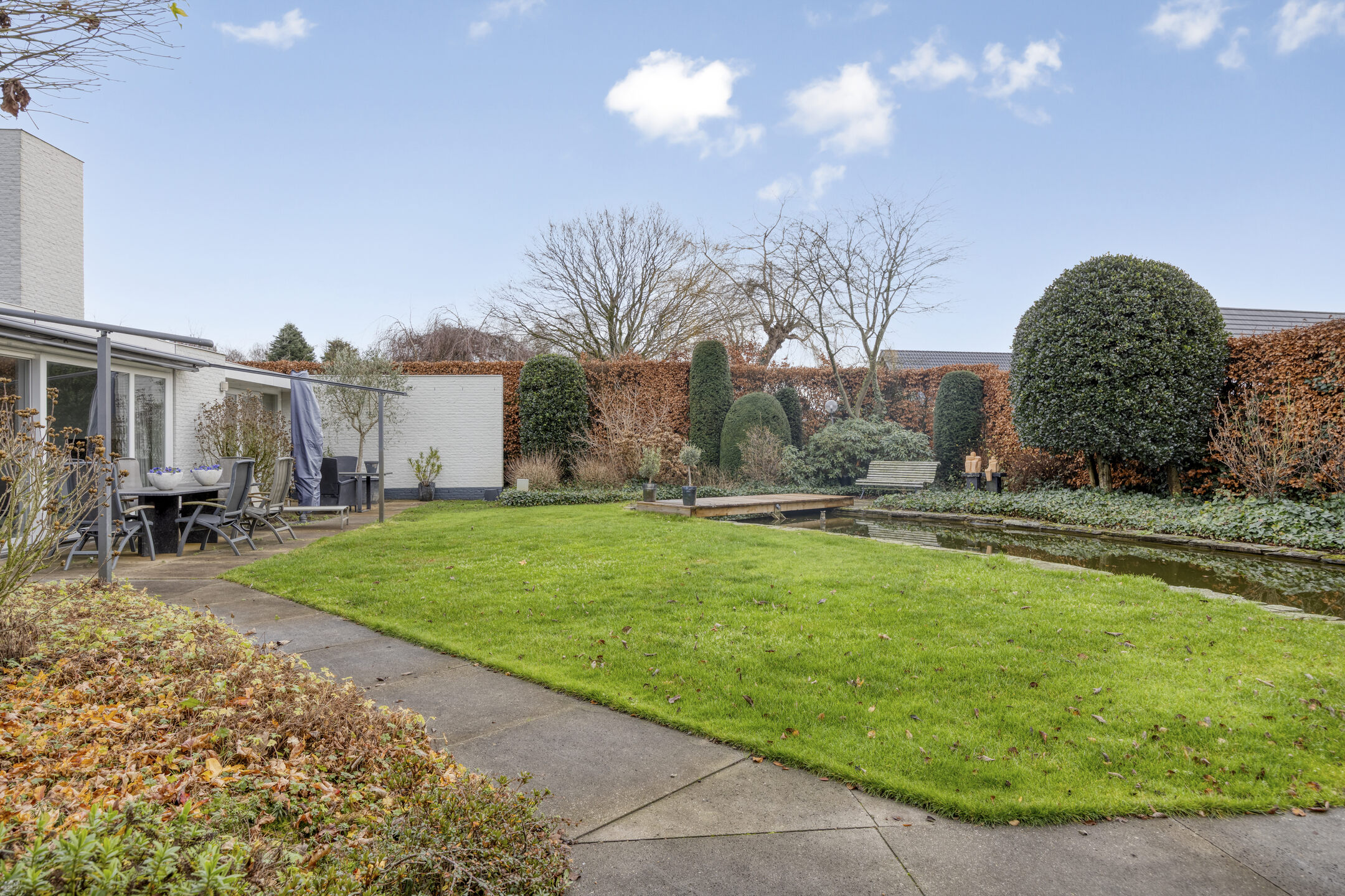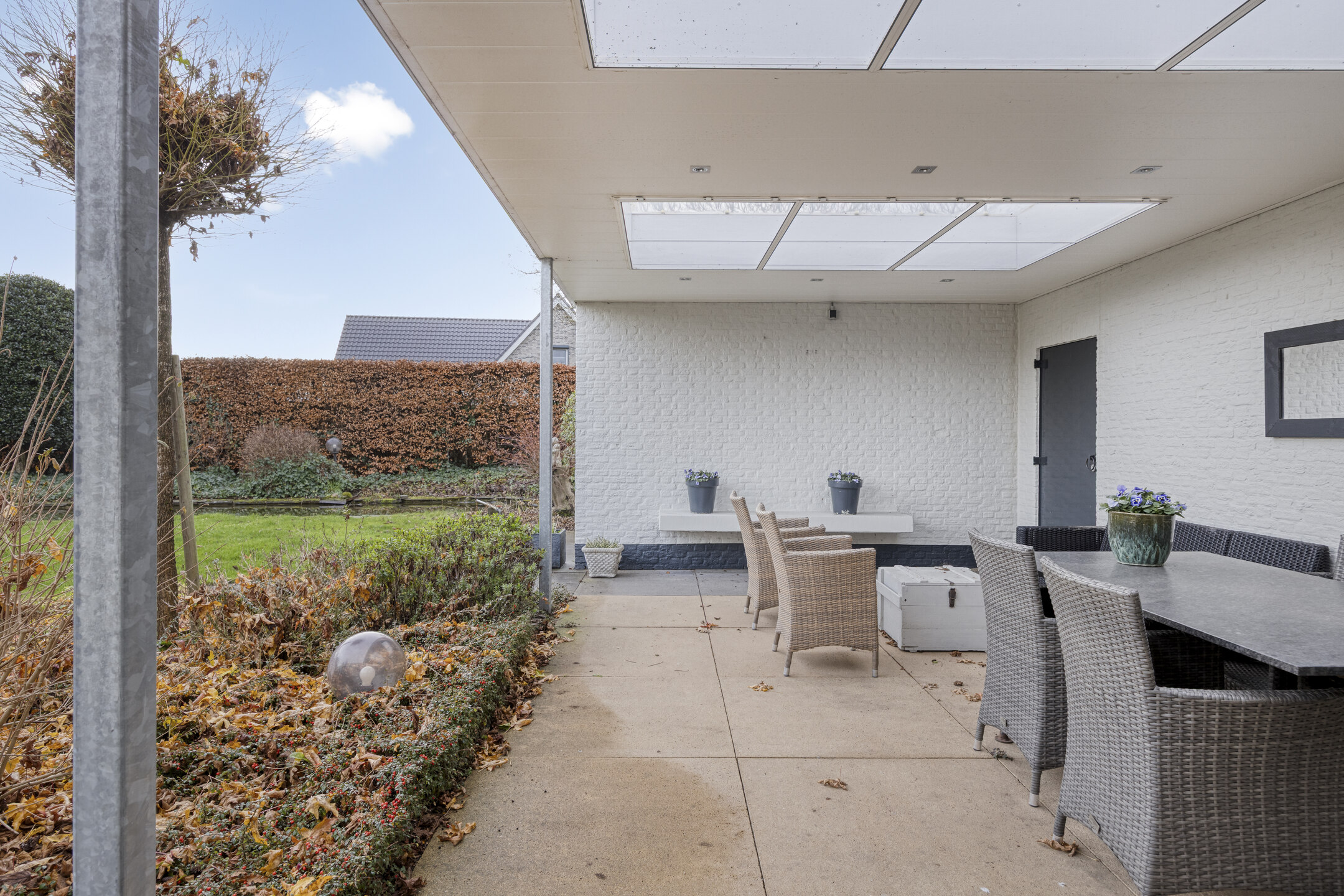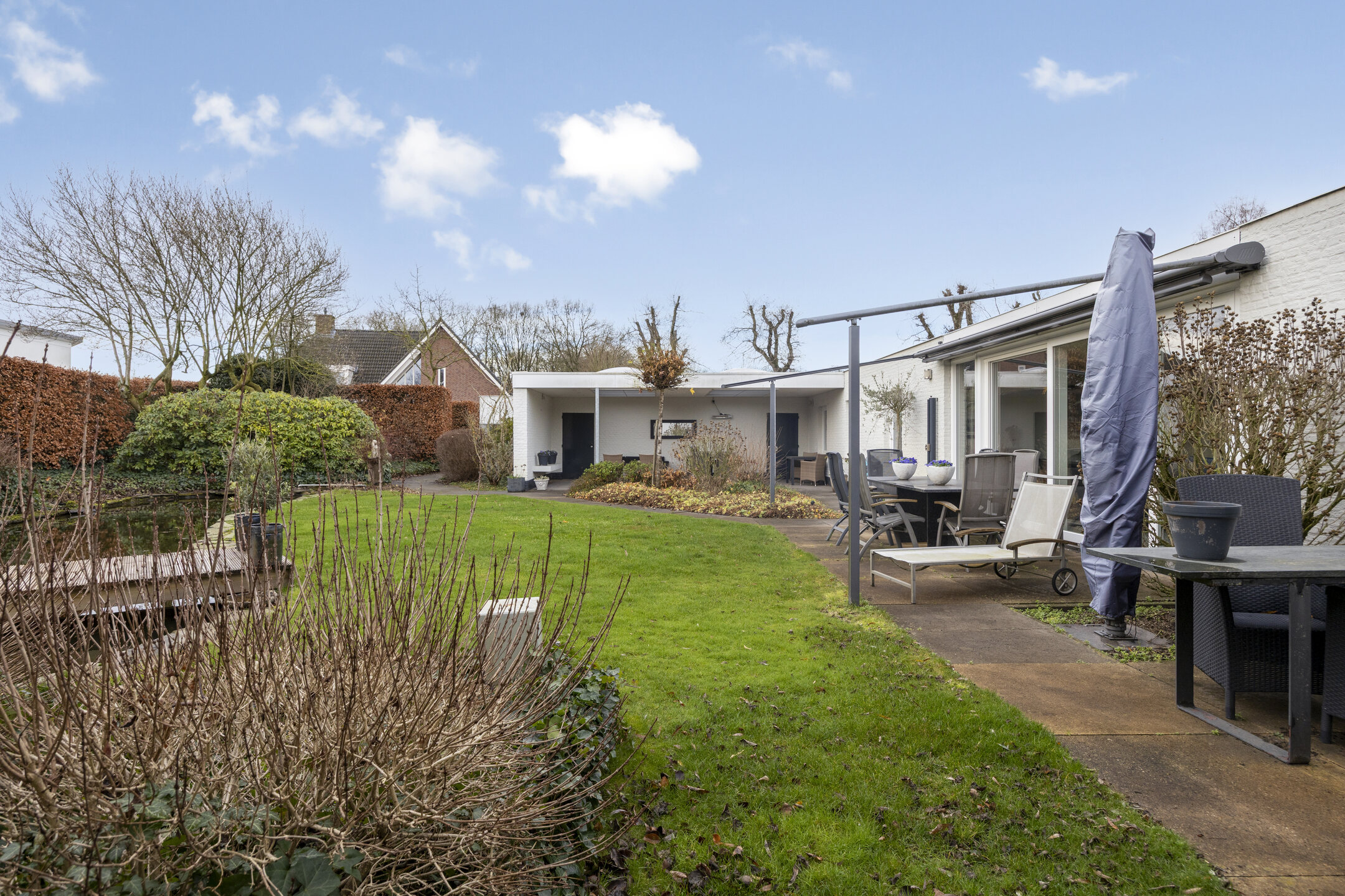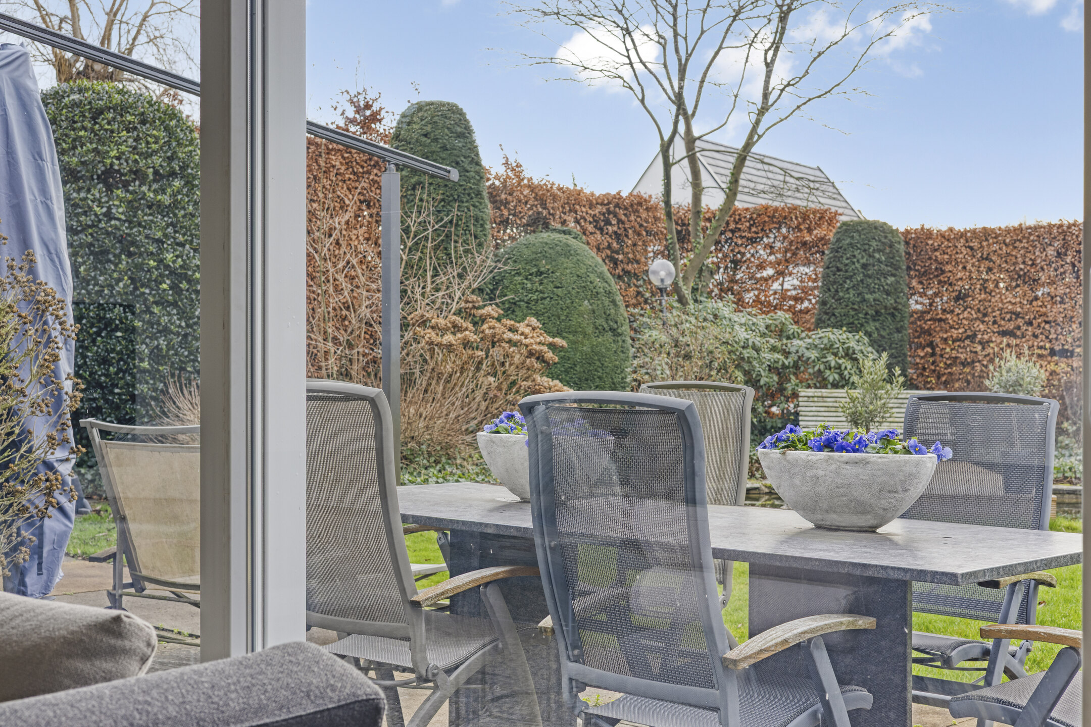 De achtertuin is een oase van rust en privacy. De tuin is zonnig gelegen en fraai ingericht met een combinatie van bestrating en gazon. De sfeervolle veranda nodigt uit tot lange zomeravonden, terwijl de vijver een extra gevoel van kalmte toevoegt. Een plek waar u in alle rust kunt genieten van het buitenleven.