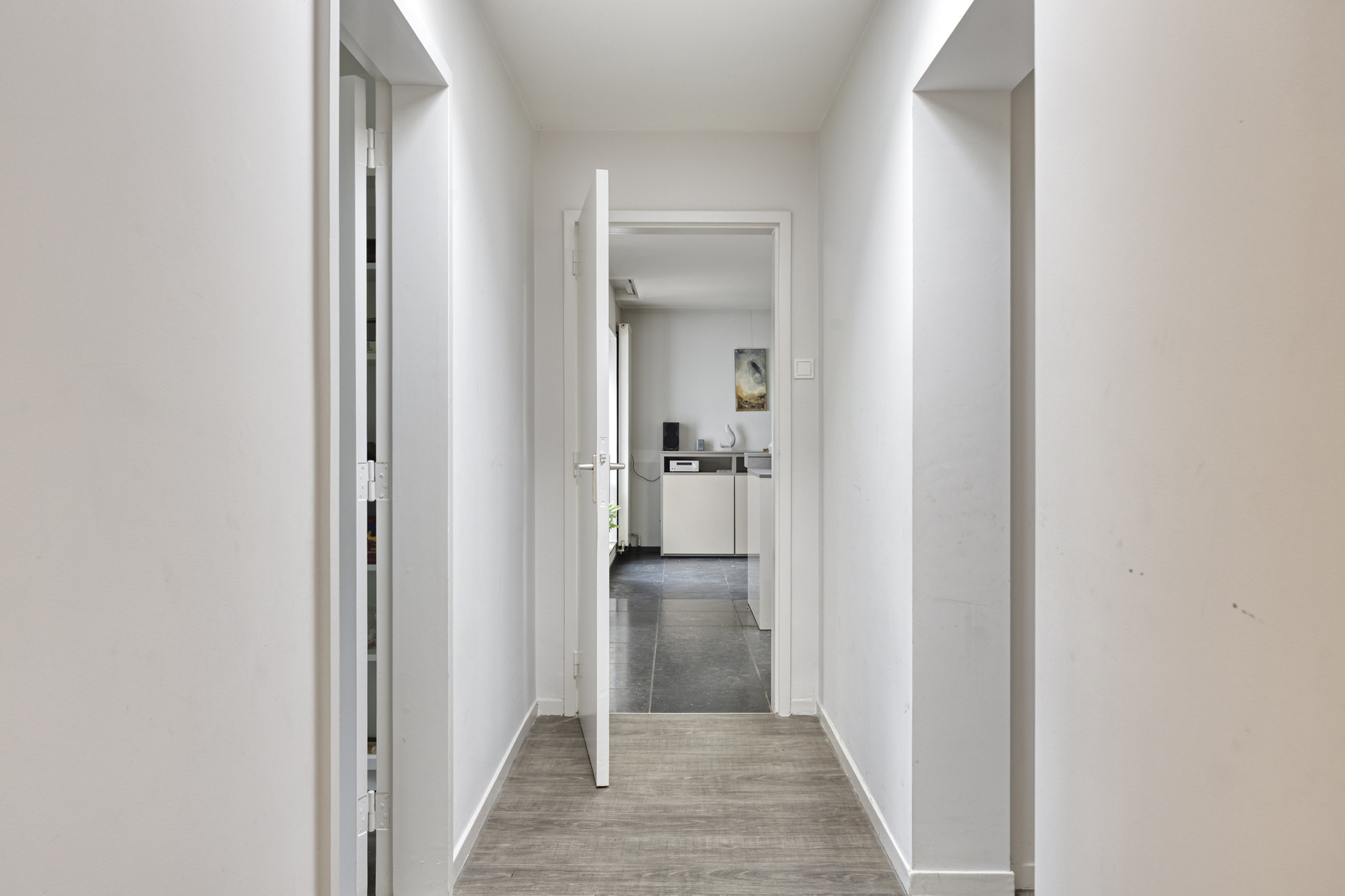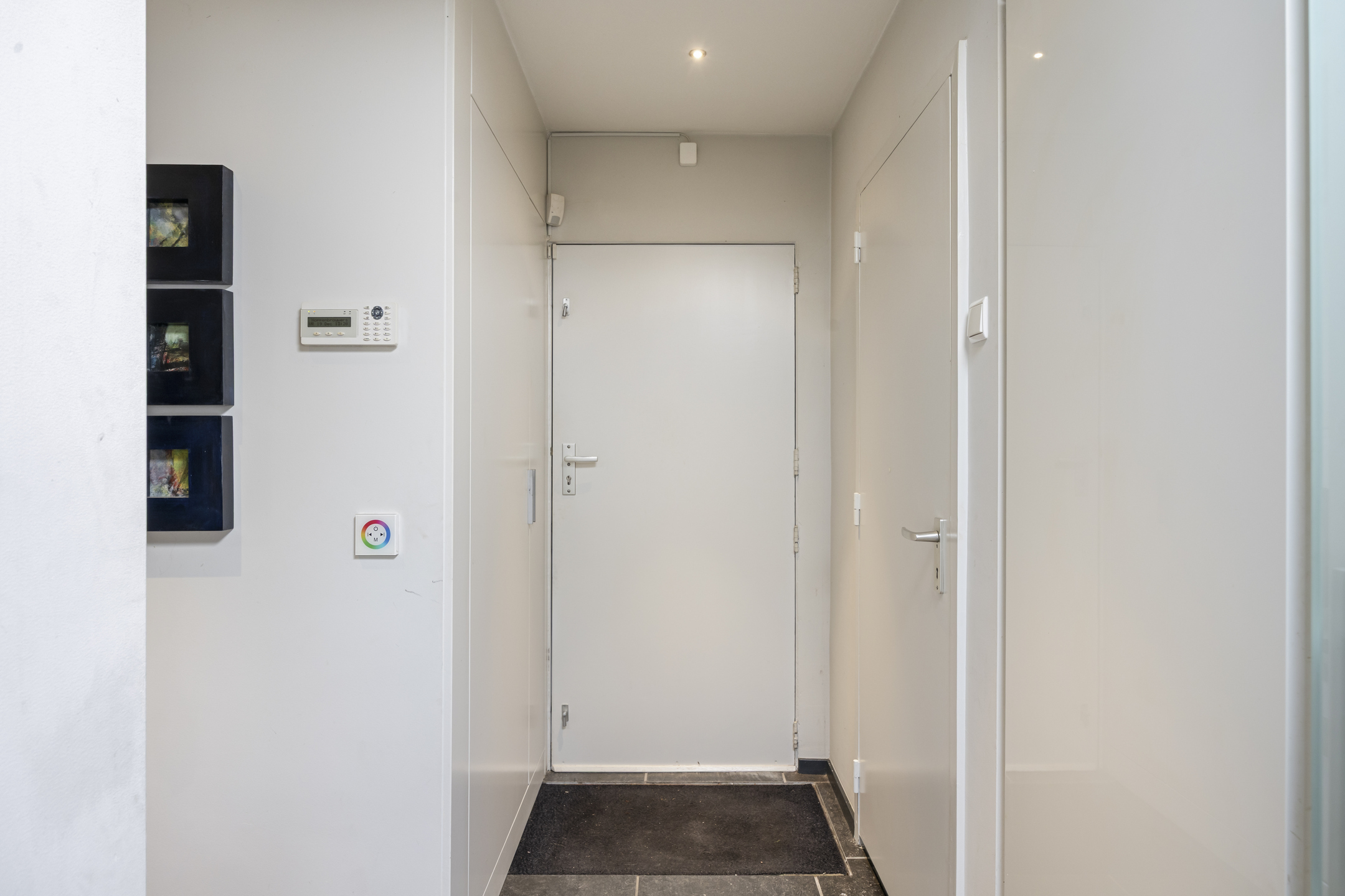 Via de achter entree is de woning eveneens bereikbaar. Deze entree komt uit in een praktische hal met extra kastruimte en garderobe, die direct toegang geeft tot de keuken.