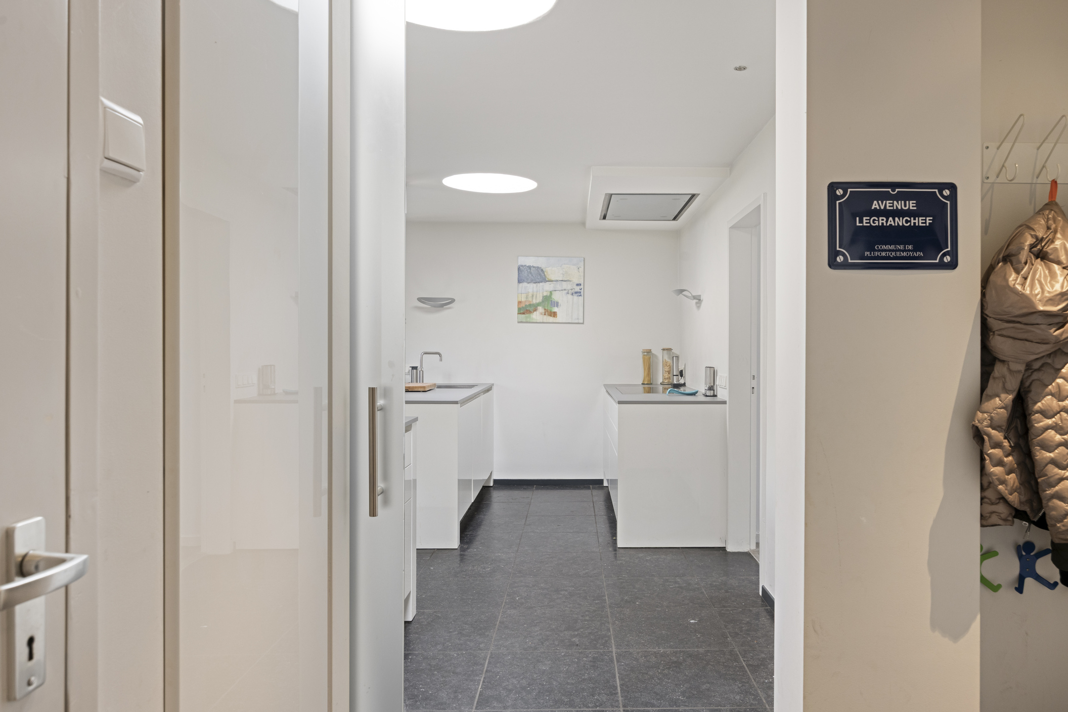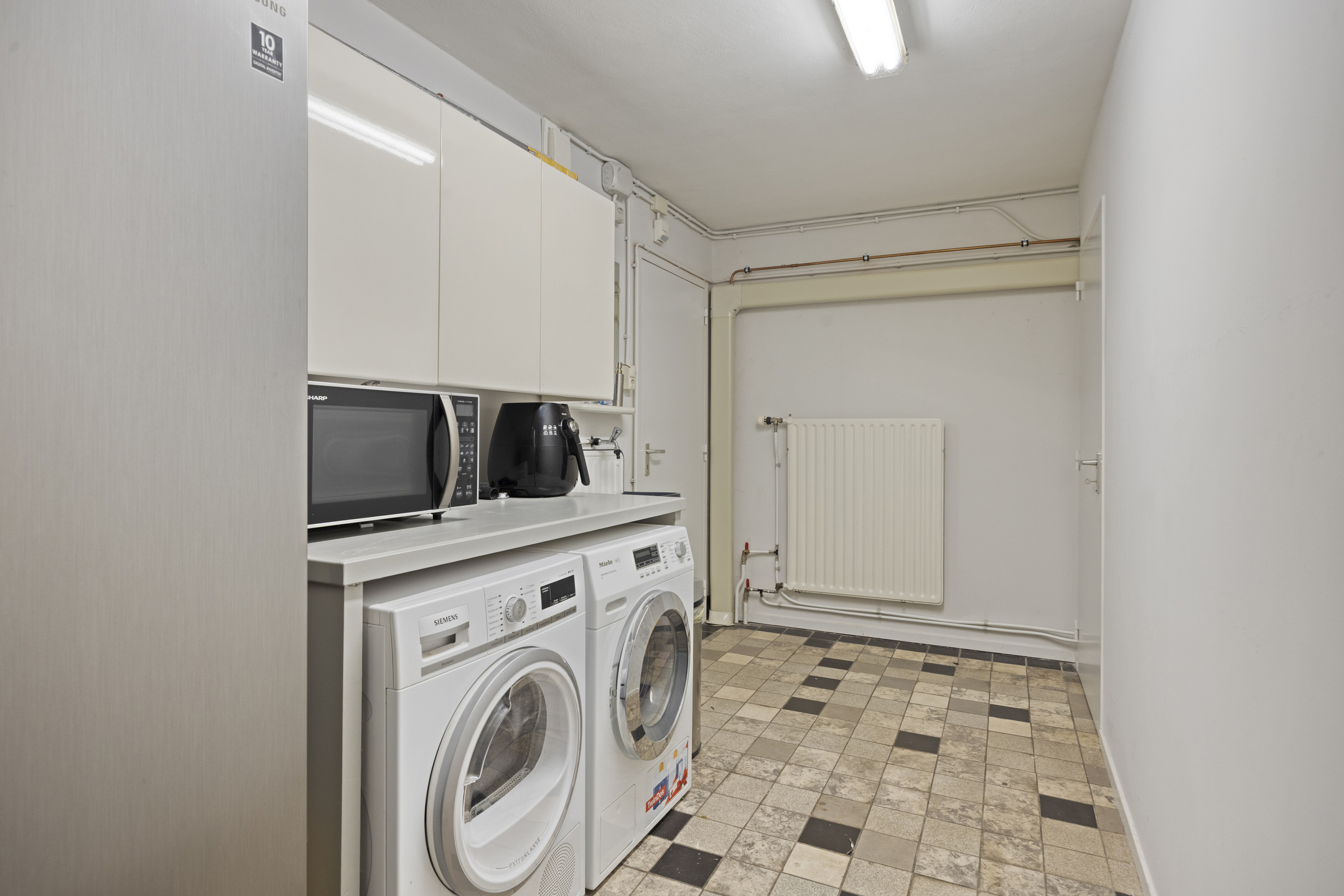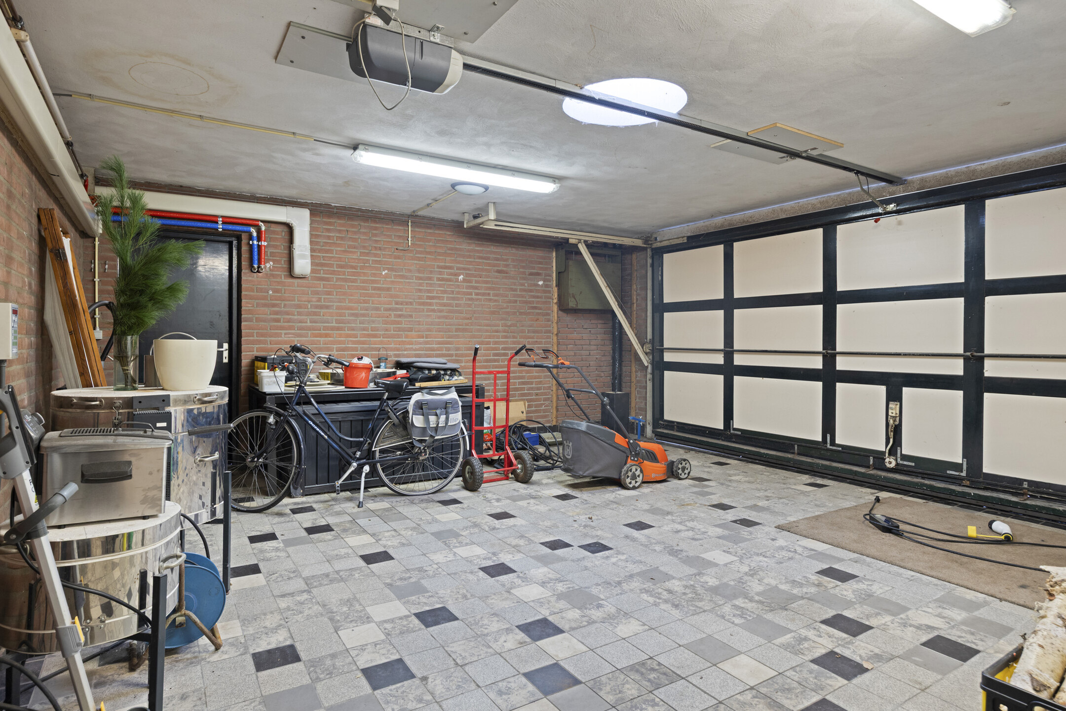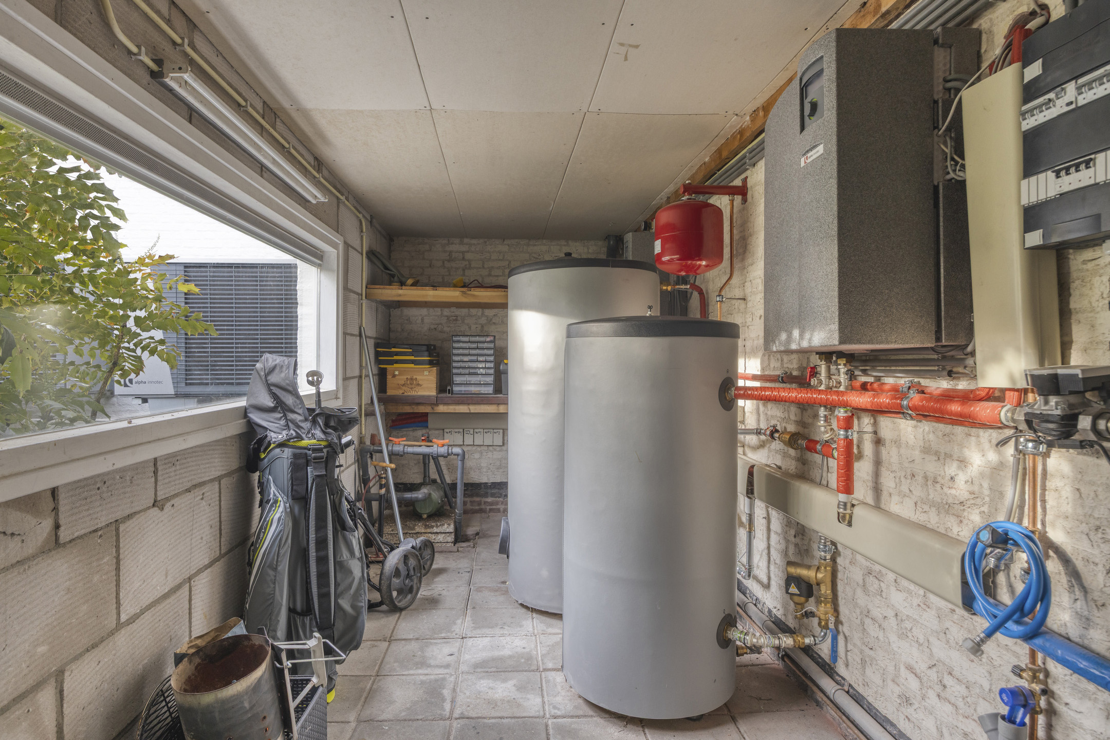 De bijkeuken is uitgerust met een fontein en aansluiting voor de wasmachine en droger. De ruime garage biedt plaats aan twee auto’s en is voorzien van een elektrische deur. Daarnaast is er een inpandige berging waar zich de warmtepomp en grondwaterpomp bevinden.