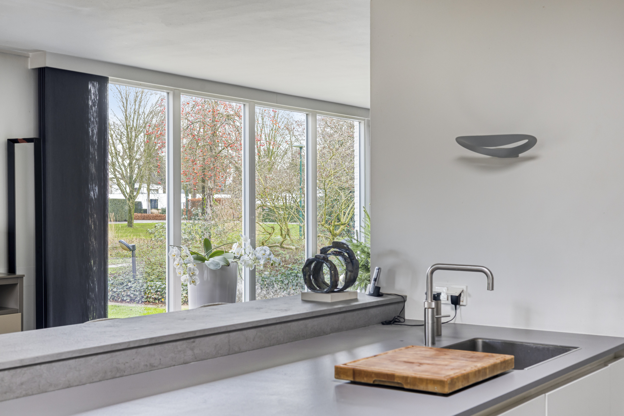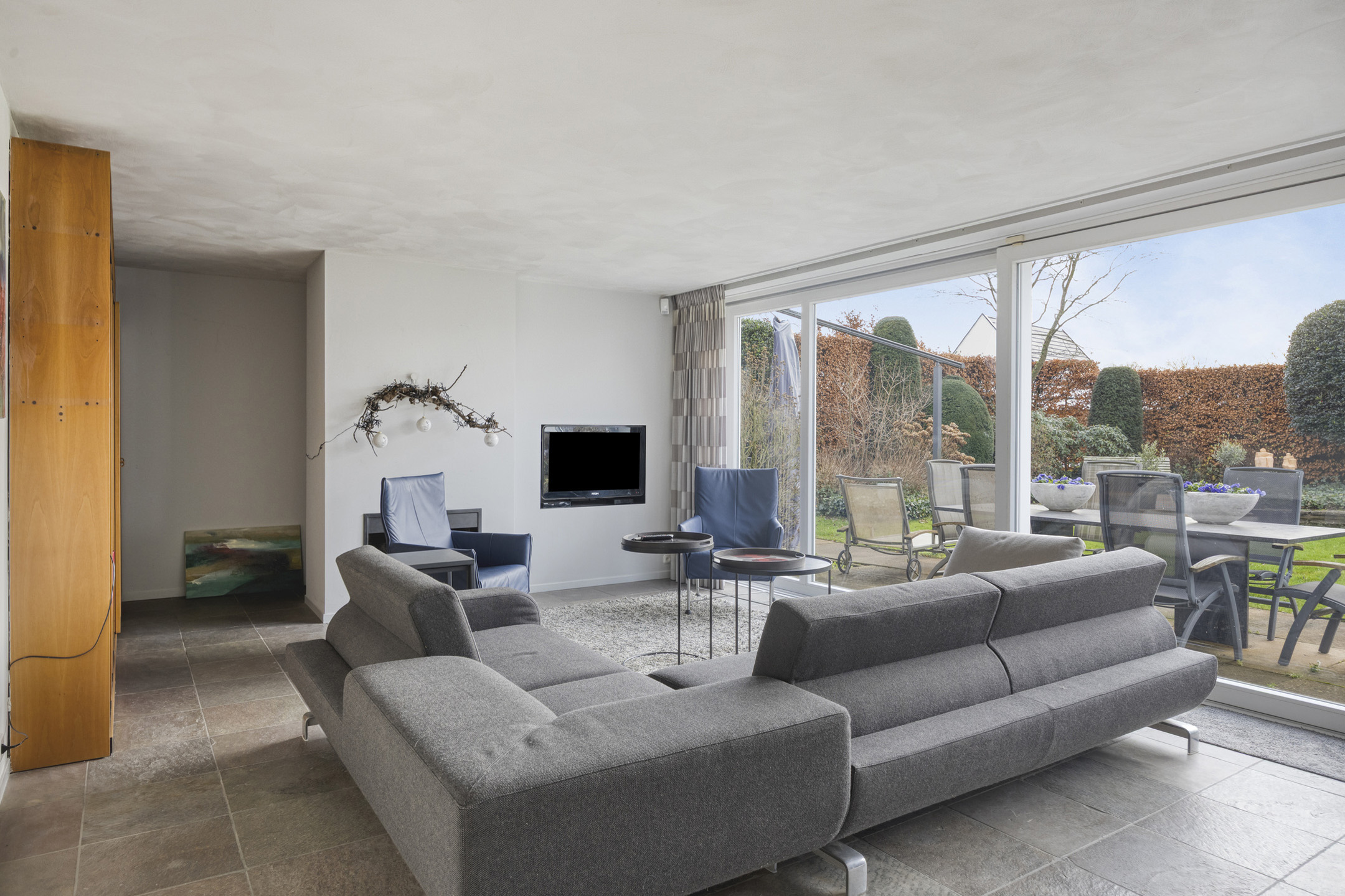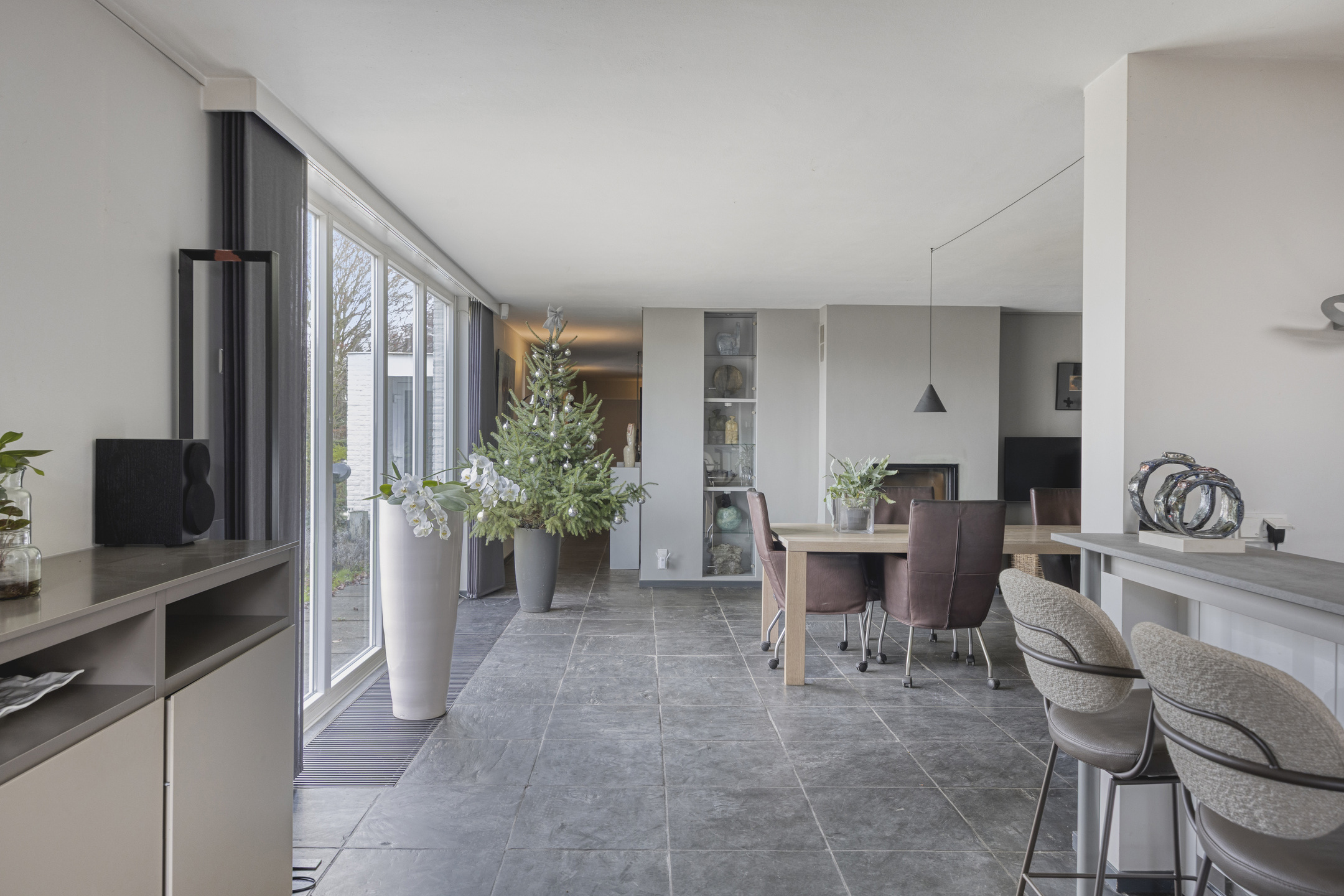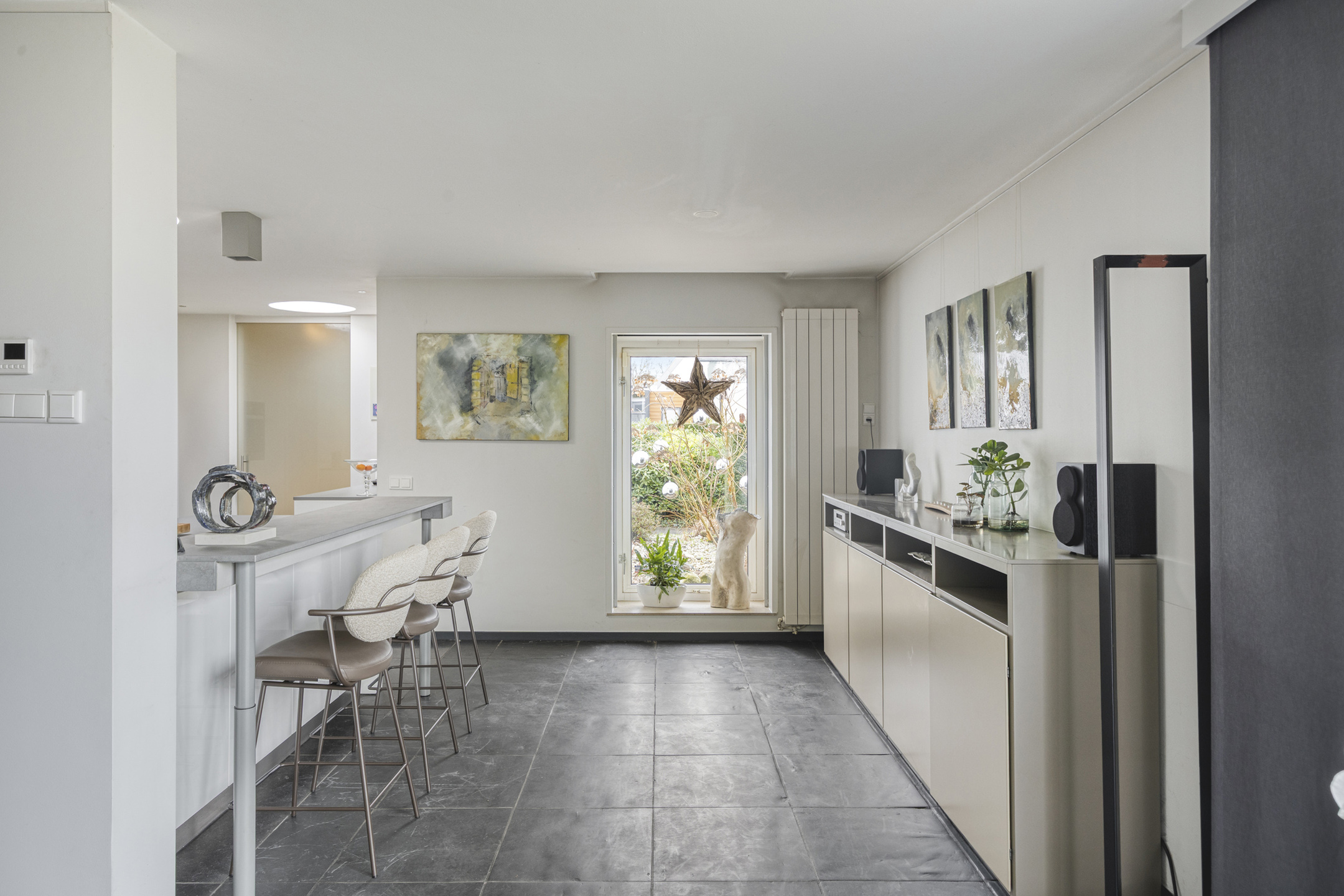 De royale zit-/tuinkamer vormt het hart van de woning. Dankzij een grote schuifpui geniet u hier van een prachtig uitzicht over de tuin en een overvloed aan daglicht. De openhaard draagt bij aan de warme, sfeervolle uitstraling en maakt dit tot een heerlijke plek om te ontspannen.