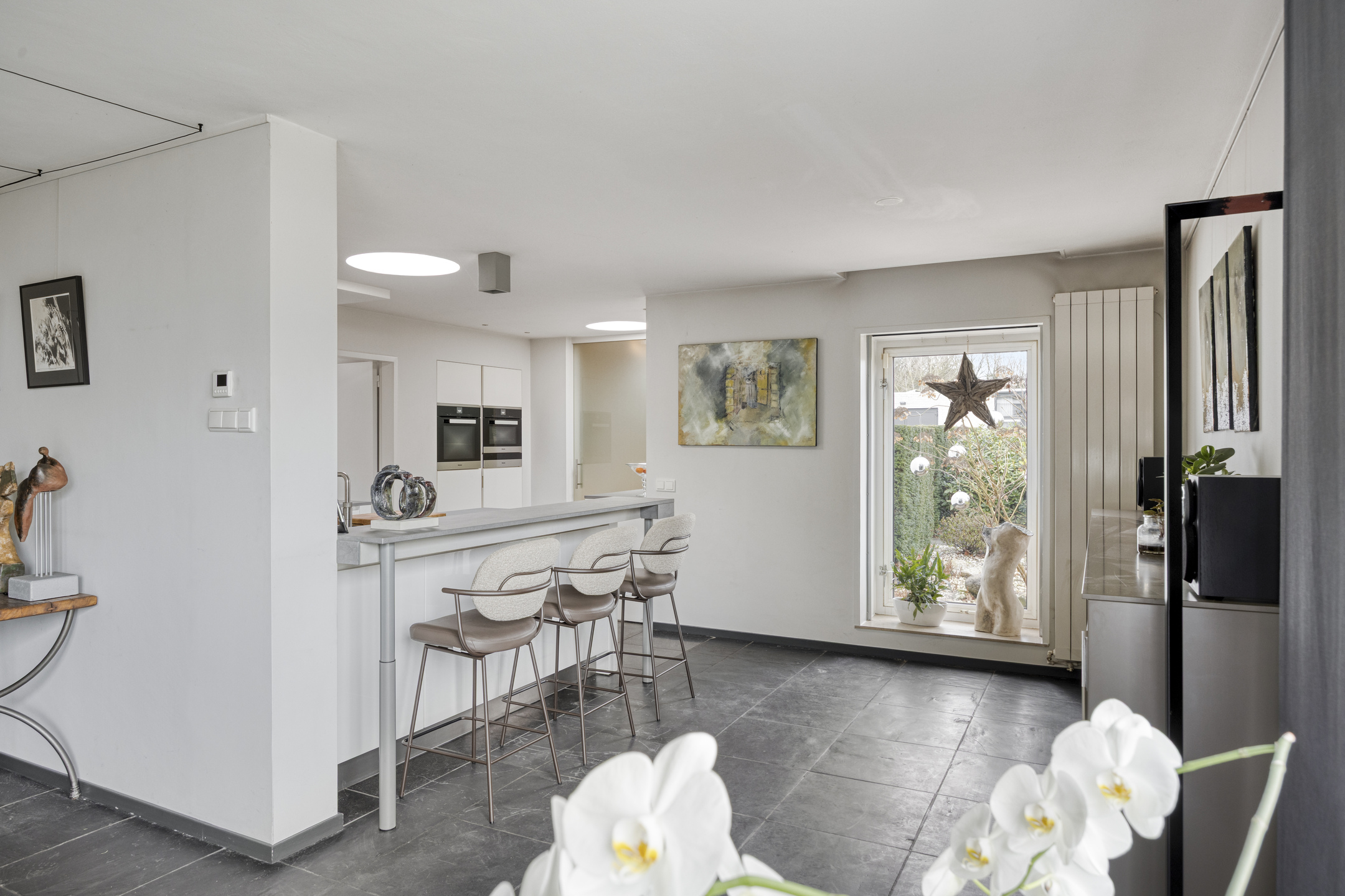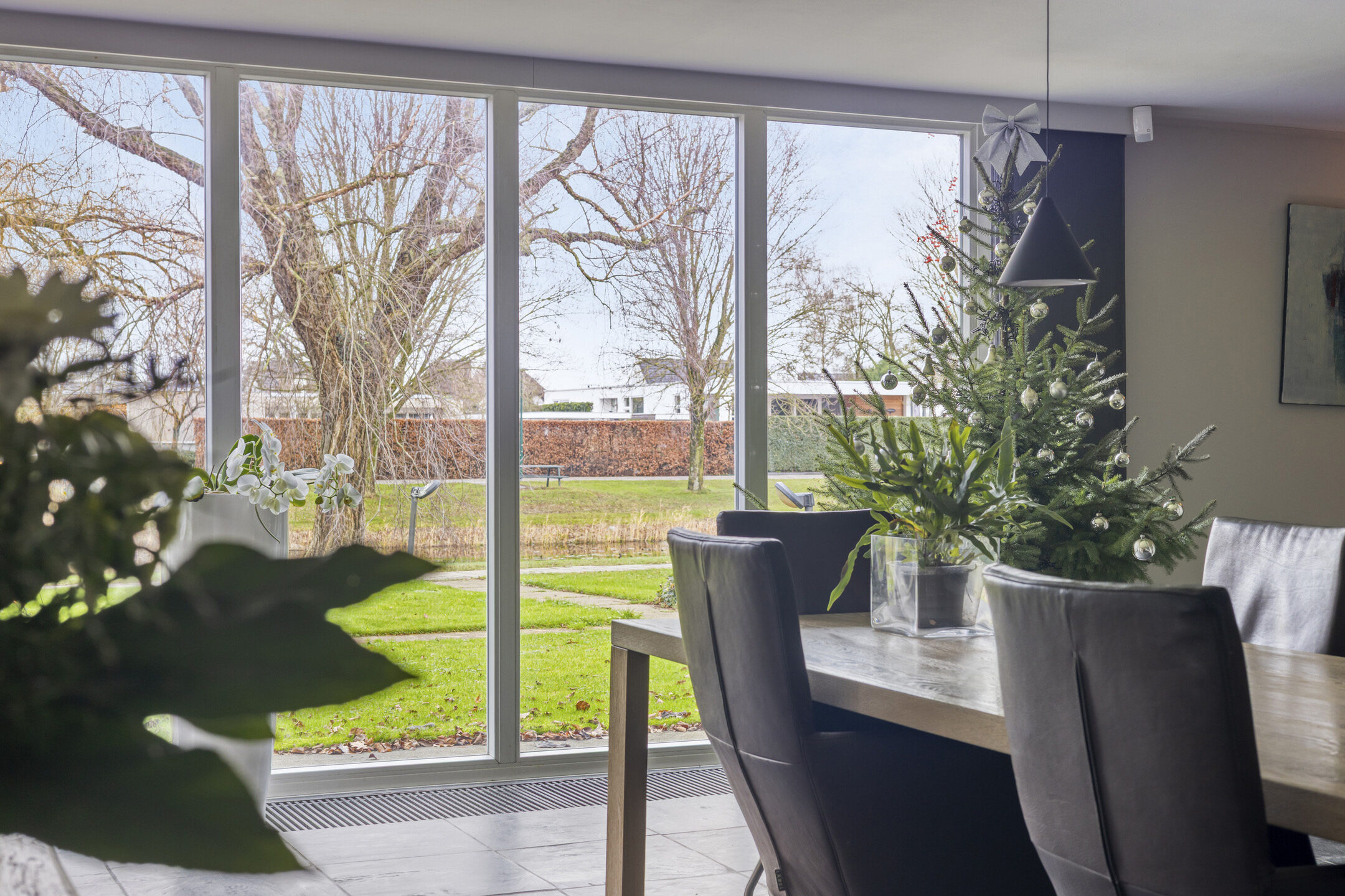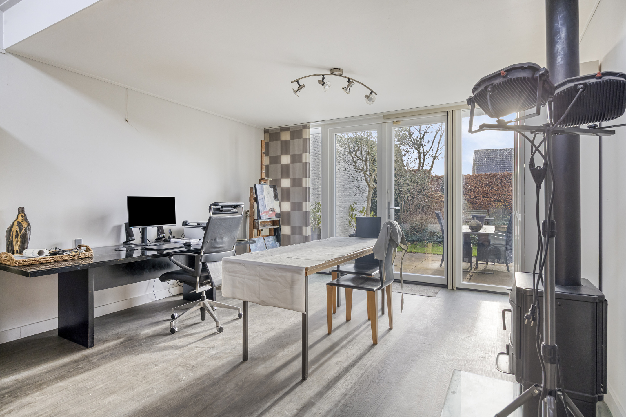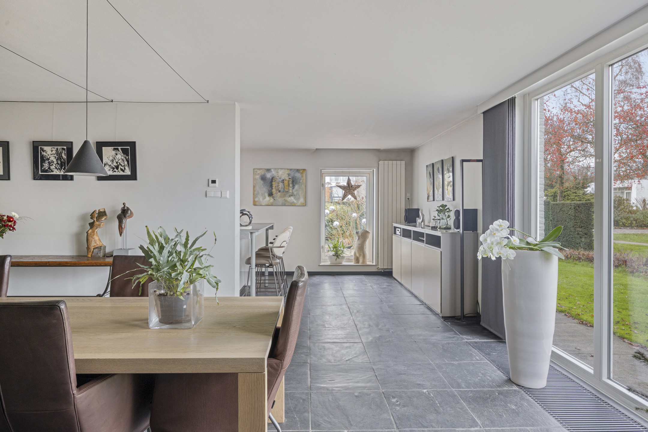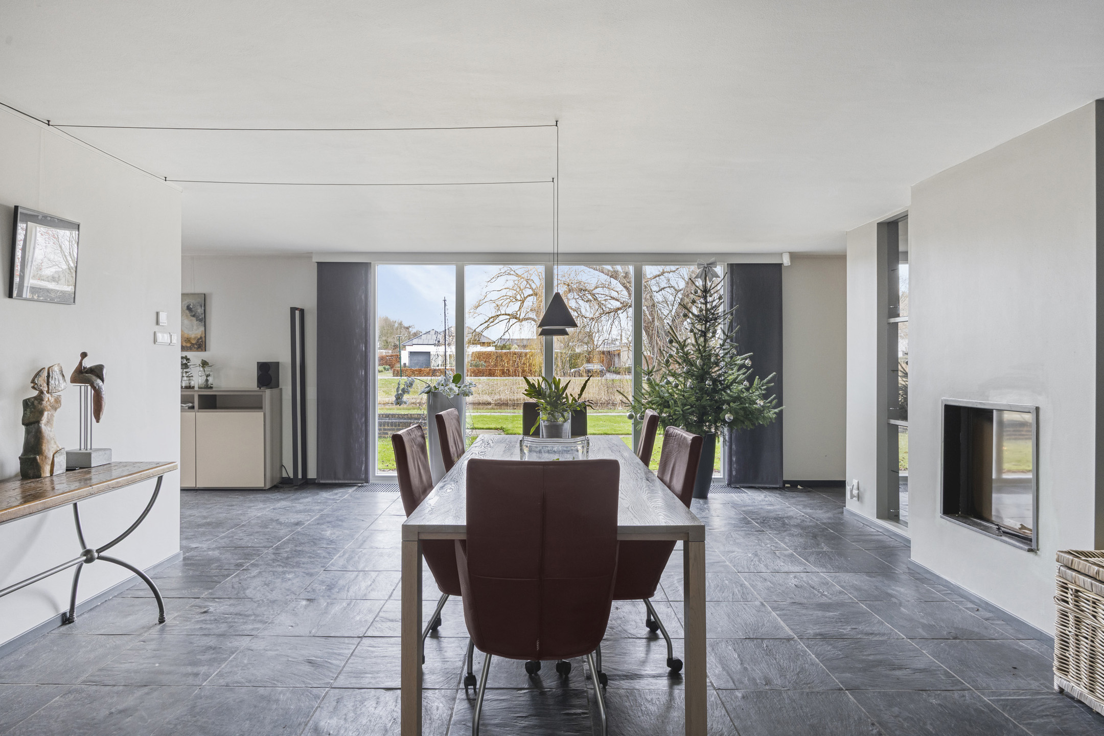 De royale zit-/tuinkamer vormt het hart van de woning. Dankzij een grote schuifpui geniet u hier van een prachtig uitzicht over de tuin en een overvloed aan daglicht. De openhaard draagt bij aan de warme, sfeervolle uitstraling en maakt dit tot een heerlijke plek om te ontspannen.