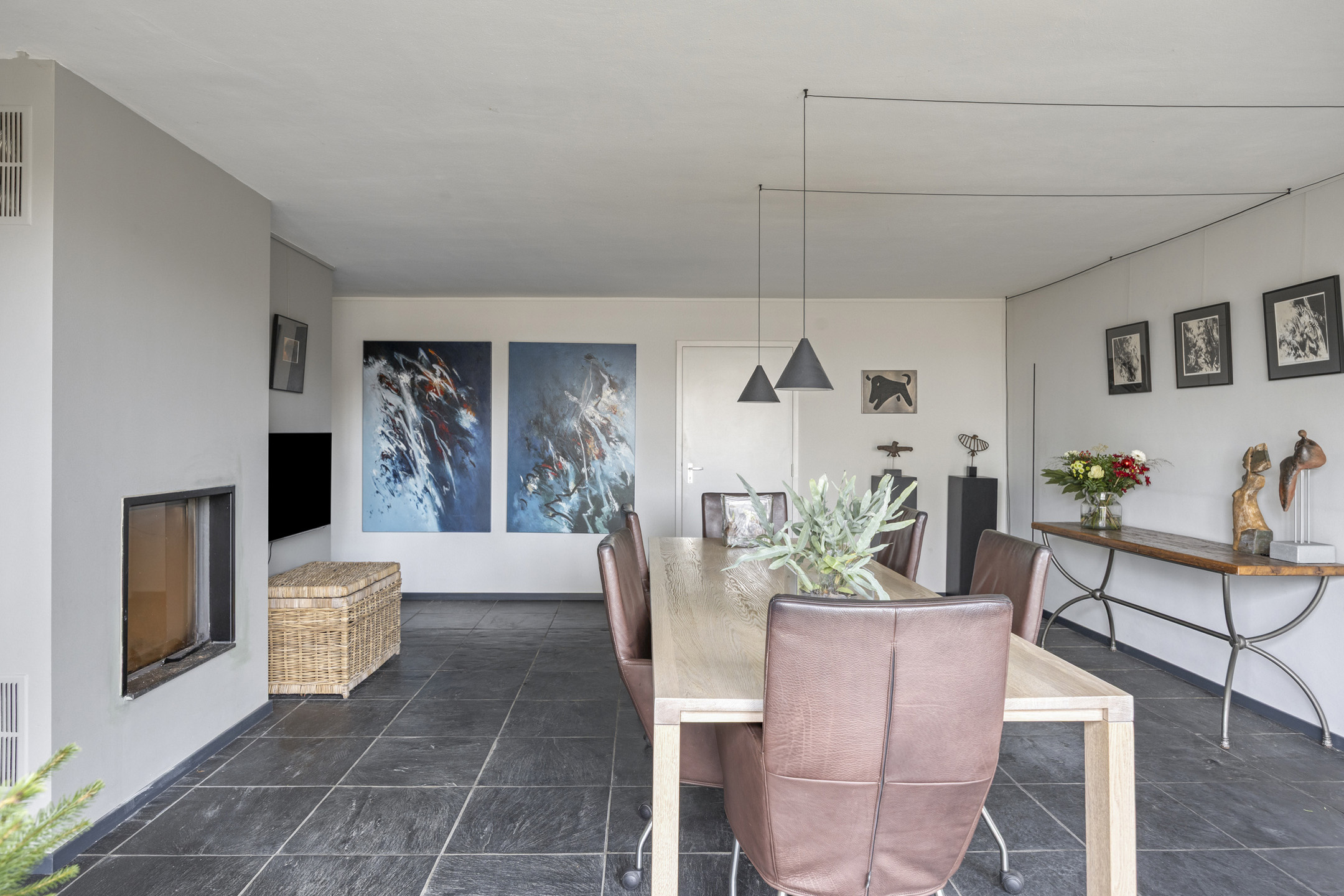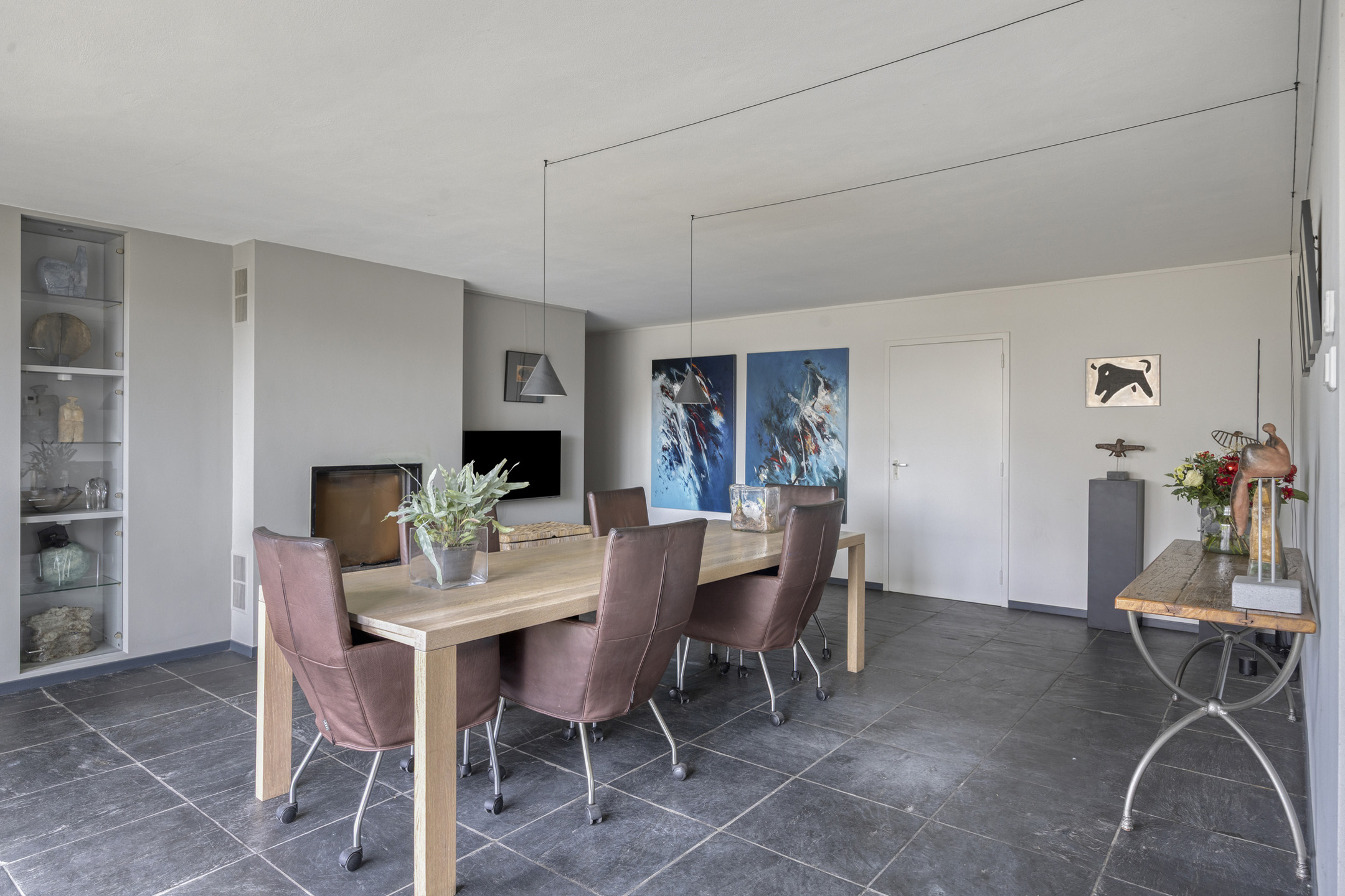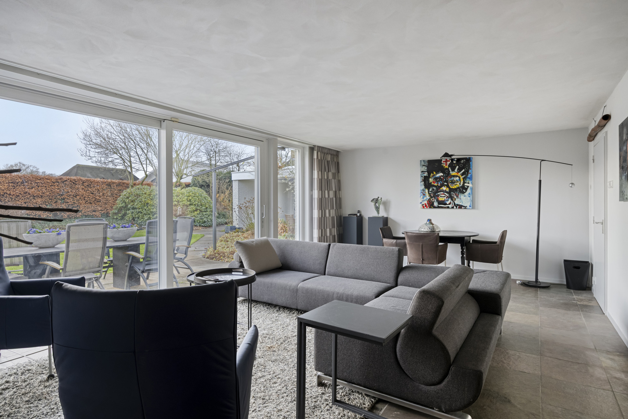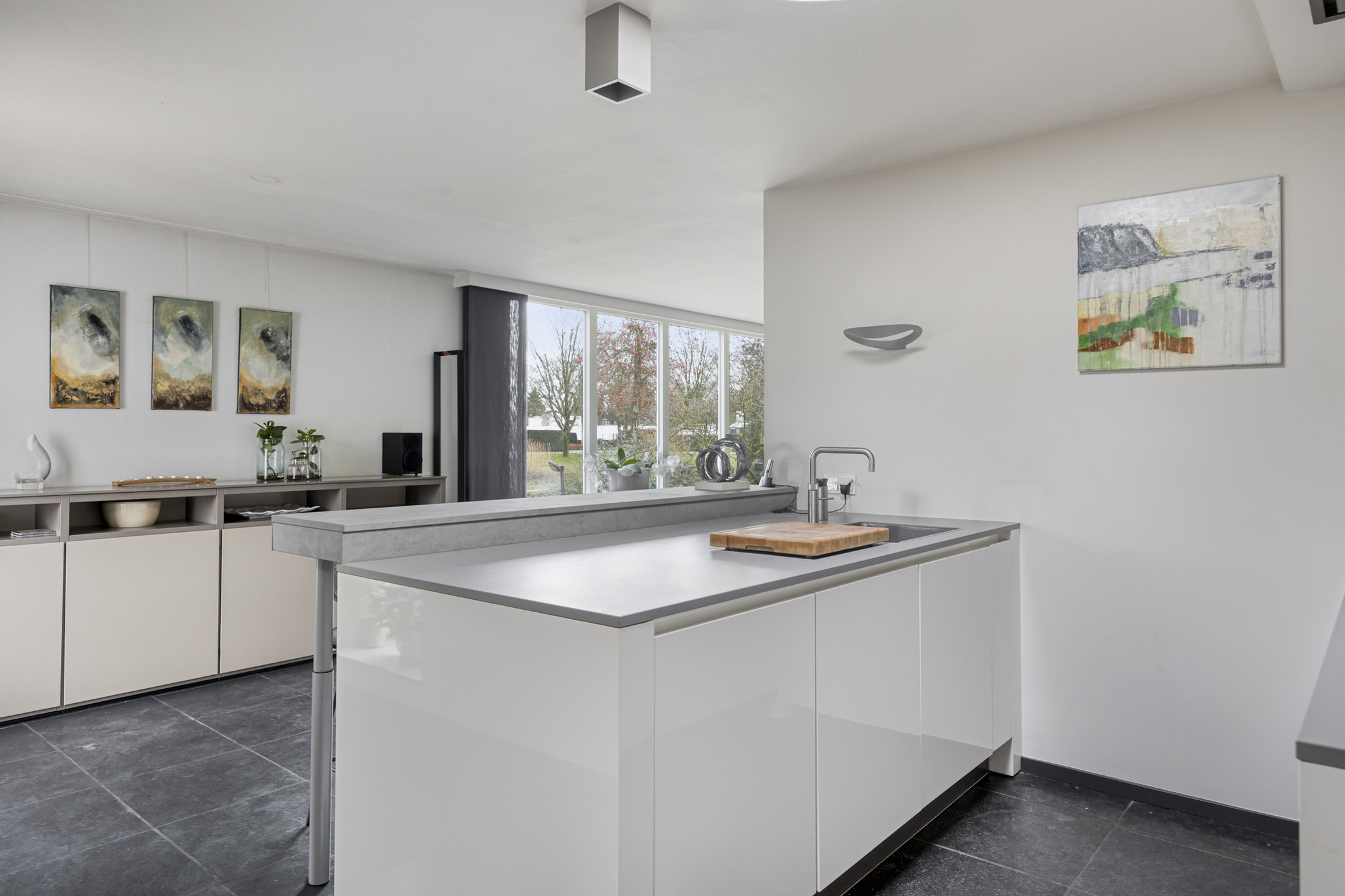 De royale zit-/tuinkamer vormt het hart van de woning. Dankzij een grote schuifpui geniet u hier van een prachtig uitzicht over de tuin en een overvloed aan daglicht. De openhaard draagt bij aan de warme, sfeervolle uitstraling en maakt dit tot een heerlijke plek om te ontspannen.
