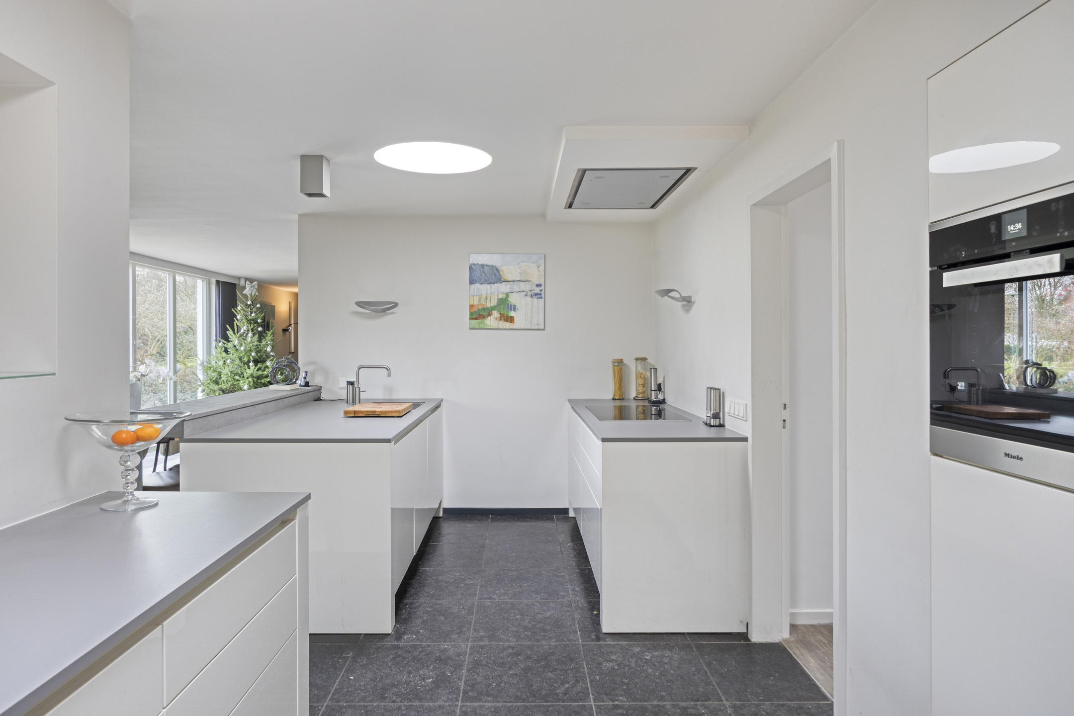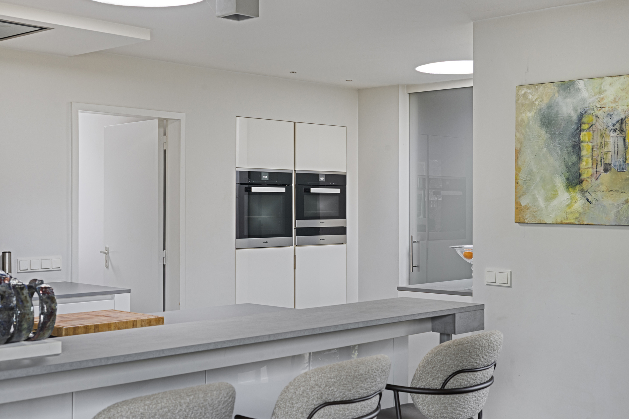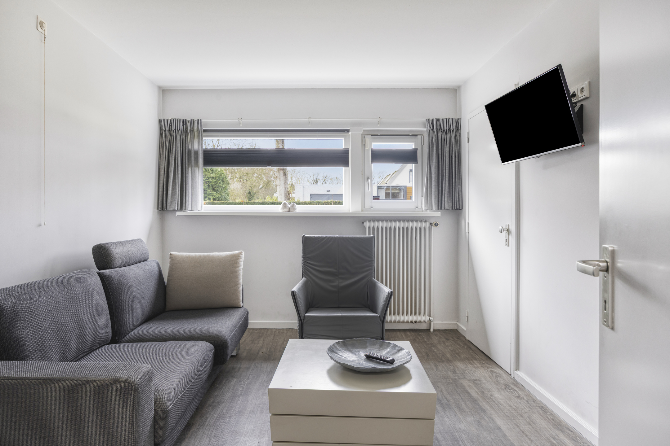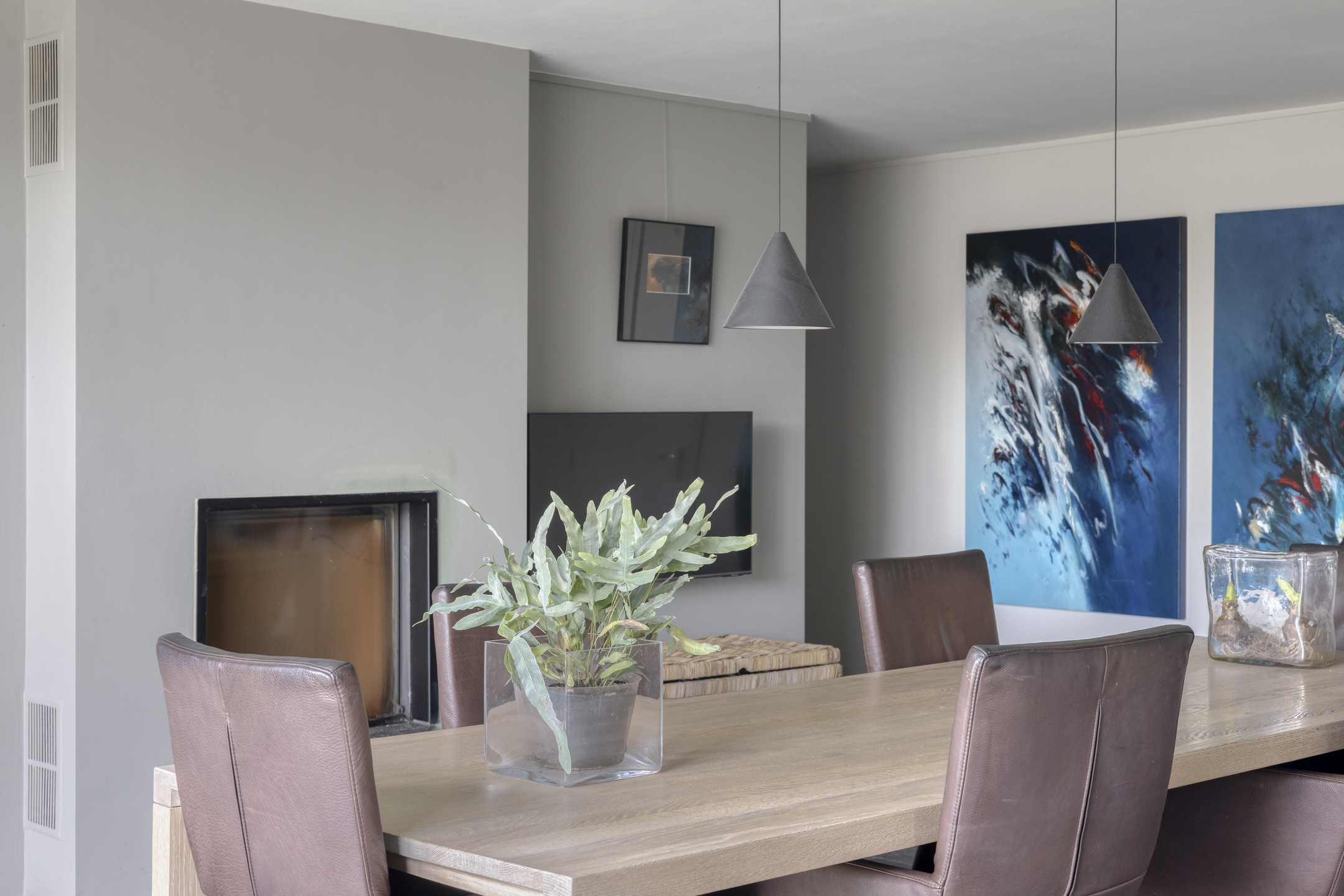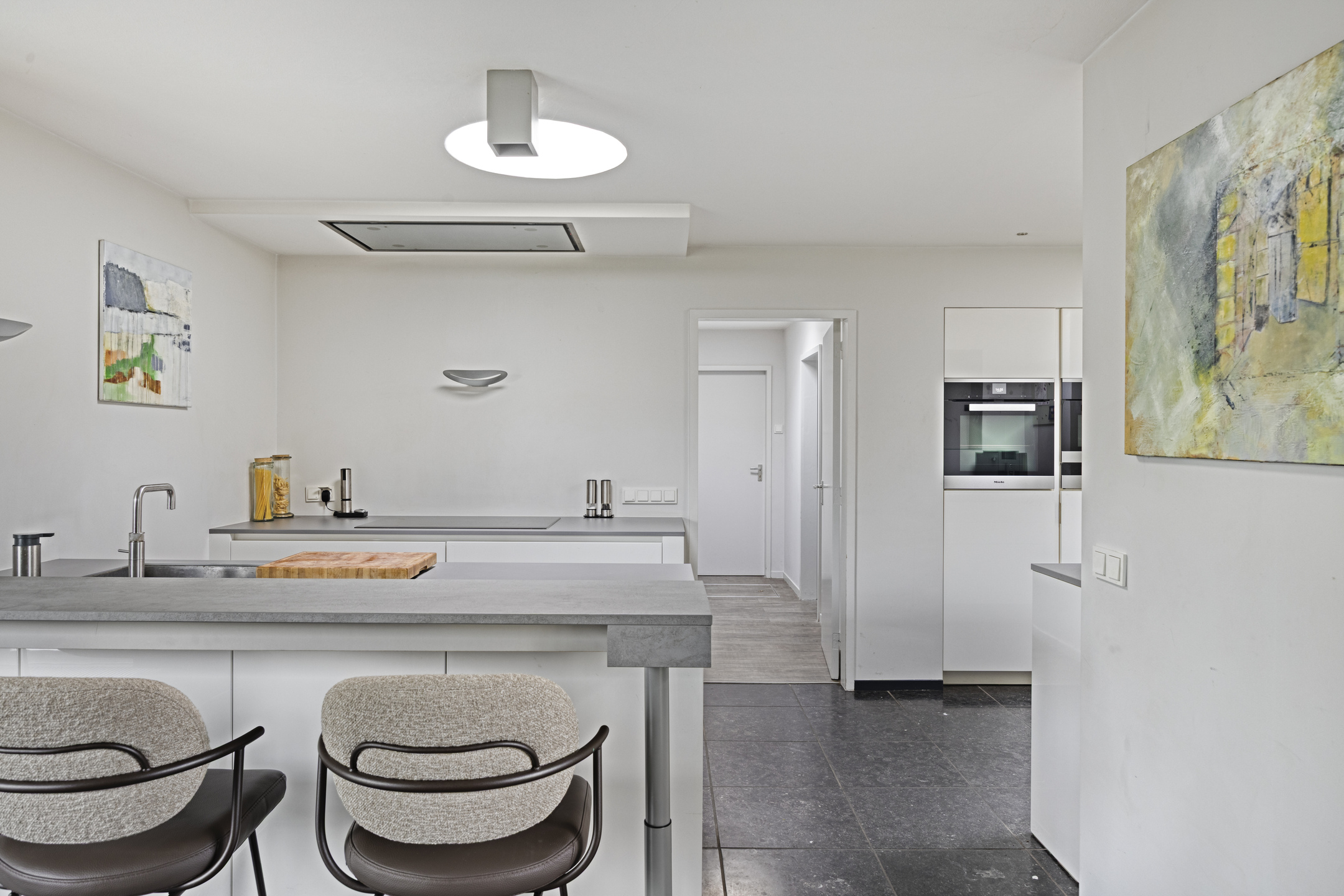 De royale zit-/tuinkamer vormt het hart van de woning. Dankzij een grote schuifpui geniet u hier van een prachtig uitzicht over de tuin en een overvloed aan daglicht. De openhaard draagt bij aan de warme, sfeervolle uitstraling en maakt dit tot een heerlijke plek om te ontspannen.
