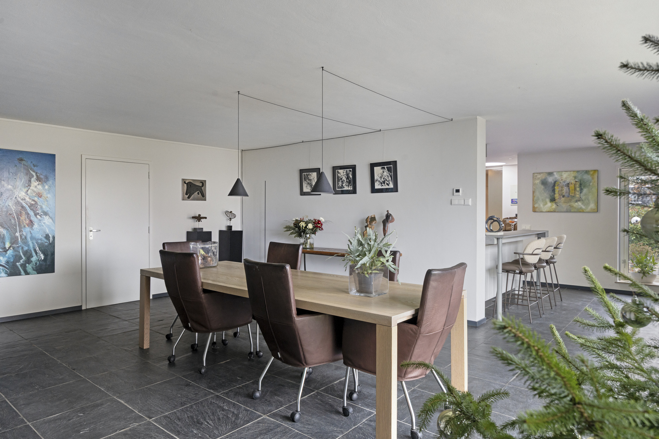 De eetkamer staat in open verbinding met de moderne keuken, die is voorzien van alle denkbare gemakken: een inductiekookplaat, afzuigkap, koelkast, twee ovens, warmhoudlade, vaatwasser en Quooker. Vanuit de keuken loopt u door naar de eetkamer, waar u geniet van een fraai uitzicht over de groene omgeving aan de voorzijde van de woning. Ook hier zorgt een houtkachel voor extra sfeer tijdens lange diners.