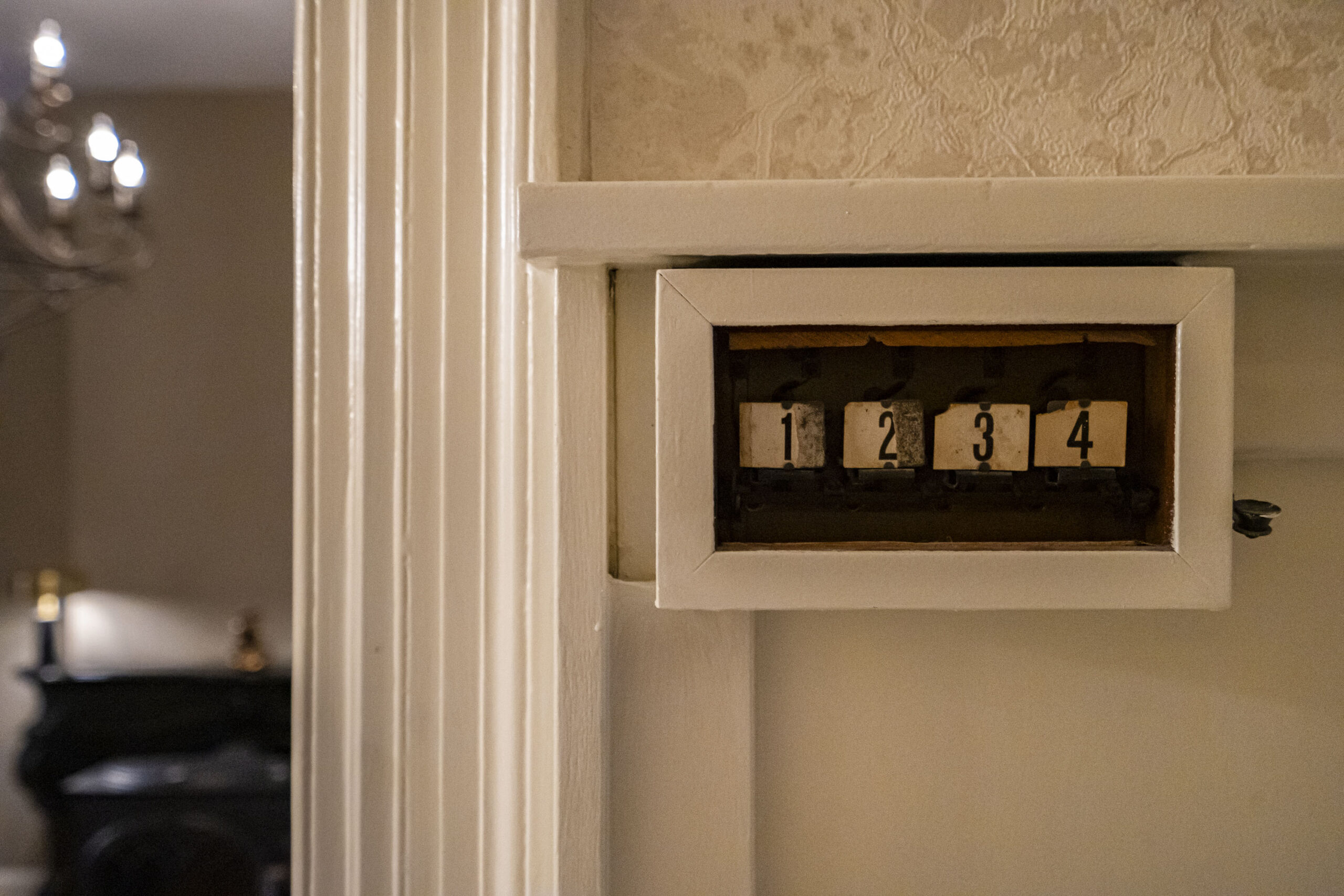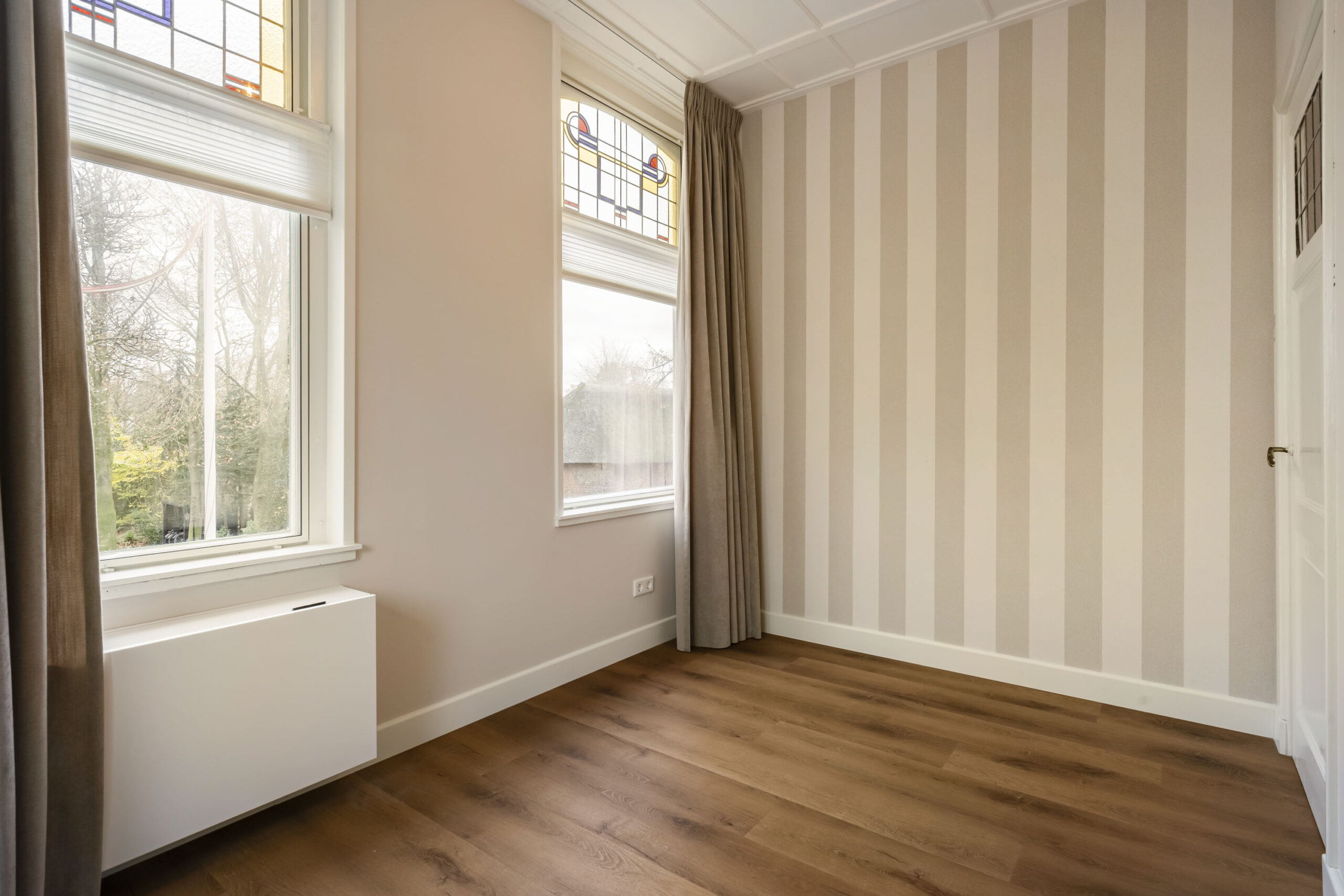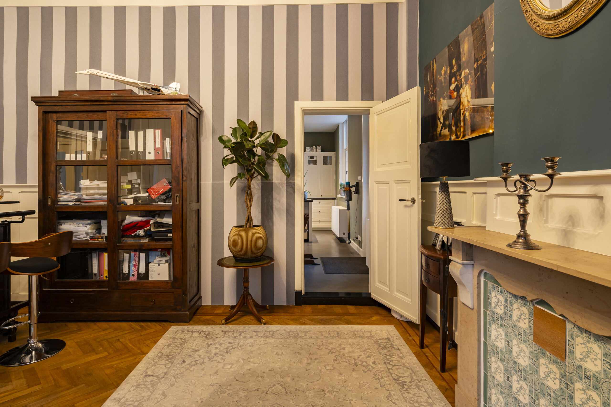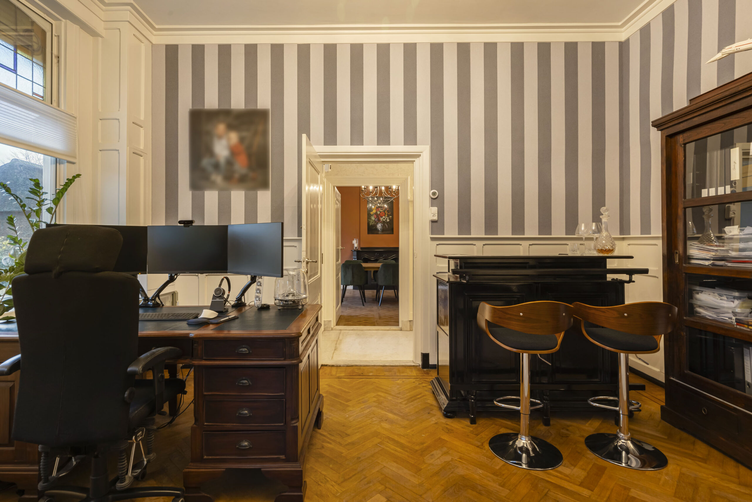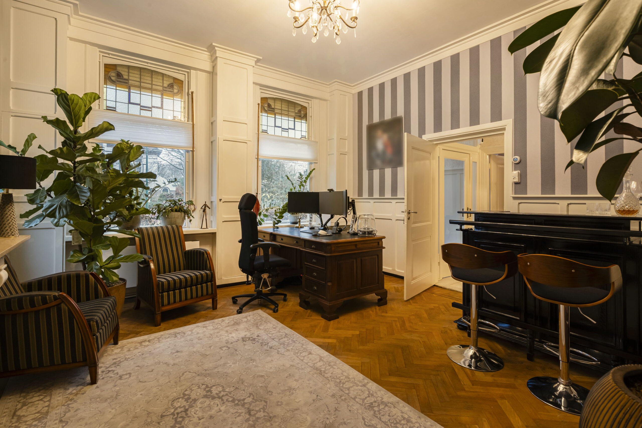 Aan de voorzijde bevindt zich een stijlvolle kantoorruimte met houten vloer met bies, glas-in-loodramen, lambrisering en rolluiken.