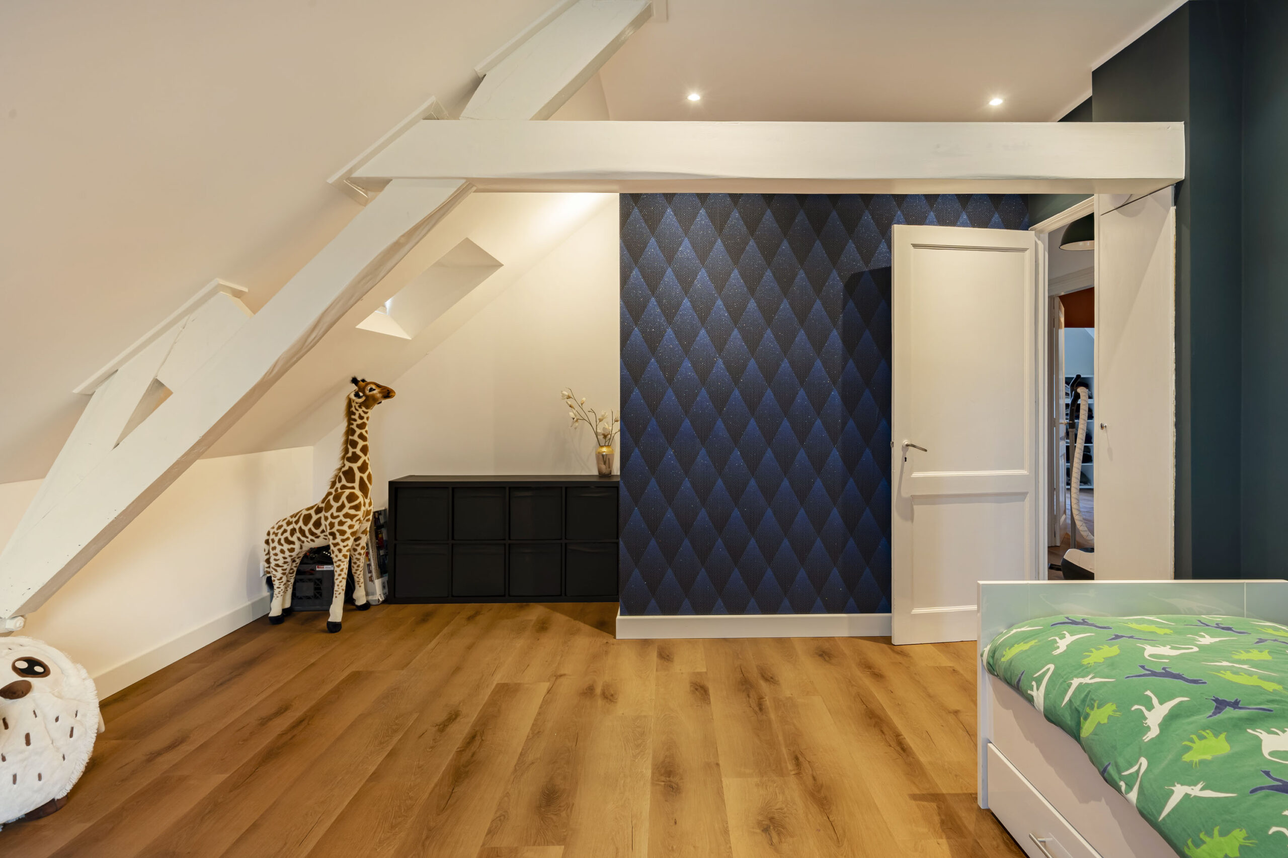 Deze verdieping is volledig aangepakt: PVC-vloeren (na complete verdiepingsvloer egalisatie), strak stucwerk en geïsoleerde vloer, plafonds en tussenwanden.