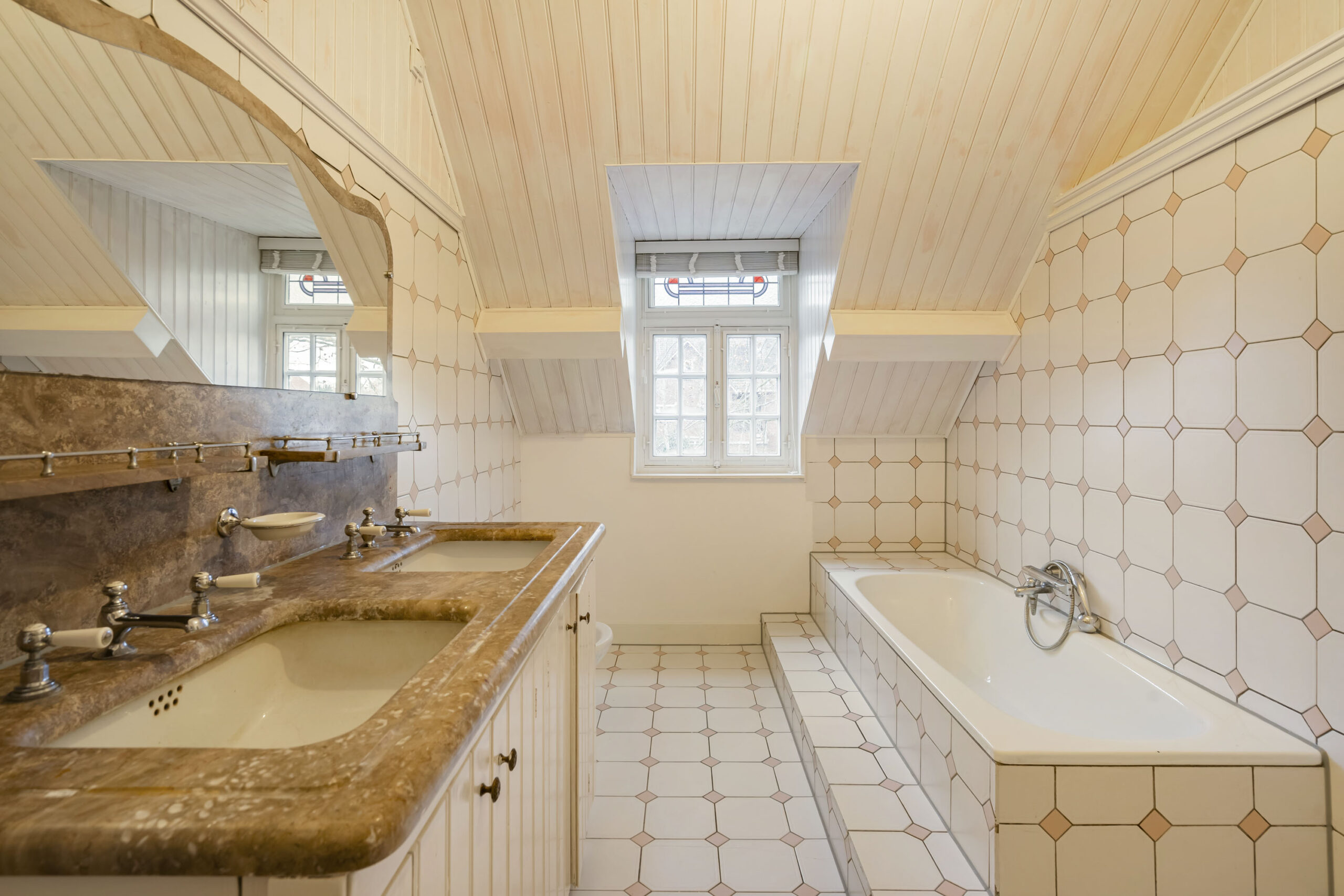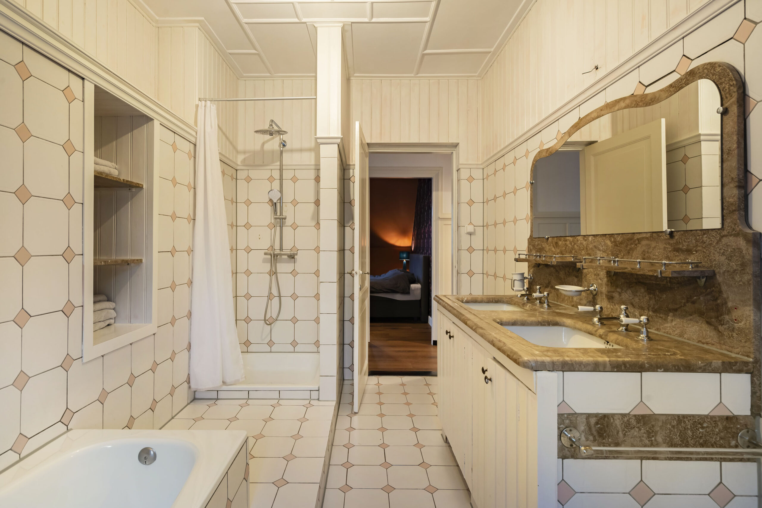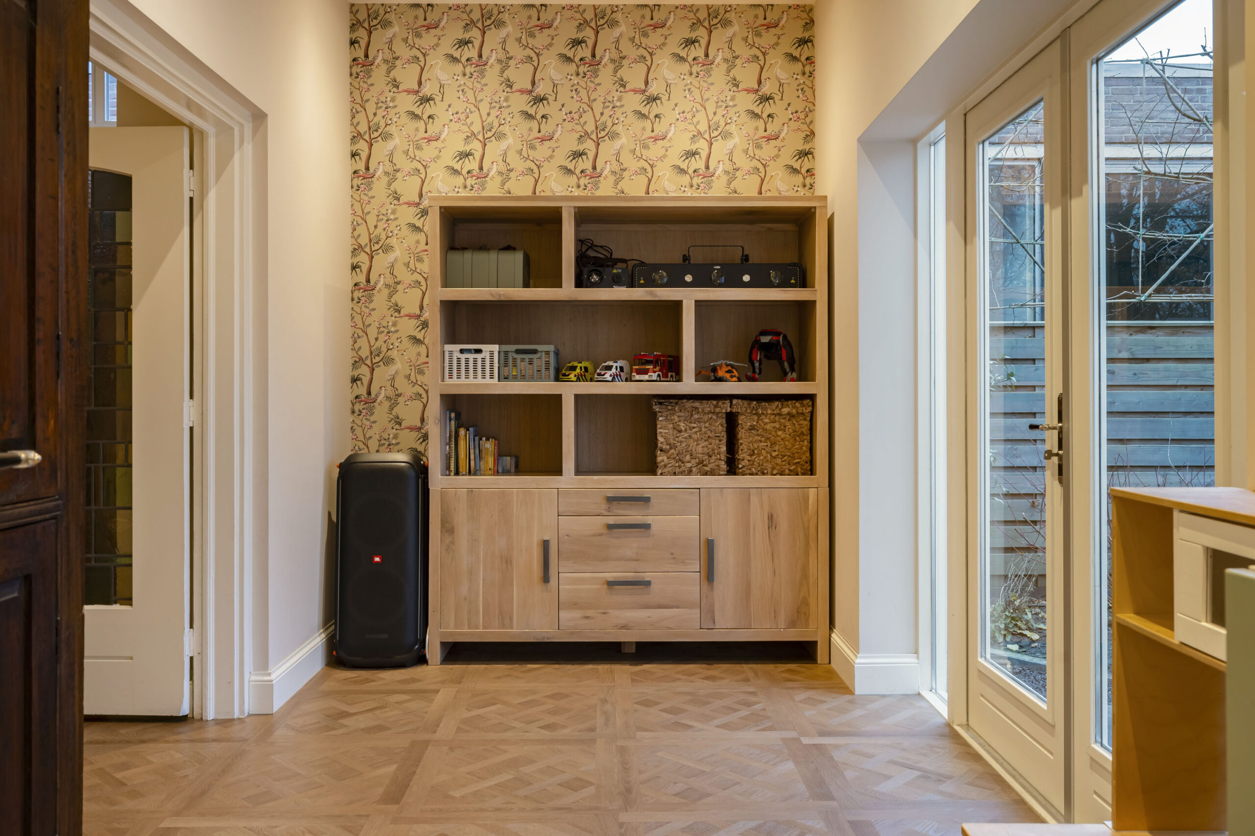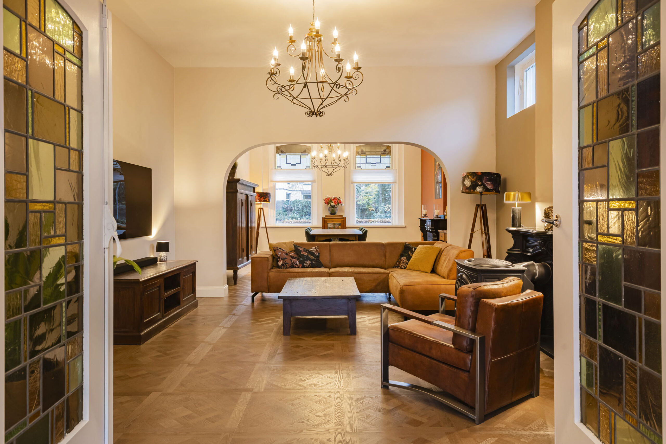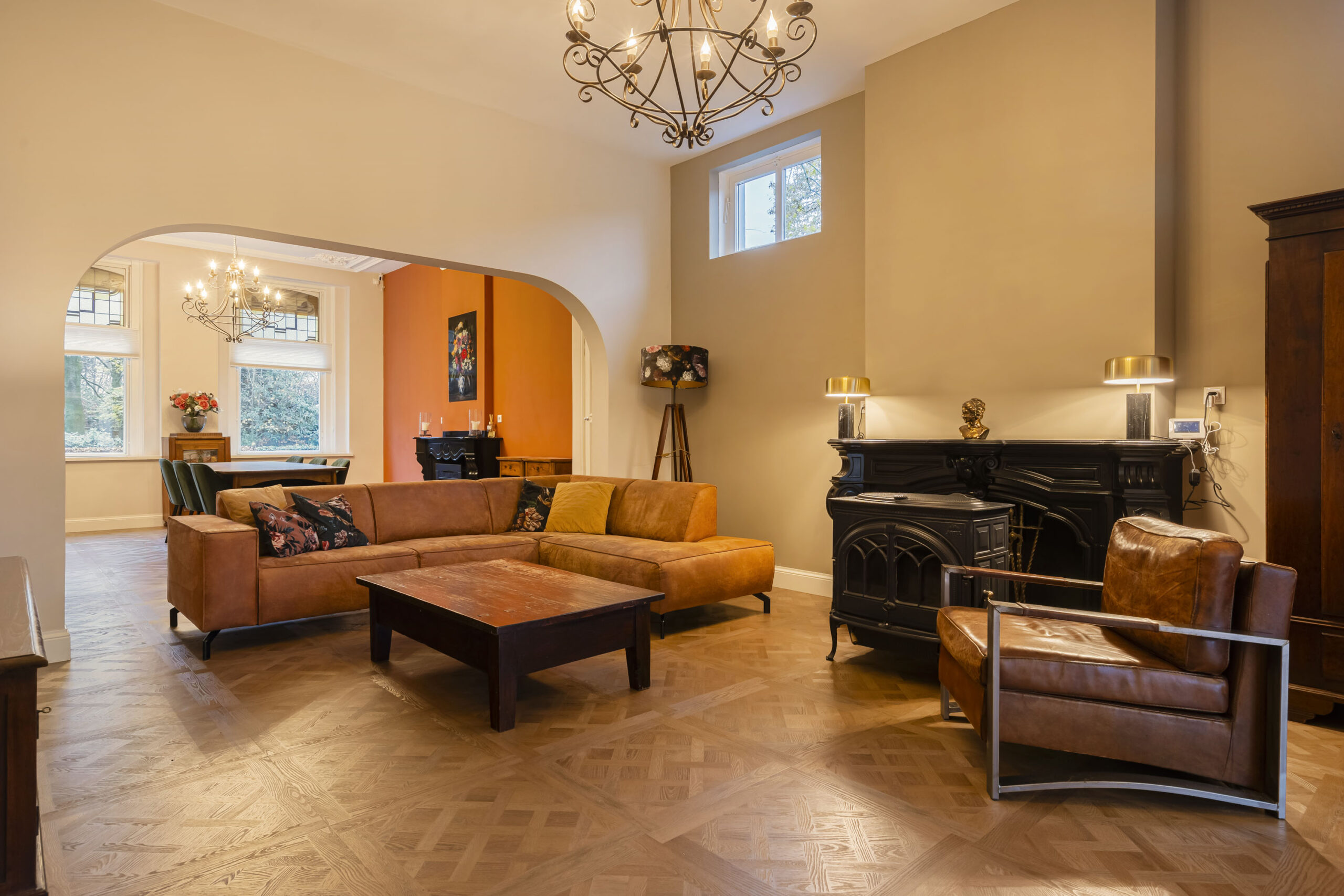 De woonkamer bestaat uit meerdere sfeervolle zones met vloerverwarming, strak gestucte wanden en een PVC-vloer in Versailles-patroon. De voorkamer en tussenkamer beschikken beide over een haard, en glas-in-lood en openslaande deuren brengen prachtig licht binnen. De tuinkamer is momenteel in gebruik als speelkamer de openslaande deuren bieden toegang tot een groot terras.