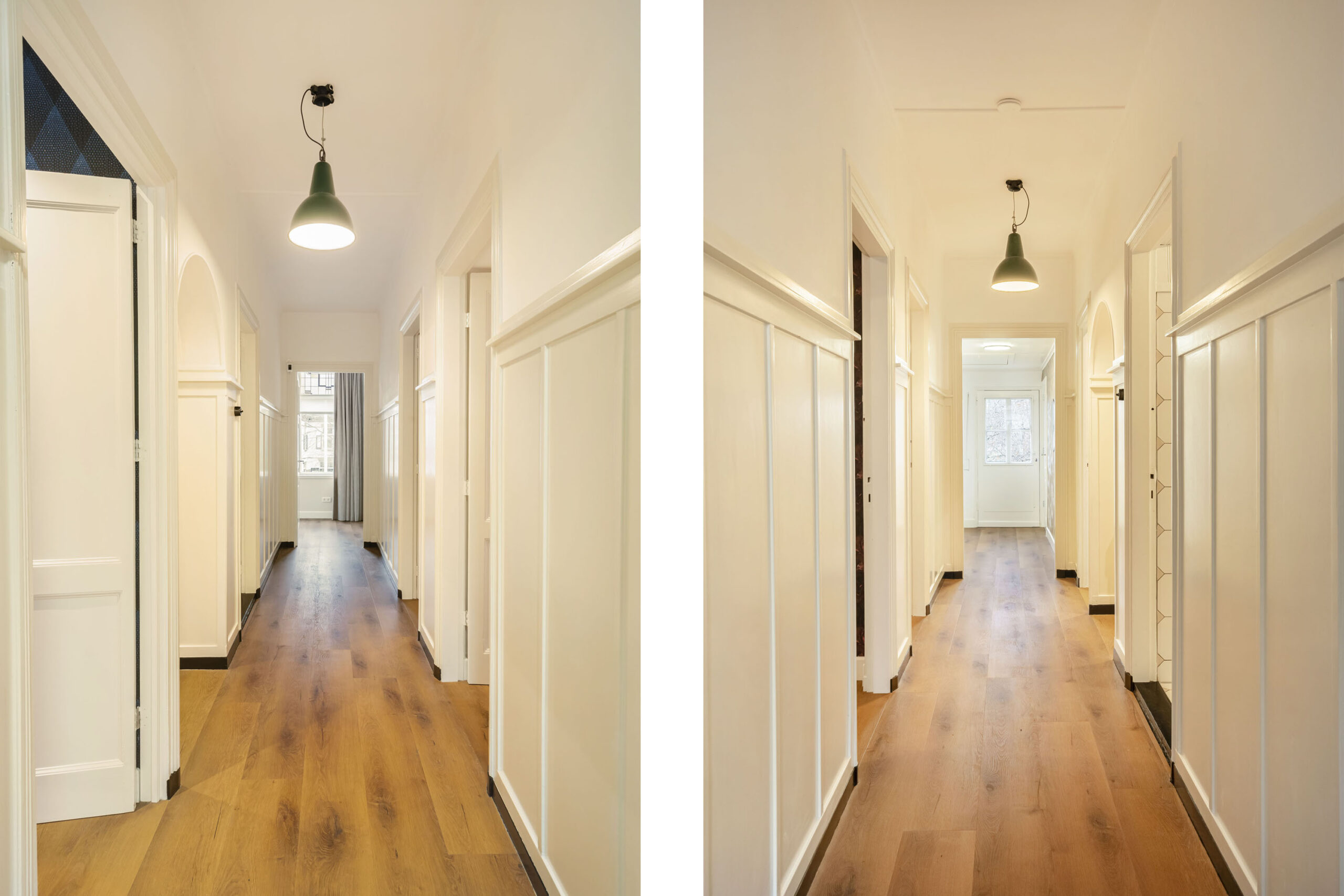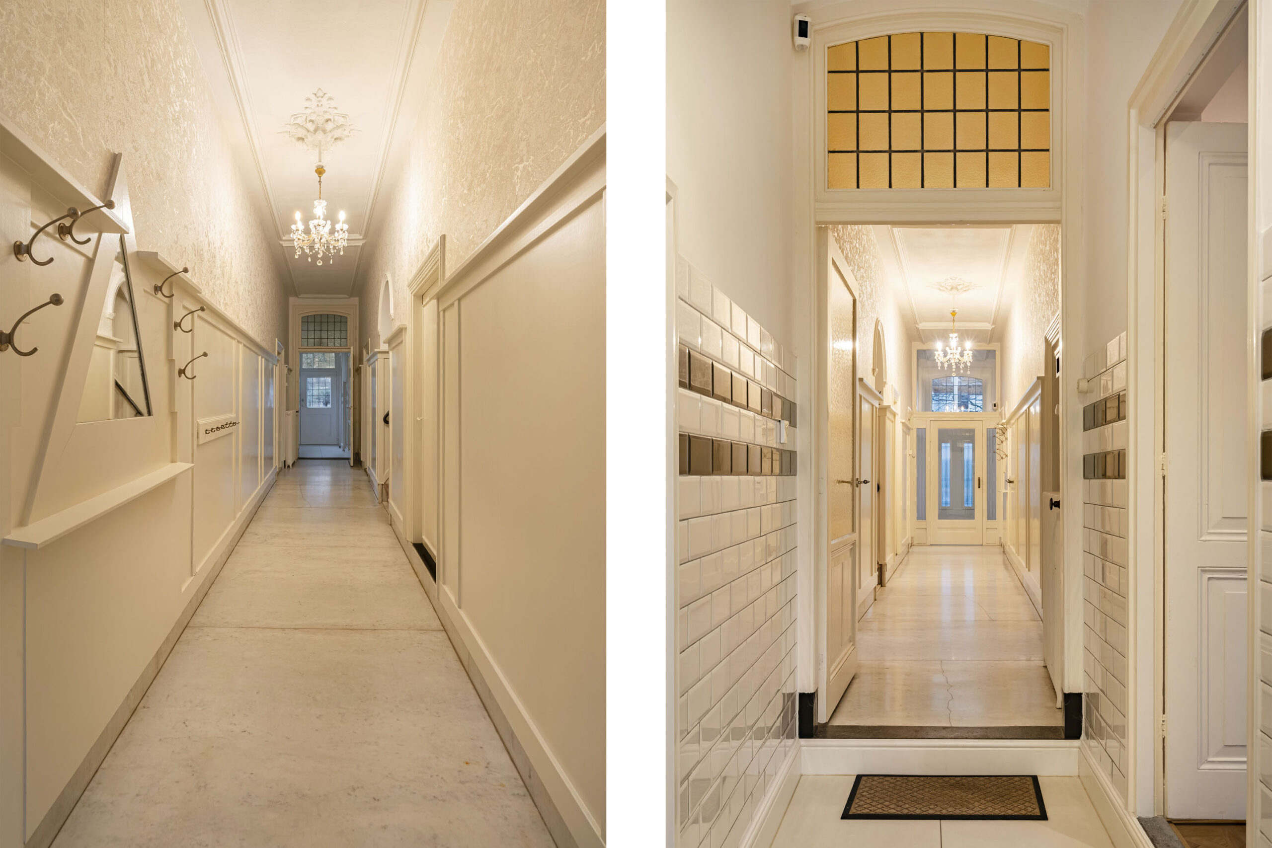 De royale entree ademt direct de sfeer van een karakterwoning: lambrisering, marmeren vloerplaten en een fraai ornamentenplafond geven deze hal grandeur.