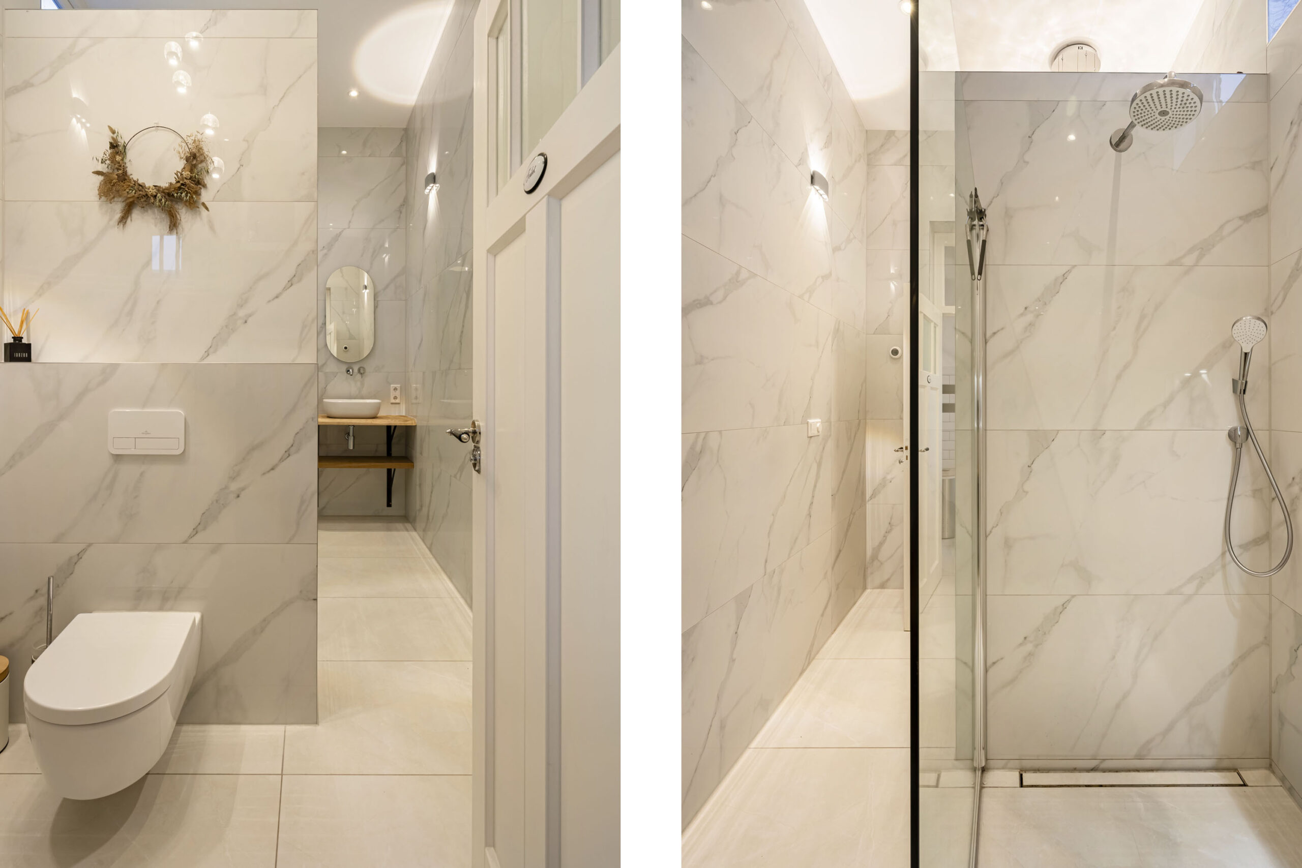 De nieuw gerealiseerde badkamer op de begane grond is met hoogstaande materialen en luxe uitgevoerd met marmerlook wandtegels, strak gestuct plafond, royaal douchegedeelte, toilet en wastafelmeubel.