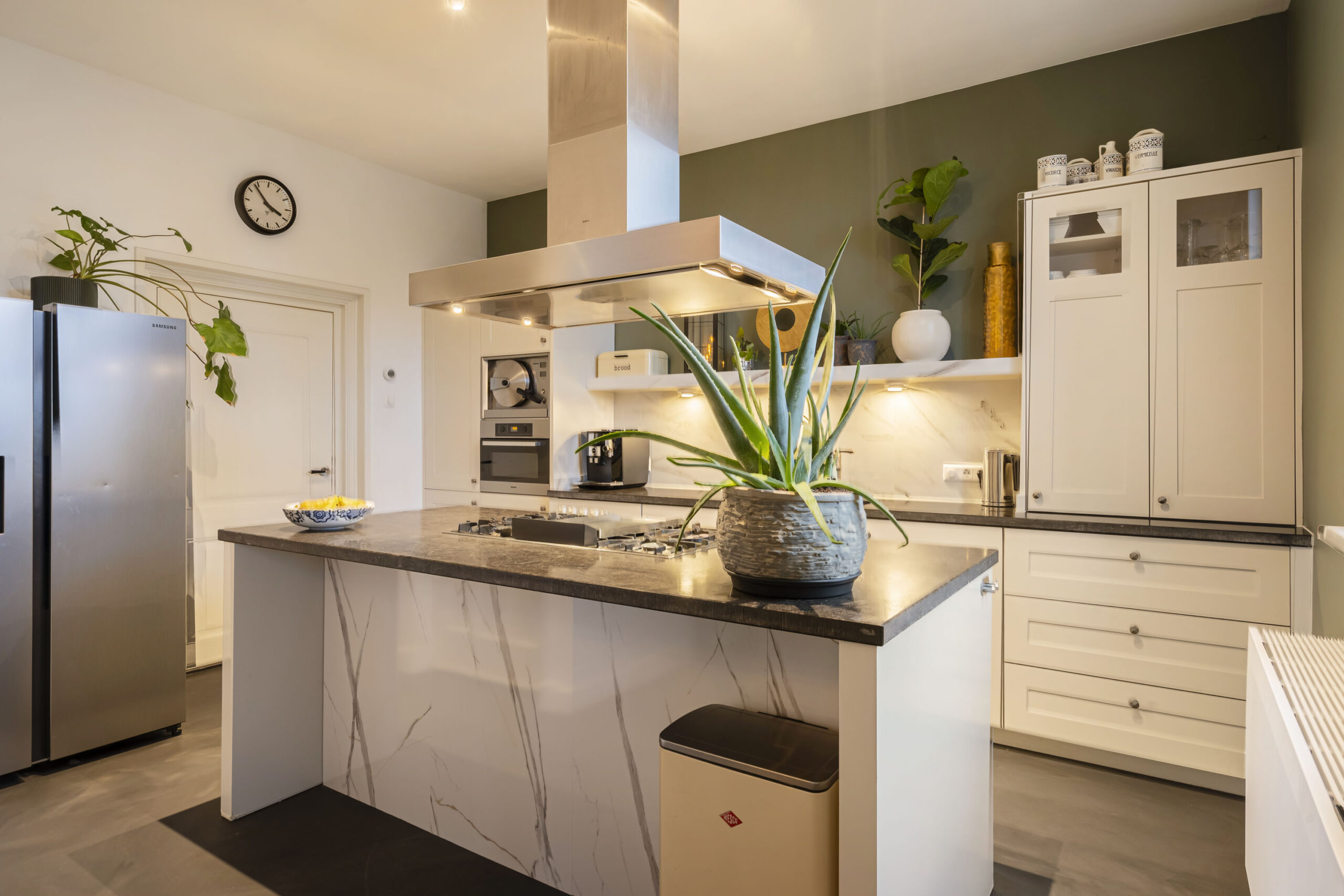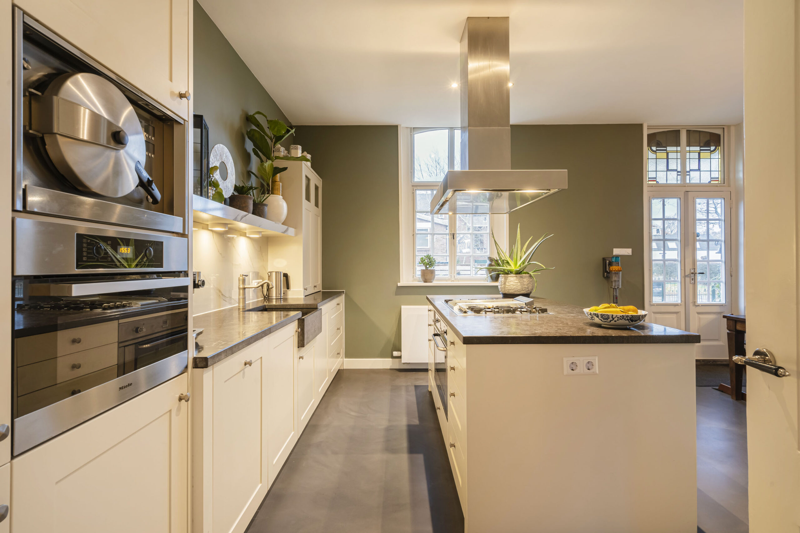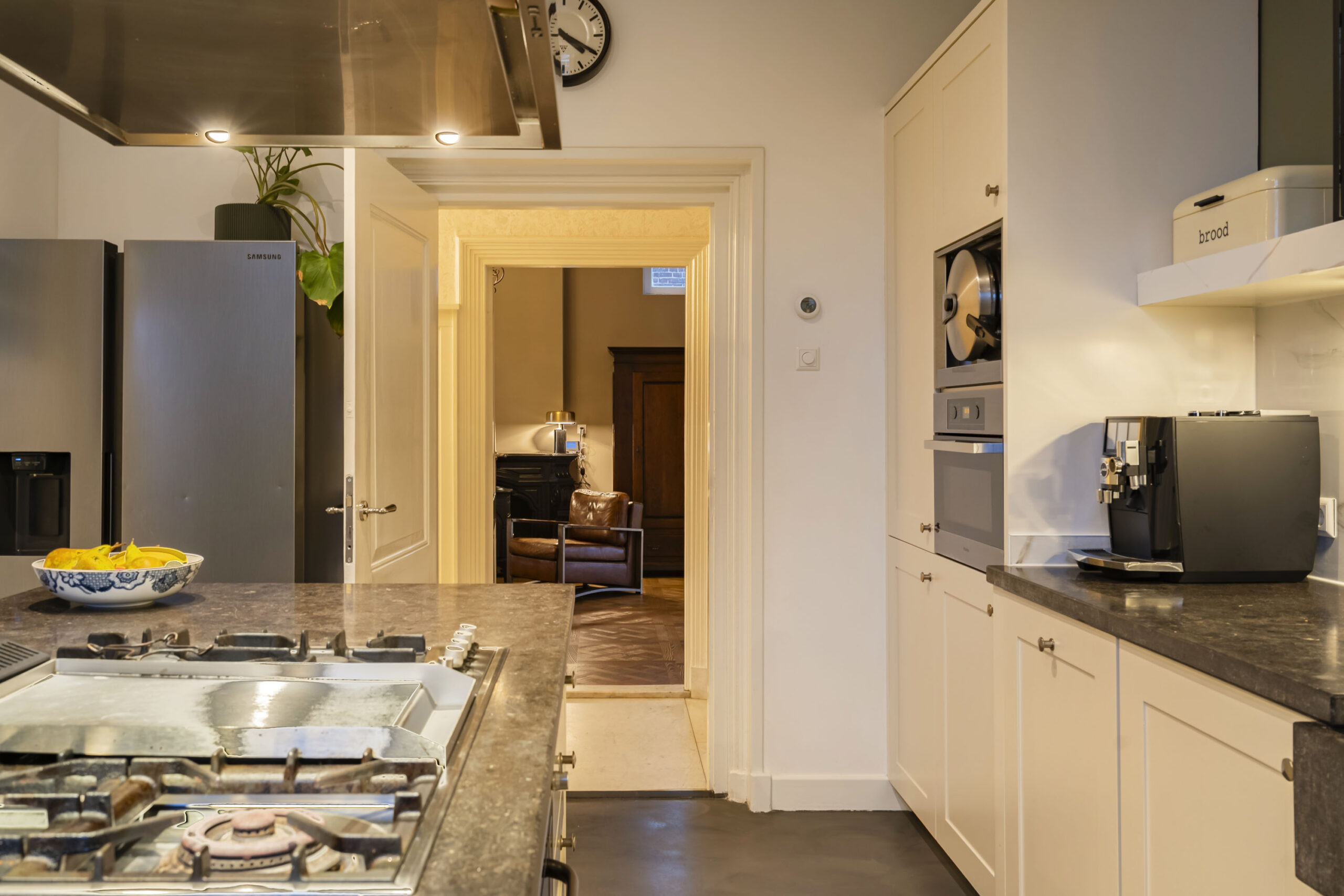 De leefkeuken is smaakvol vernieuwd, voorzien van een betoncire vloer, strak gestucte wanden en plafonds, natuurstenen aanrechtblad, een Boretti-oven, stoomoven, combi-oven/magnetron, gaskookplaat en vaatwasser. In een nis bevindt zich de opstelplaats voor de wasmachine, de droger en opslag.