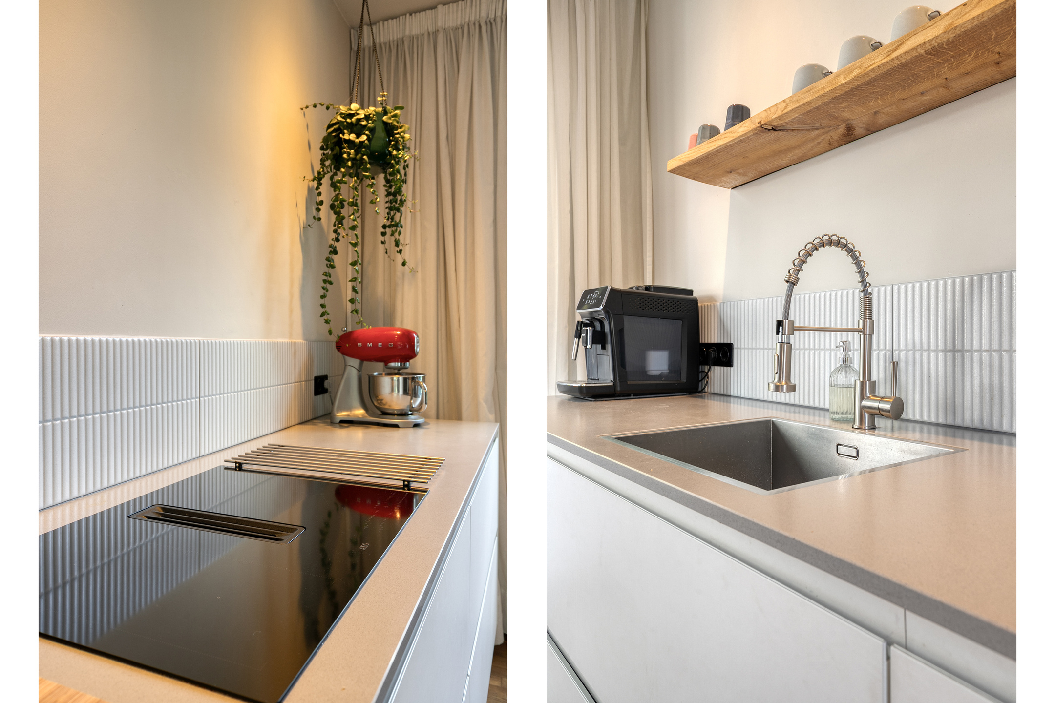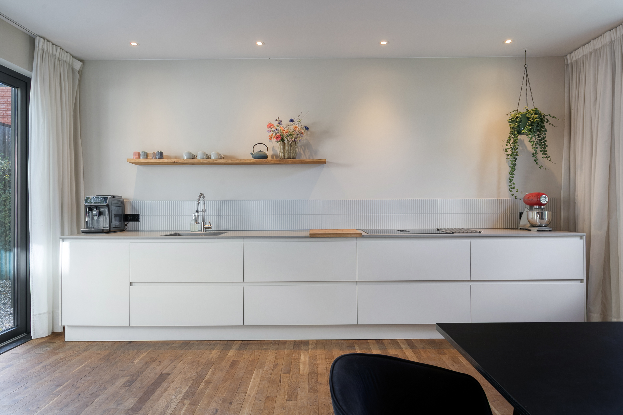 De ruime woonkeuken is het centrale punt van de woning. Hier ontmoet je elkaar: tijdens het koken, aan de lange eettafel of een leuk gesprek om de dag door te nemen. De keuken is modern uitgevoerd met strakke lijnen, een licht werkblad, hoogwaardige inbouwapparatuur en volop bergruimte. Via de openslaande deuren stap je direct de tuin in, ideaal voor lange zomeravonden of een ontbijtje in de ochtendzon.