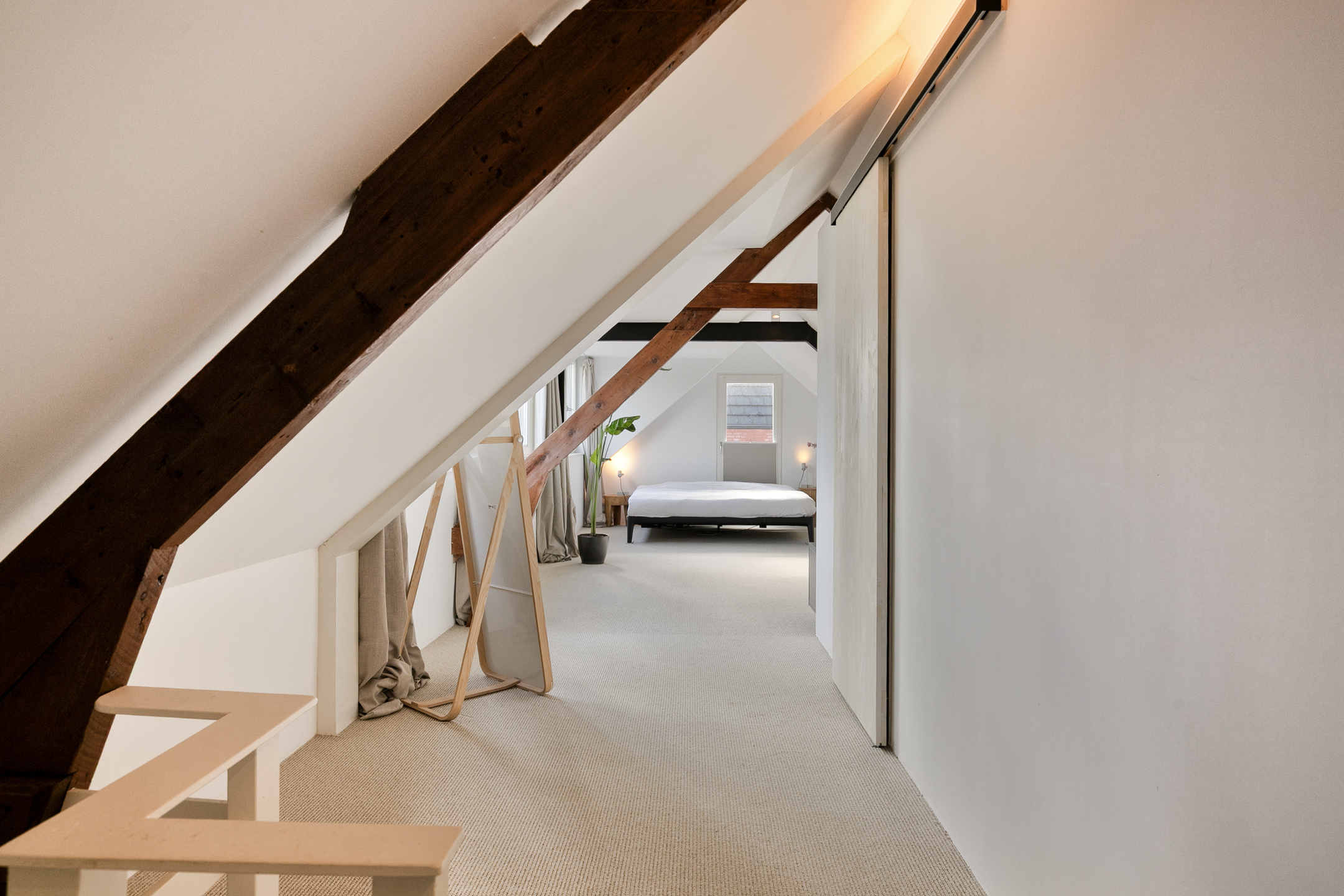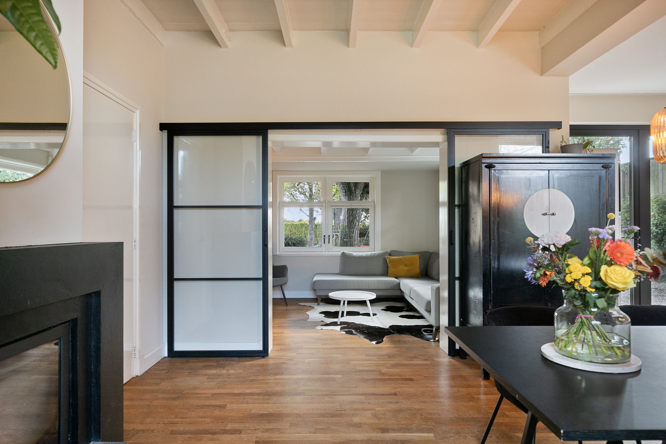 De houten vloeren, hoge balkenplafonds en grote ramen geven de woning een lichte, natuurlijke uitstraling. De stalen schuifdeuren tussen de woonkamer en de woonkeuken zorgt voor een prachtige verbinding tussen de leefruimtes en laat het licht rijkelijk doorstromen.