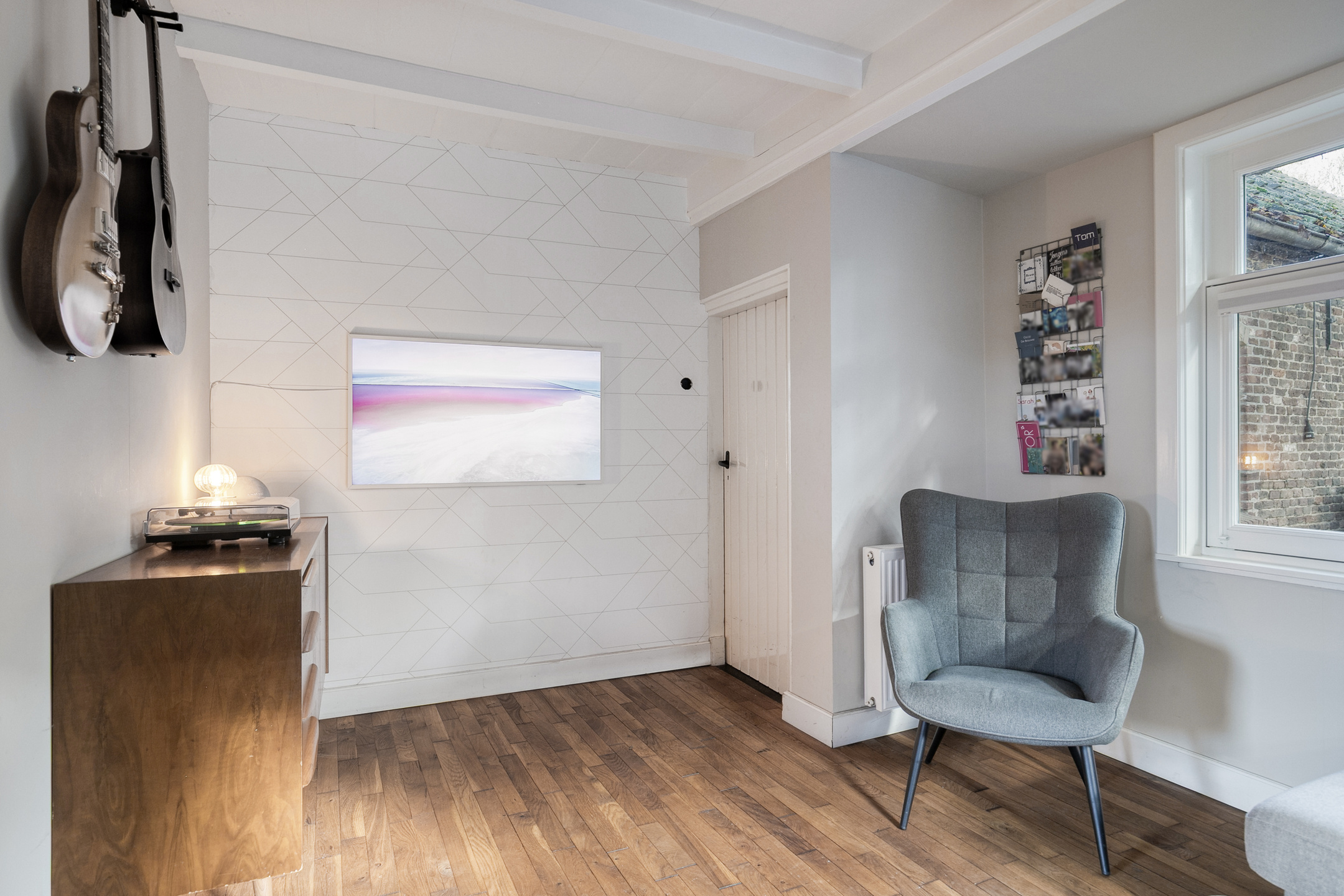 De woonkamer is een fijne, rustige plek om te ontspannen en vormt samen met de woonkeuken een sfeervol geheel.
