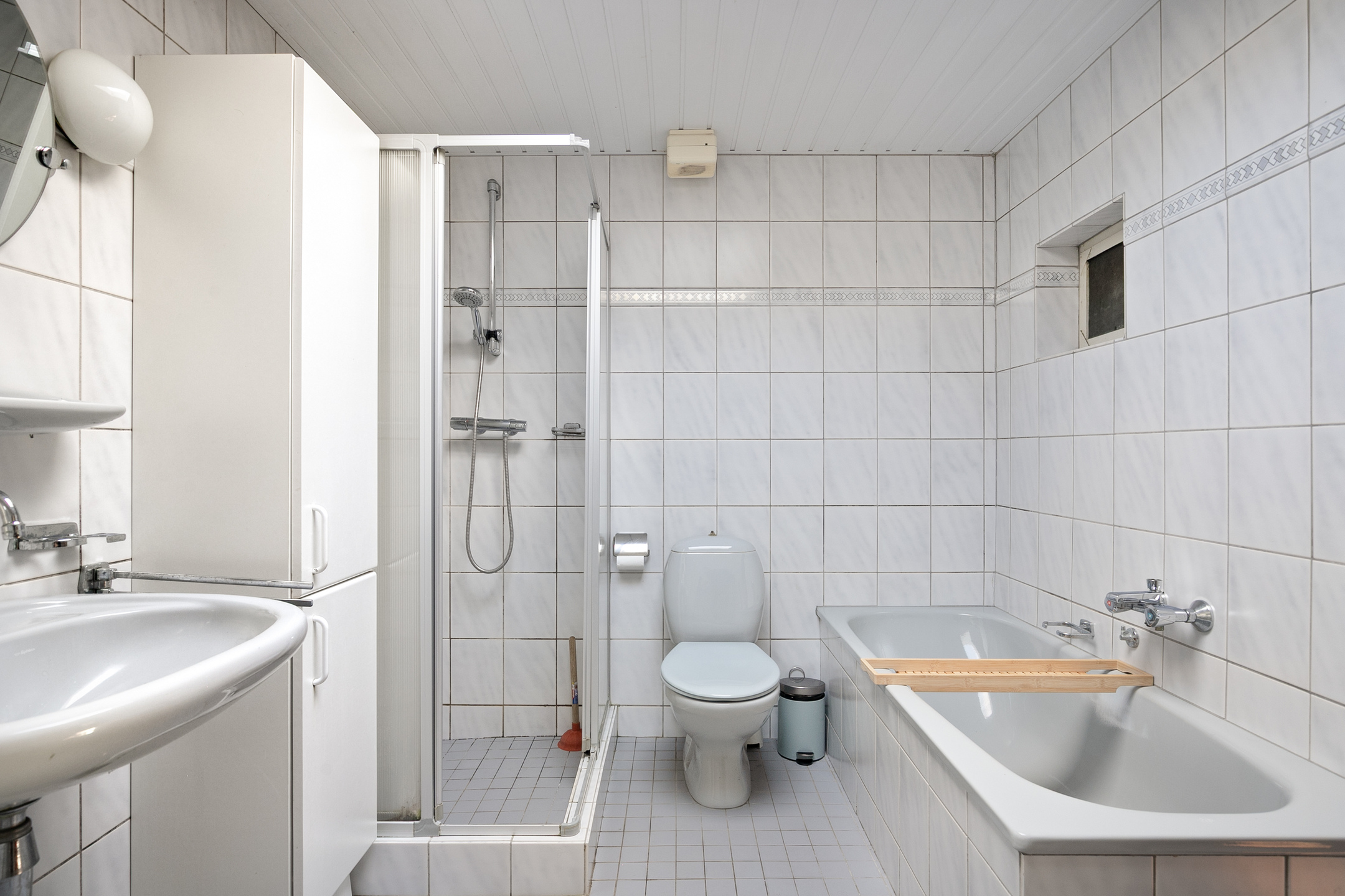 Op de begane grond bevinden zich drie slaapkamers die ook uitstekend te gebruiken zijn als werkkamer of logeerruimte. De praktische badkamer op de begane grond is ruim opgezet en voorzien van een ligbad, douche, dubbele wastafel en toilet.