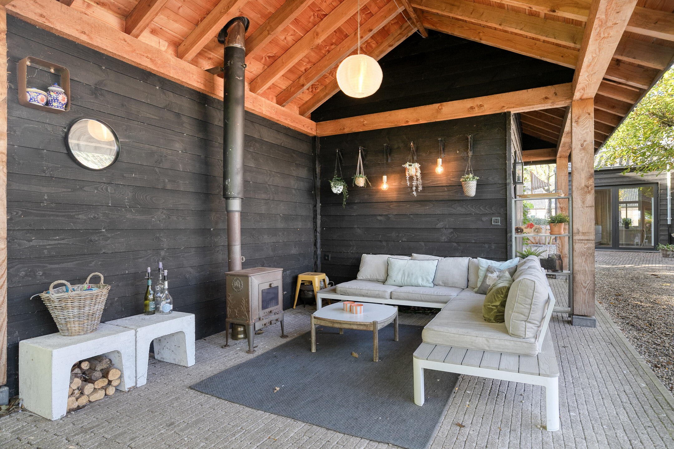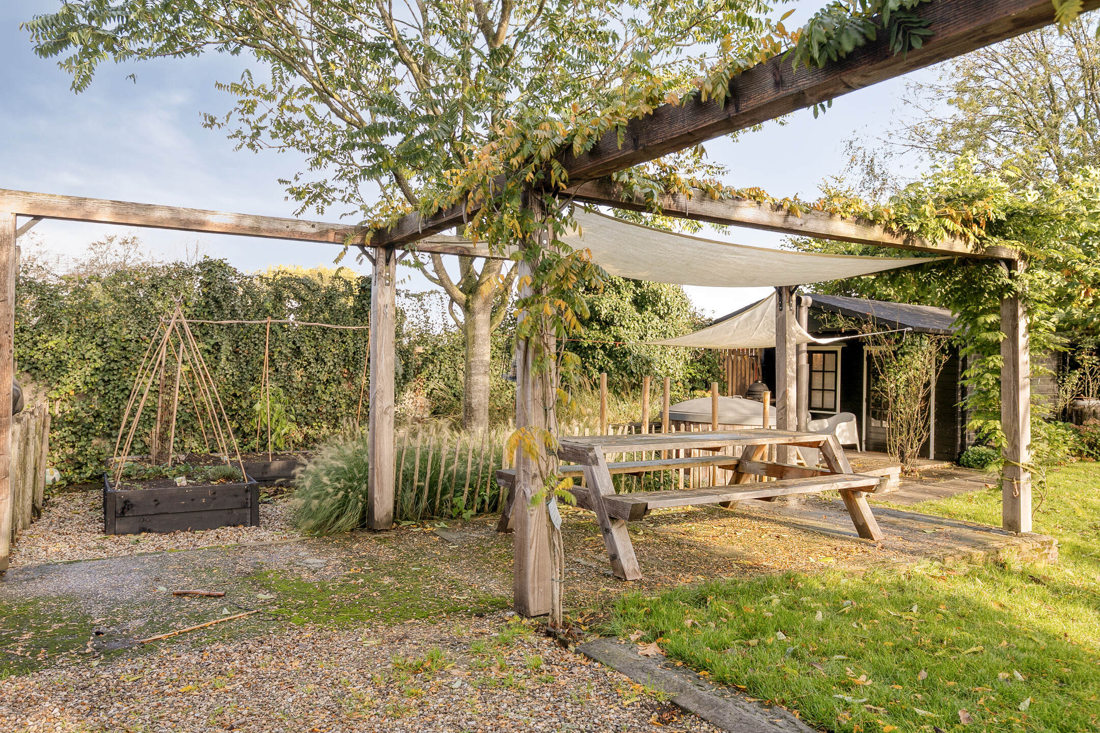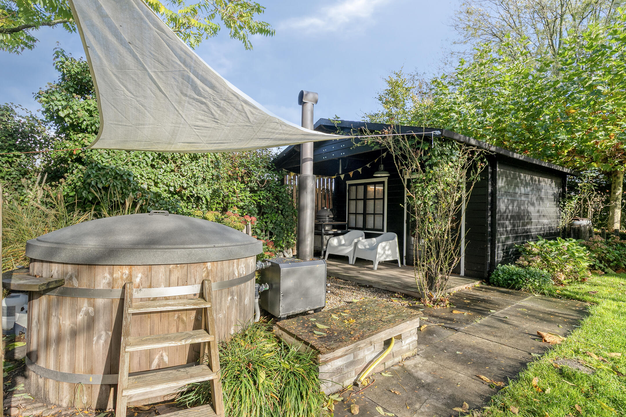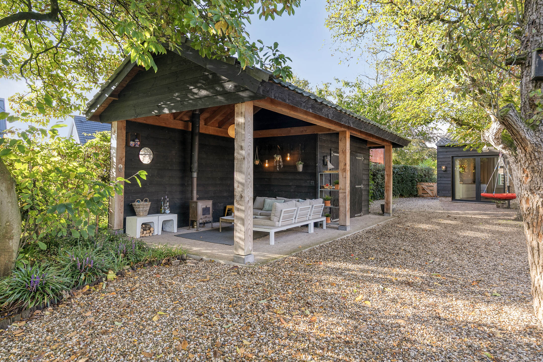 De tuin is een oase van rust en groen. Direct achter het huis vind je een groot terras, een sfeervolle overkapping met houtkachel, een hottub, een tweede berging en volop ruimte om te genieten van het buitenleven.