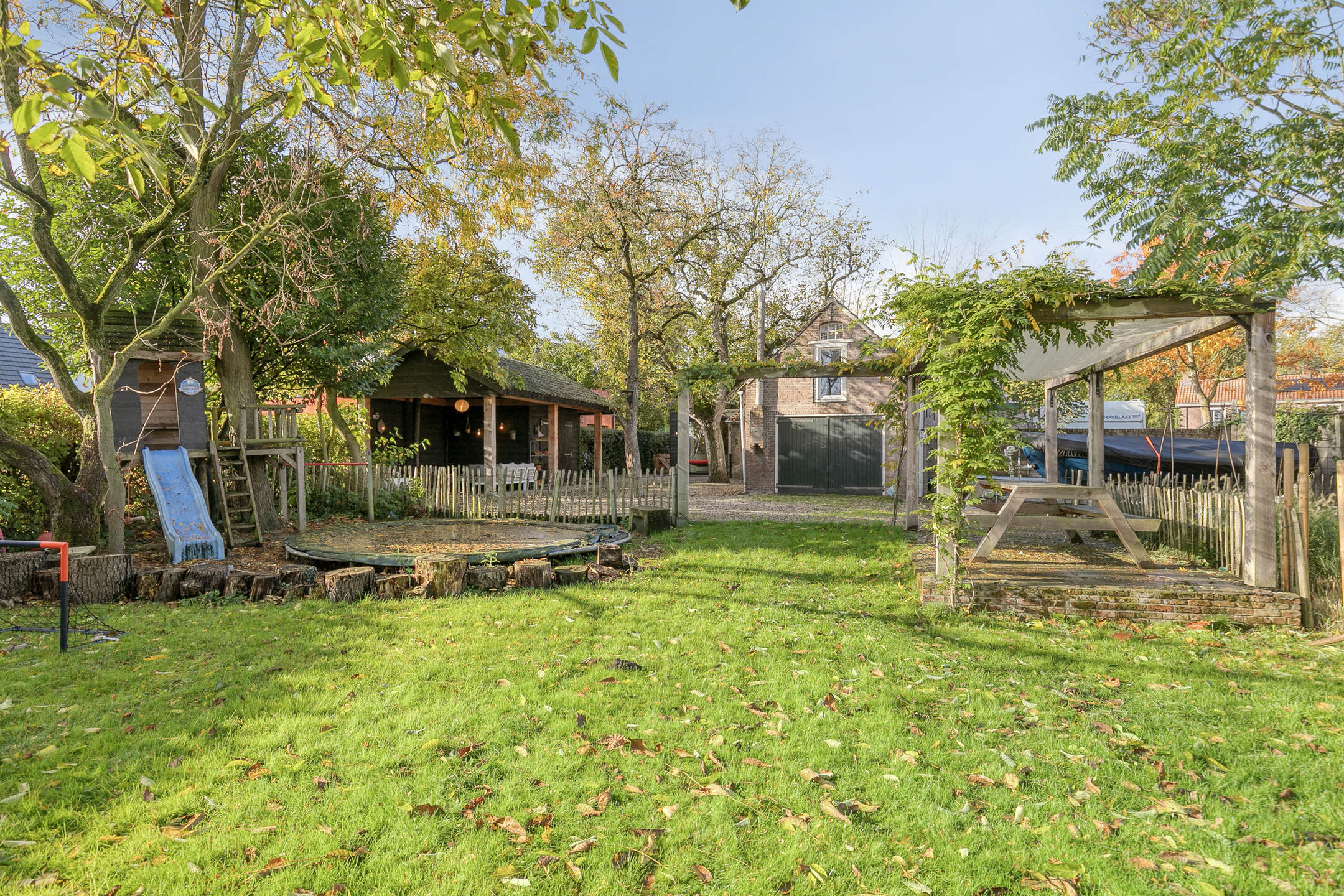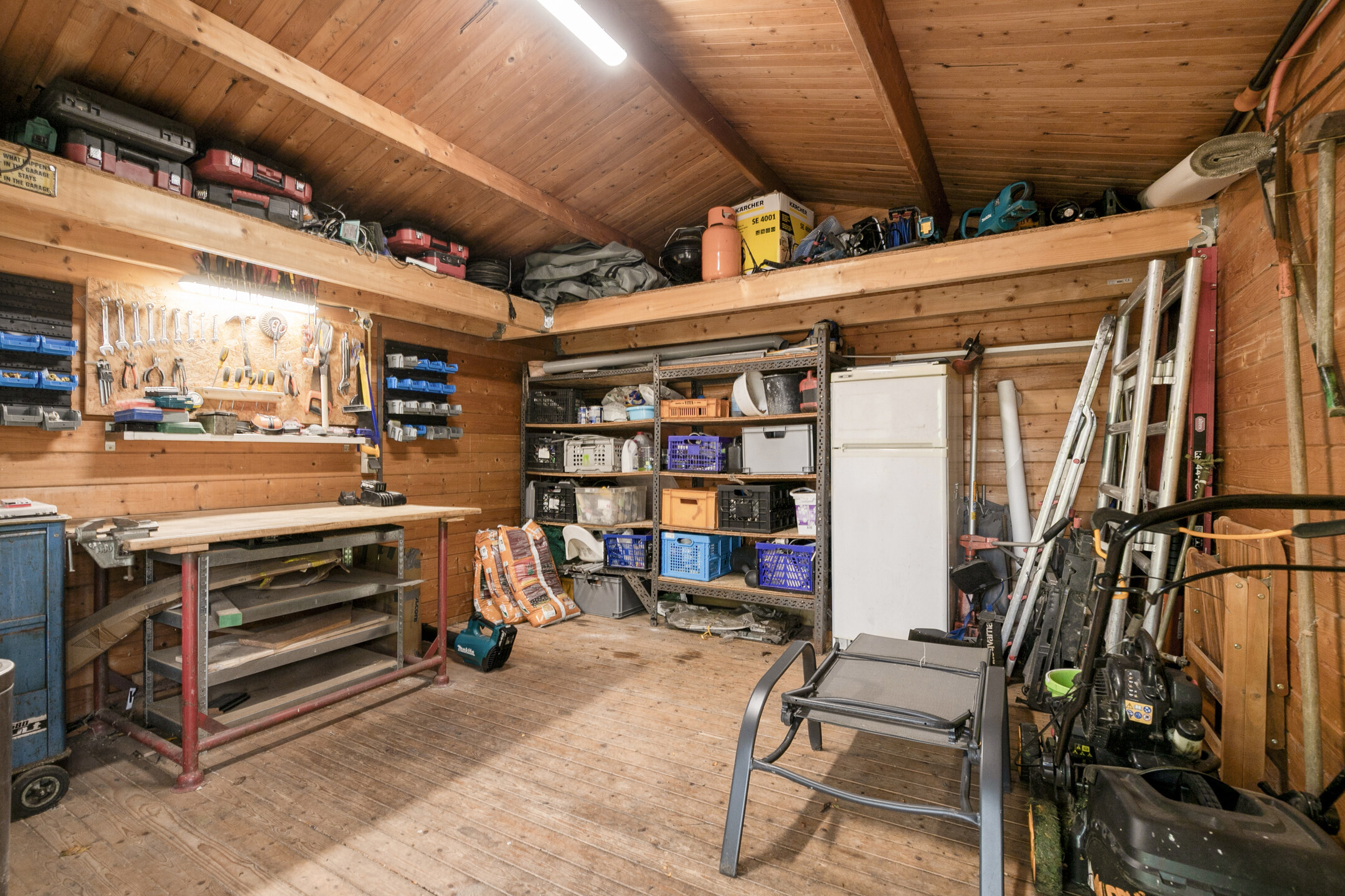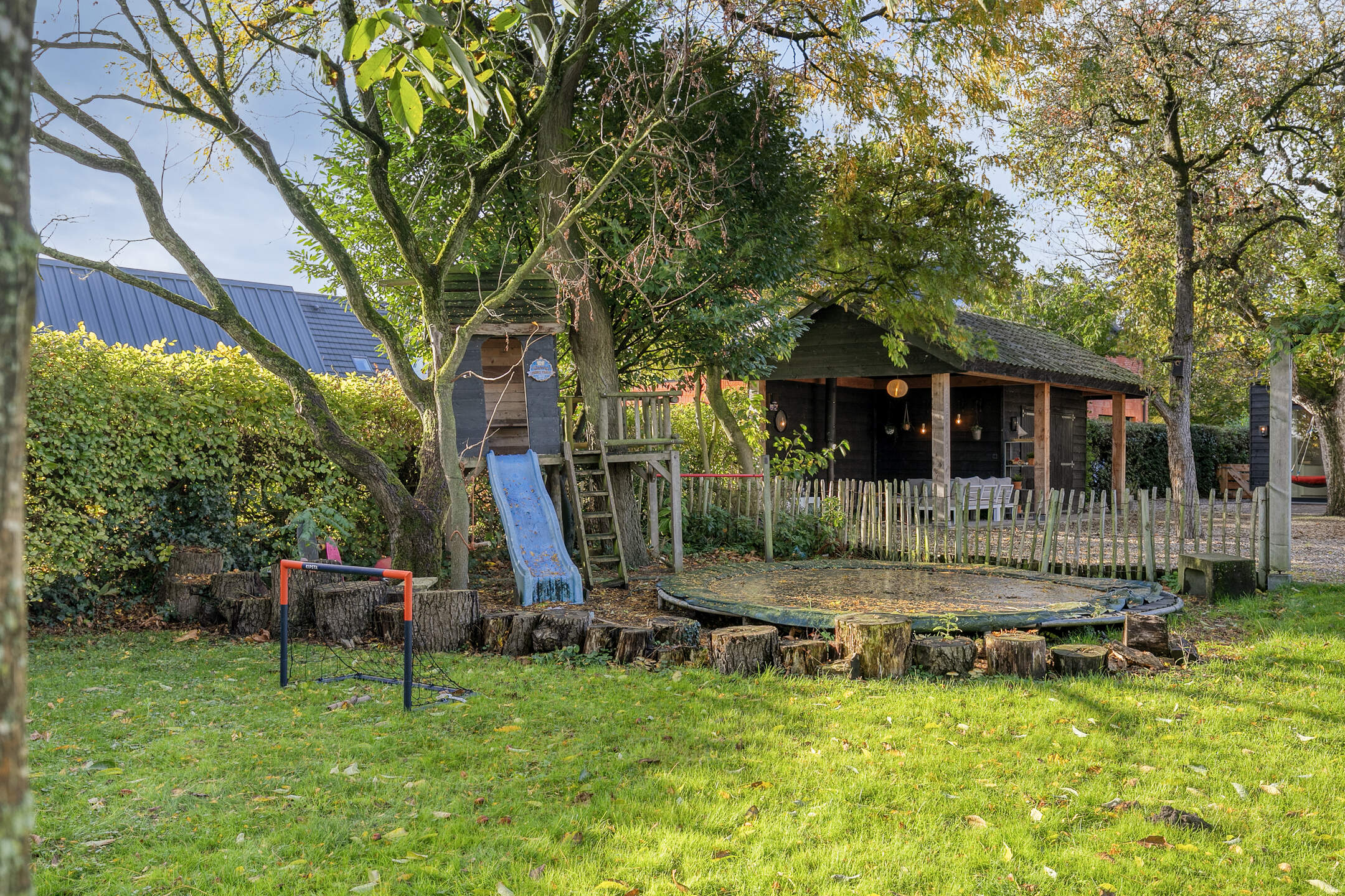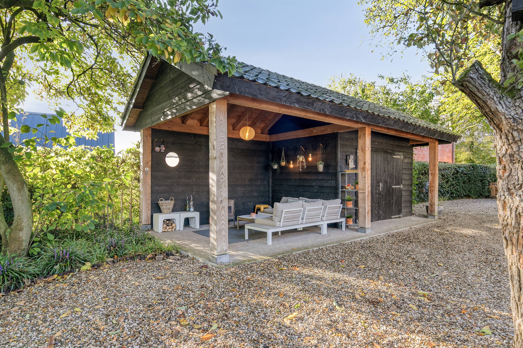 De tuin is een oase van rust en groen. Direct achter het huis vind je een groot terras, een sfeervolle overkapping met houtkachel, een hottub, een tweede berging en volop ruimte om te genieten van het buitenleven.