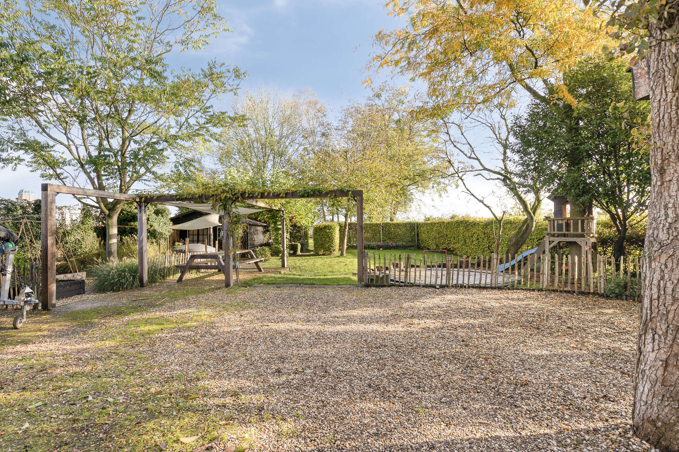 Een natuurlijke verlenging van het perceel is het eigen stukje bos achter in de tuin, waar vogels zingen, kinderen hutten kunnen bouwen en je geniet van de seizoenen.