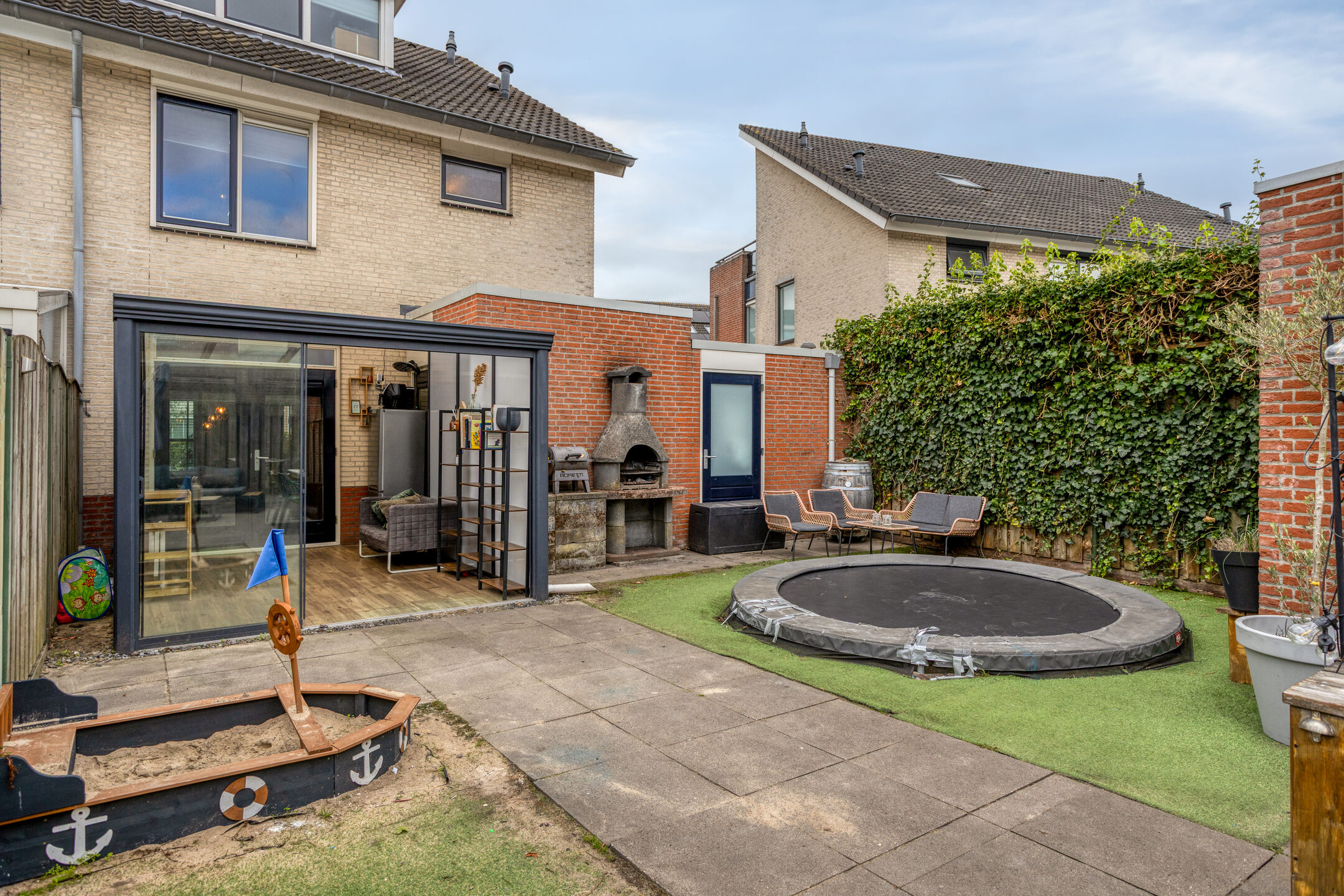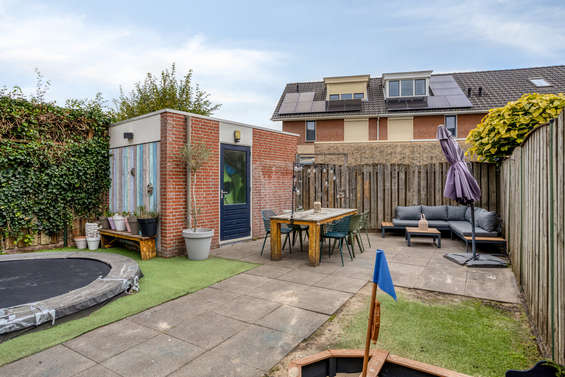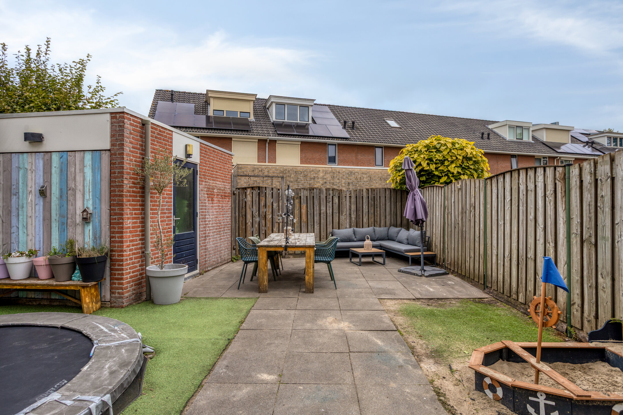 De tuin is speels aangelegd met kunstgras en tegelbestrating. Achterin staat een degelijk gemetselde berging. Via de poort is een praktische achterom aanwezig.