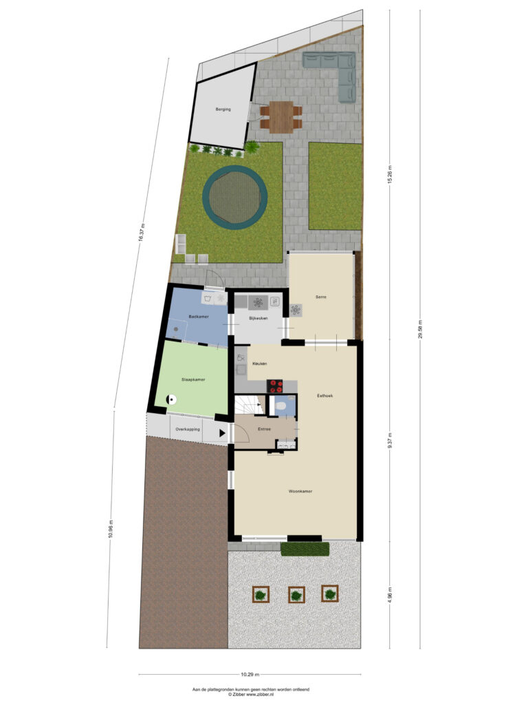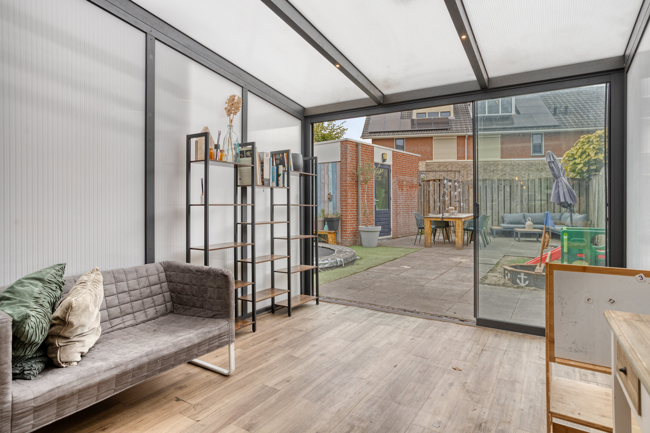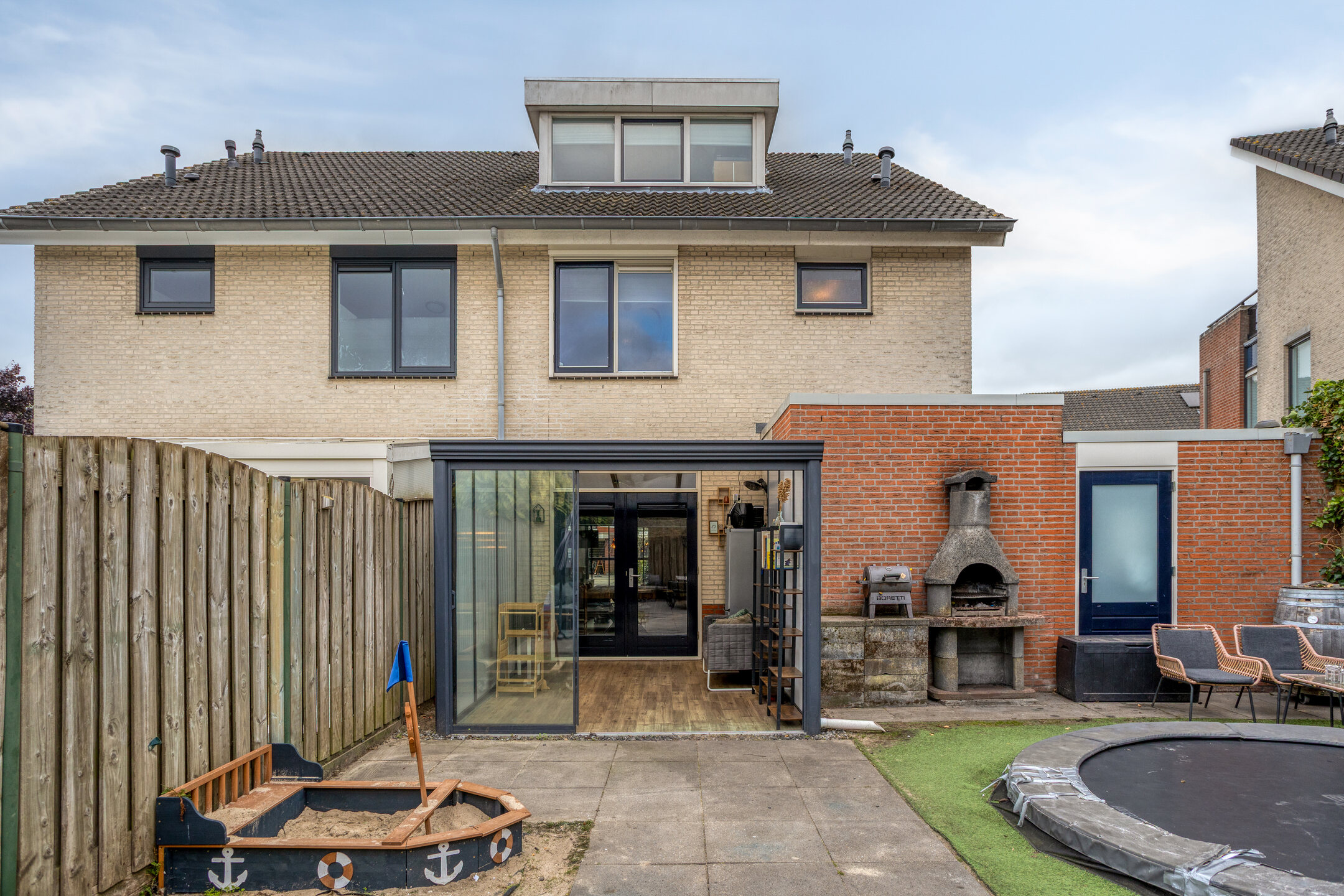 De tuin is speels aangelegd met kunstgras en tegelbestrating. Achterin staat een degelijk gemetselde berging. Via de poort is een praktische achterom aanwezig.