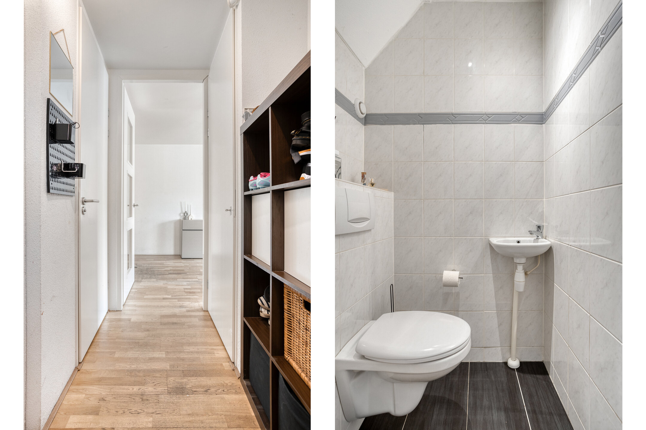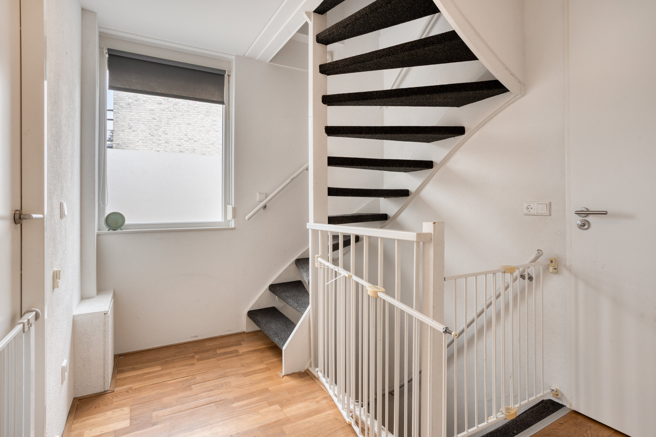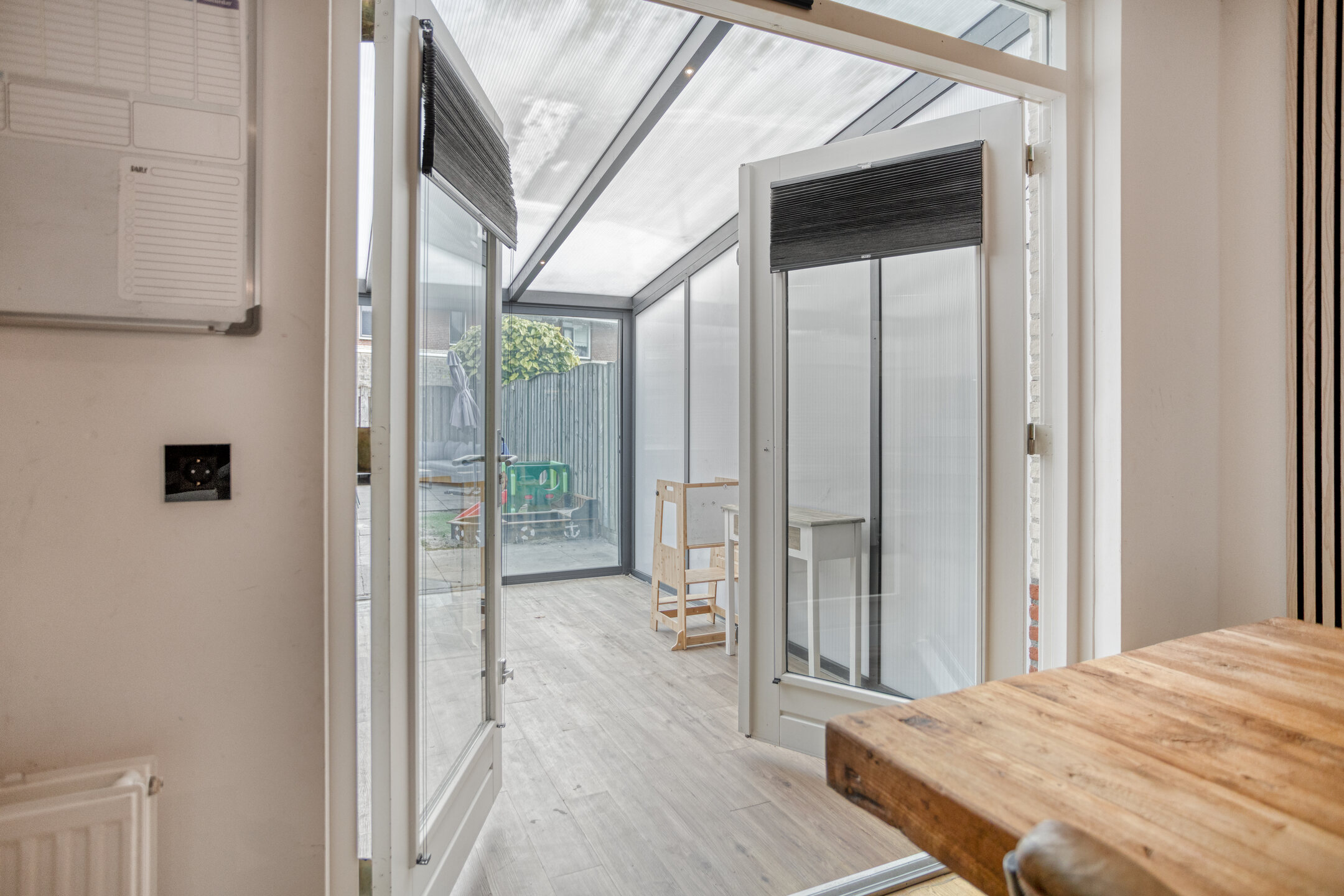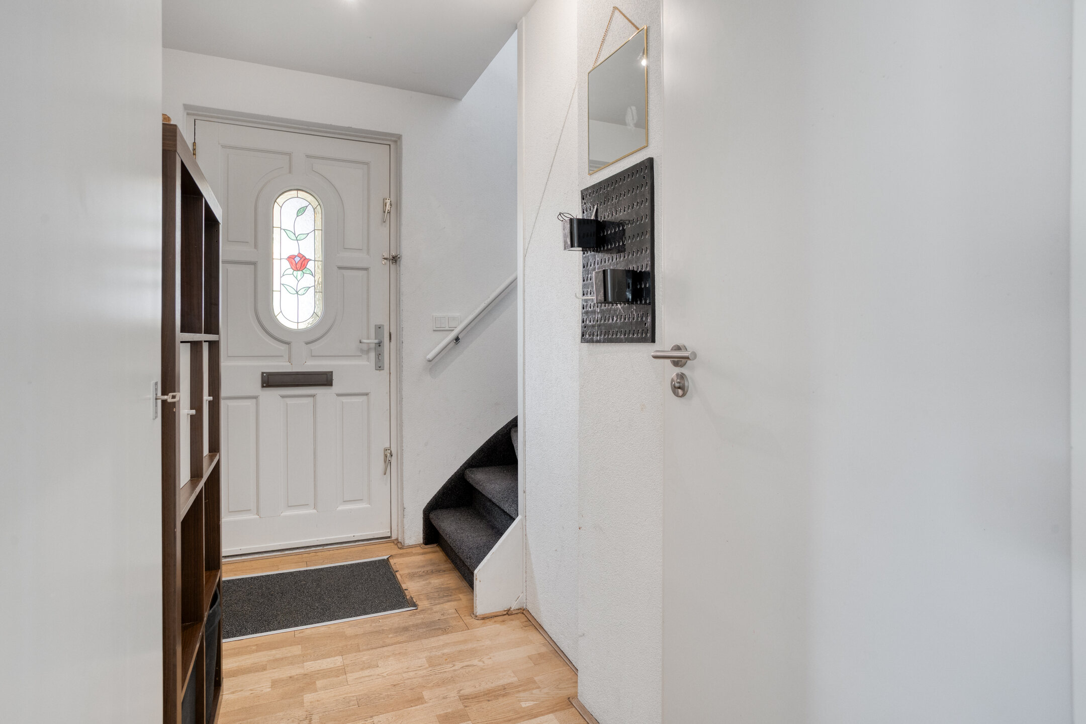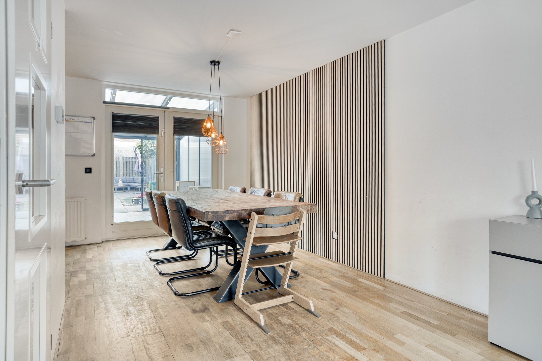 Entree/hal met trapopgang, garderobenis, bergruimte en meterkast (10 groepen, 2 aardlekschakelaars). Vanuit de hal toegang tot de lichte woonkamer aan de voorzijde en de eetkamer aan de achterzijde met tuindeuren naar de serre (2020).