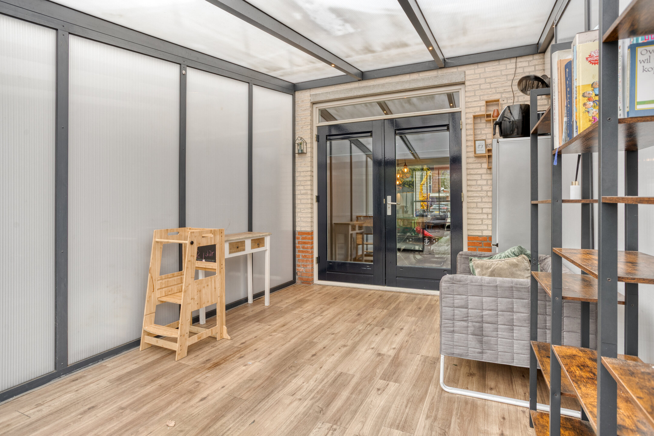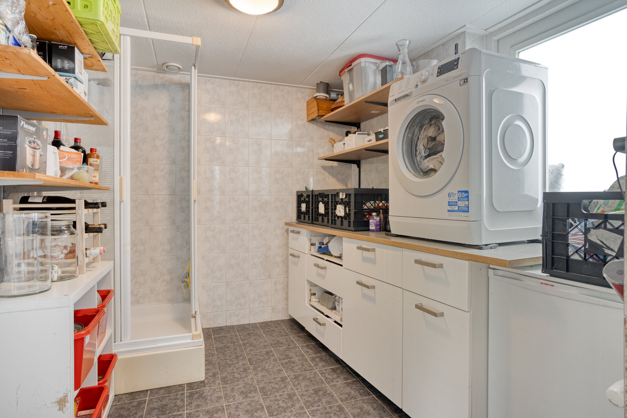 Aangrenzend bevindt zich de bijkeuken met aansluitingen voor wasmachine en droger én een douchecabine. Deze verdieping beschikt daarnaast over een praktische multifunctionele ruimte die gebruikt kan worden als kantoor, speelkamer of extra slaapkamer – ideaal voor een beroep aan huis of levensloopbestendig wonen.