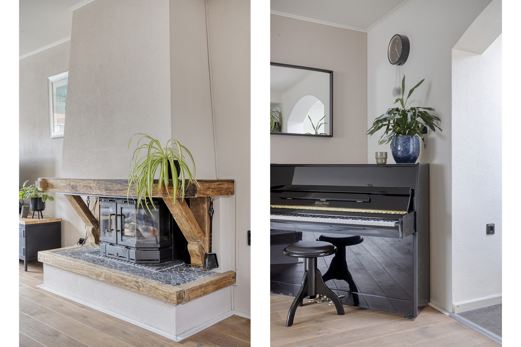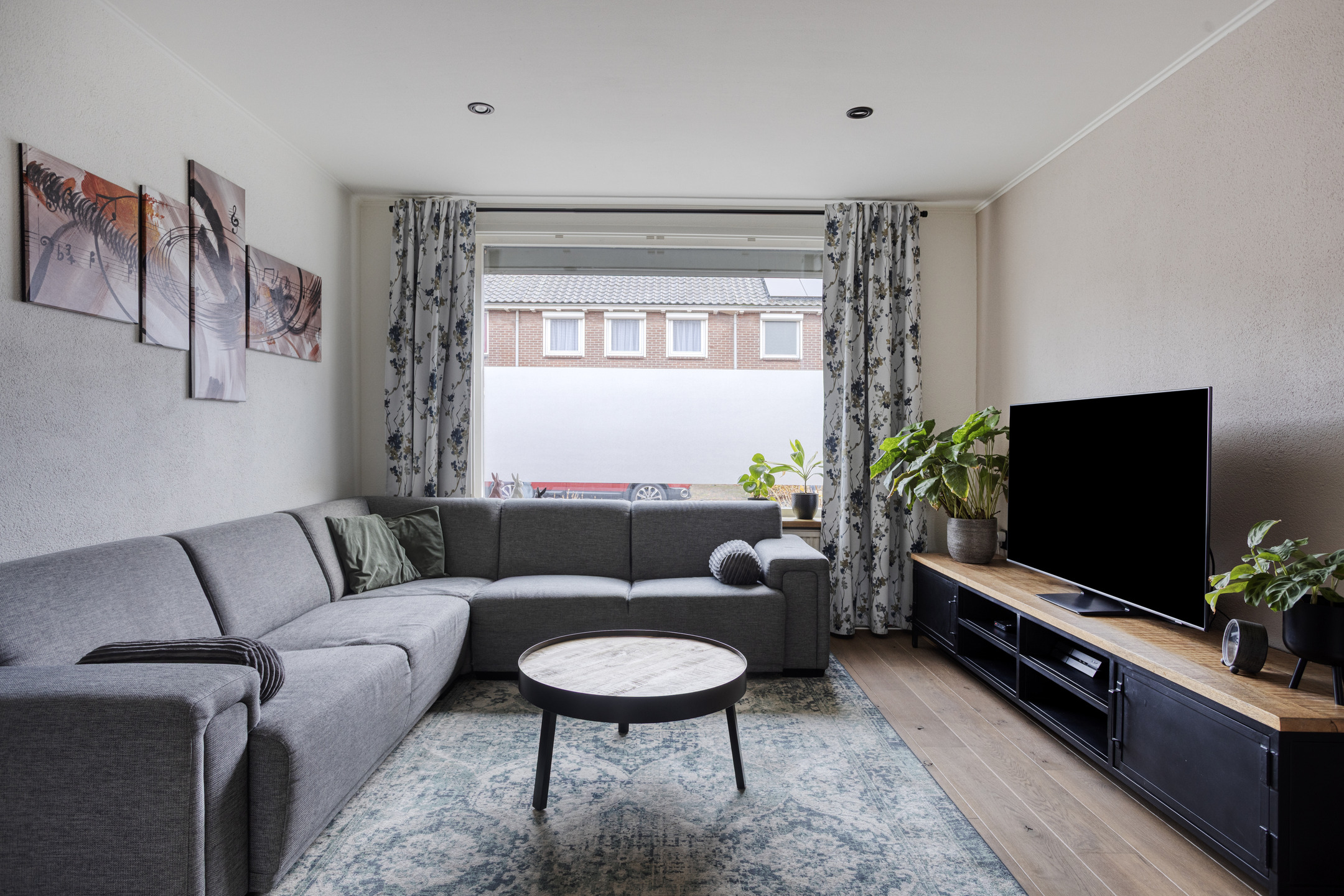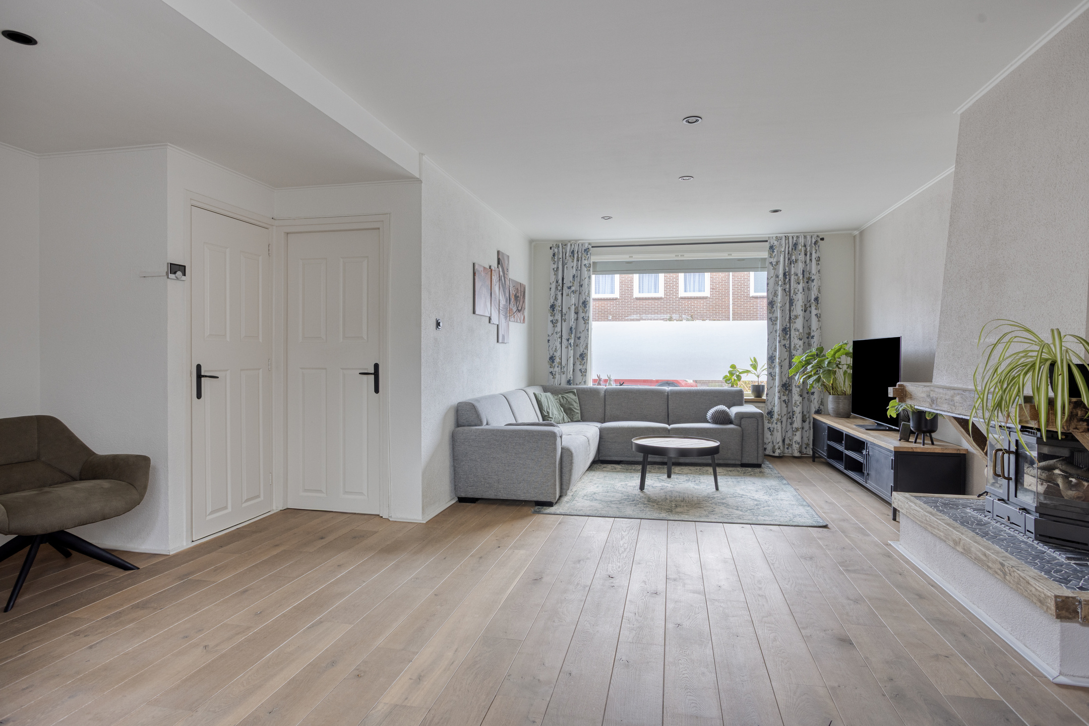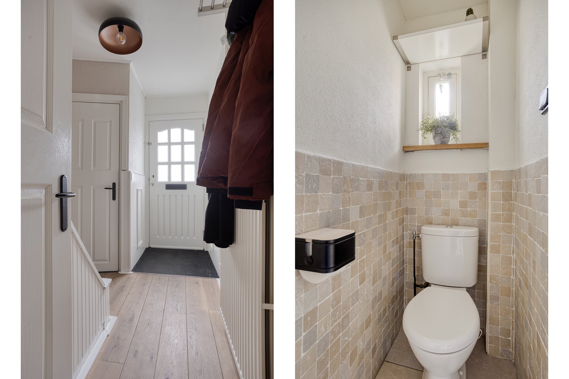 De entree biedt toegang tot de trapopgang, het toilet, de trapkast en de woonkamer. In de trapkast bevindt zich de provisieruimte en de meterkast, voorzien van acht groepen en twee aardlekschakelaars. De woonkamer ligt aan de voorzijde en heeft een houten vloer met whitewash, wanden met fijne korrel en een strak gestuct plafond. Een houtkachel zorgt voor extra sfeer.