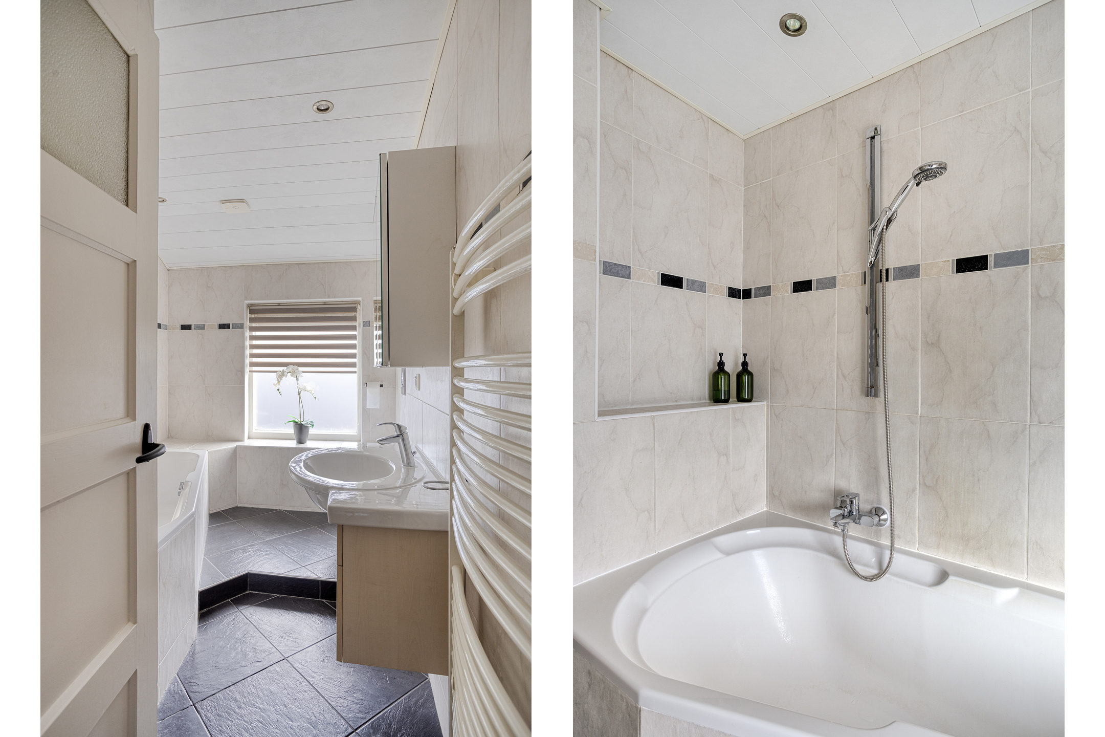 De badkamer is volledig betegeld en beschikt over een ligbad, toilet, designradiator en wastafelmeubel.