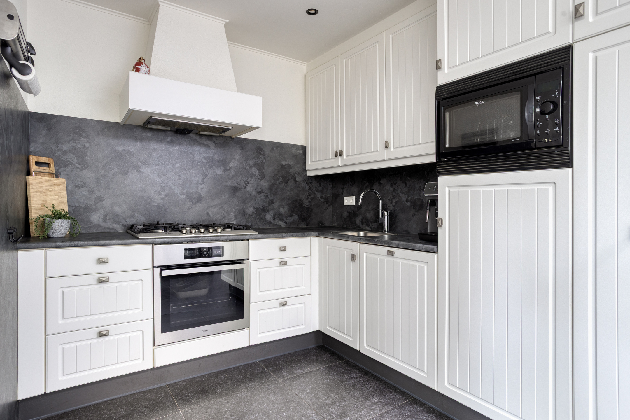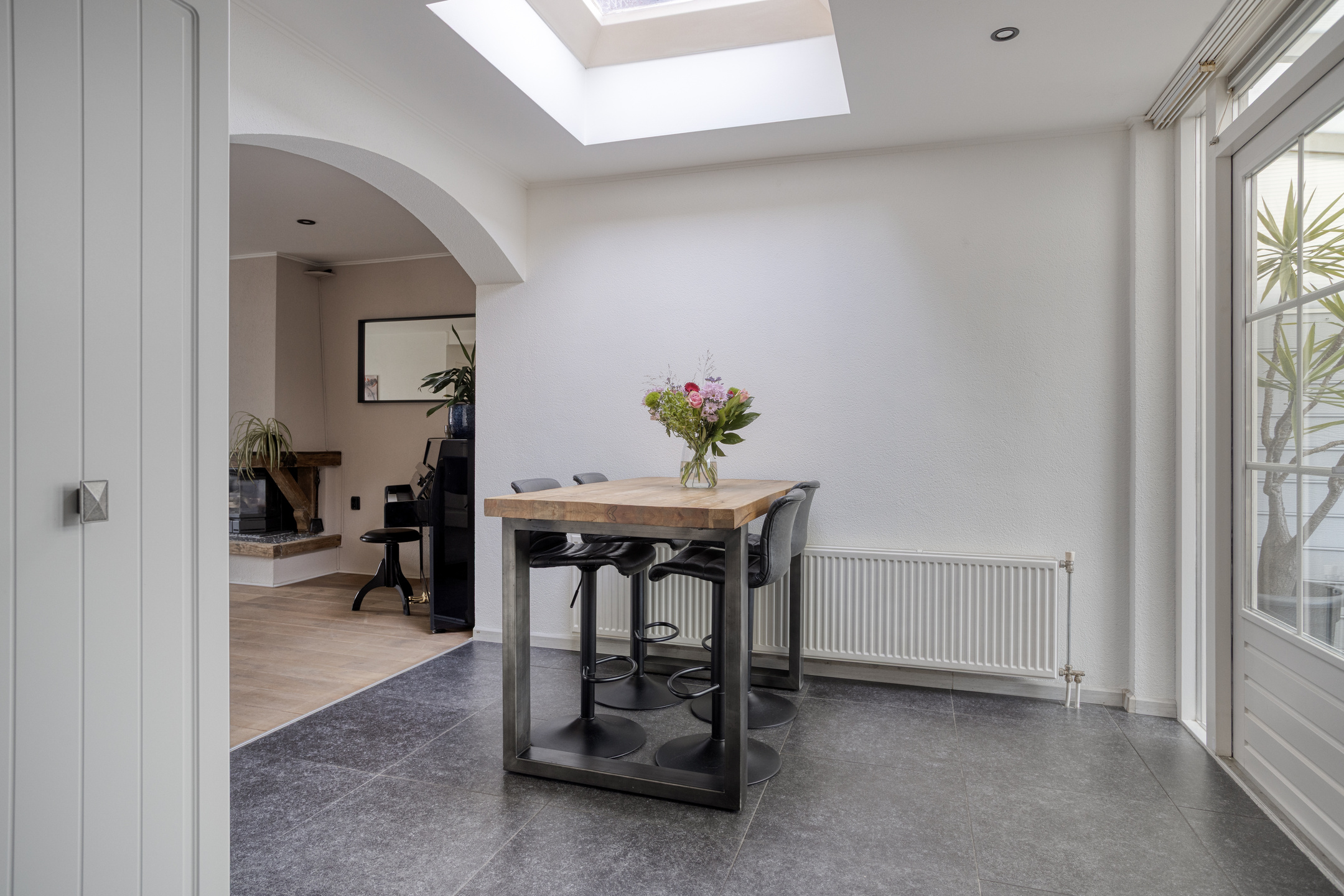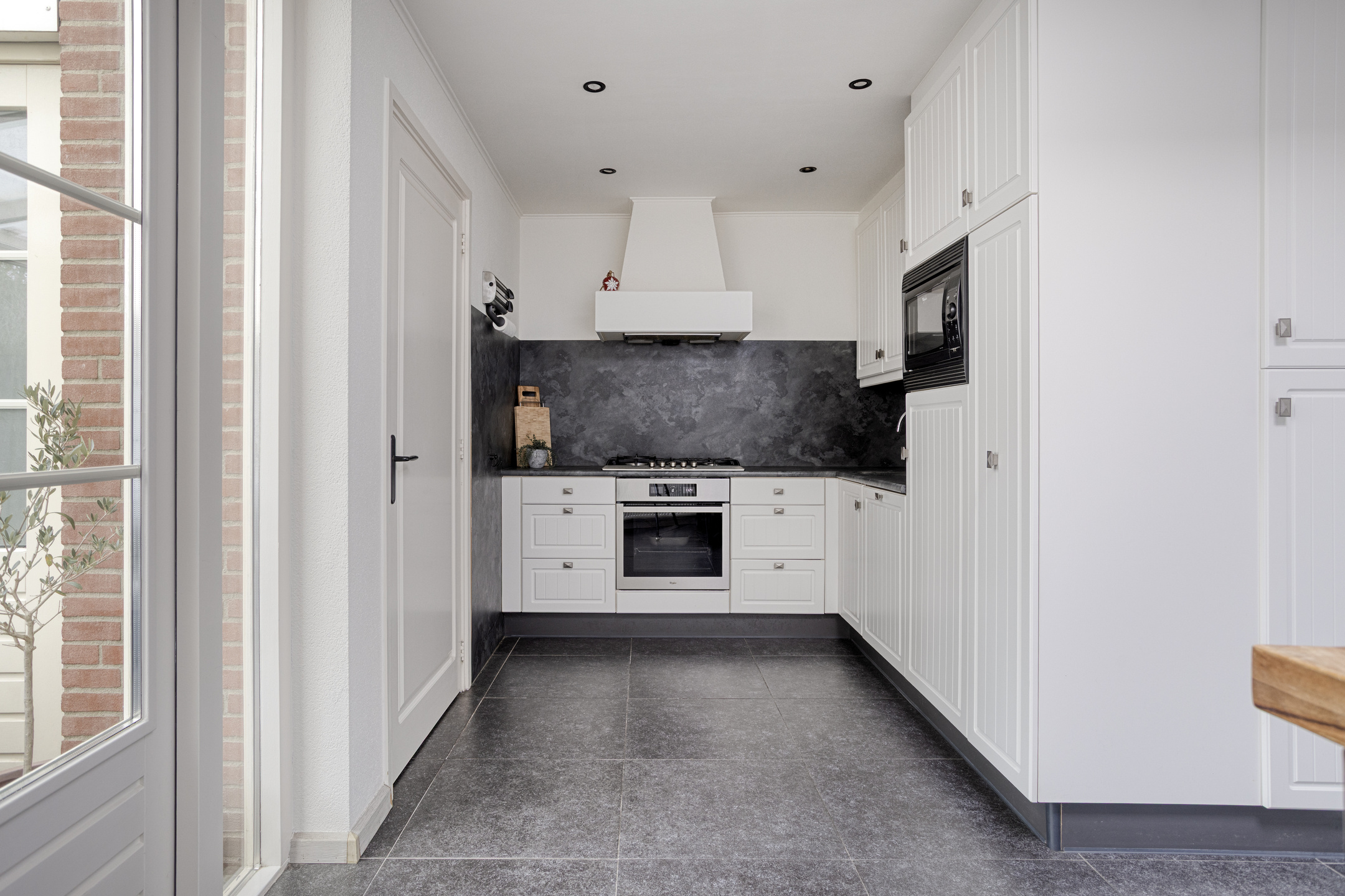 Aan de achterzijde bevindt zich de keuken, geplaatst in de uitbouw en uitgevoerd in een sfeervolle stijl passend bij de woning. De keuken is uitgerust met een combi-oven/magnetron, oven, koelkast, vaatwasser, een vijf-pits gaskookplaat en een afzuigschouw. De tegelvloer loopt door in de bijkeuken waar de wasmachine en droger opgesteld zijn. Vanuit de keuken geven dubbele tuindeuren toegang tot de fraaie serre, die met een schuifwand in verbinding staat met de diepe achtertuin.