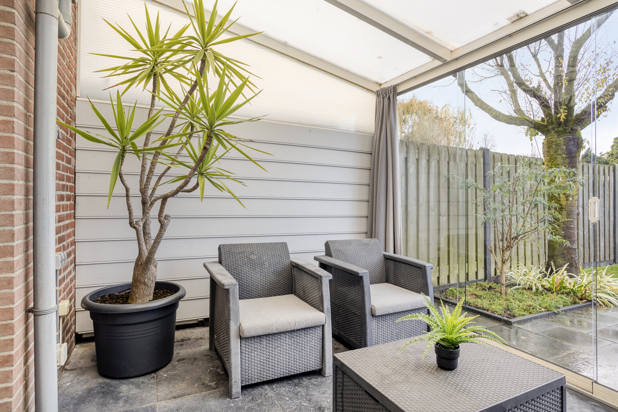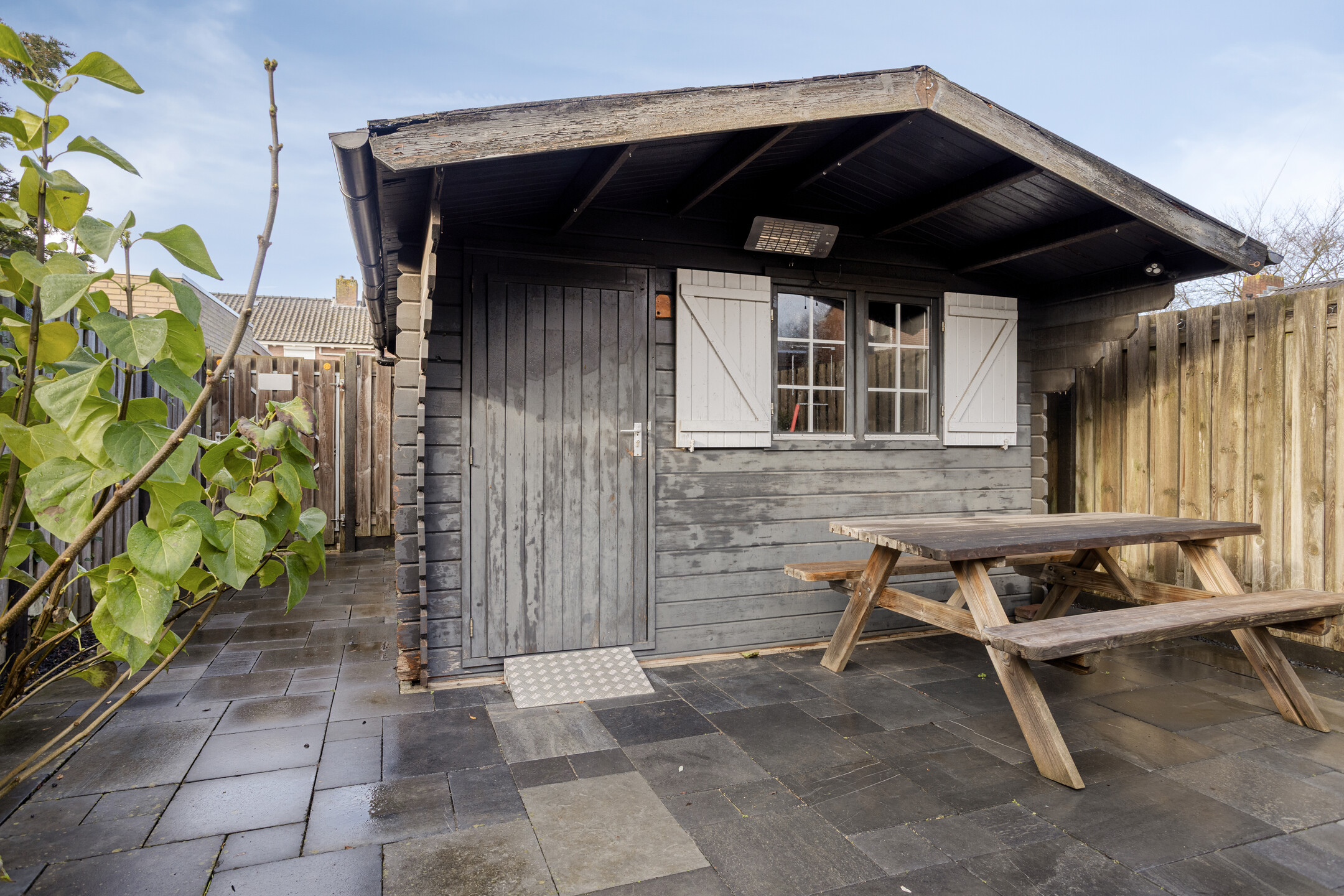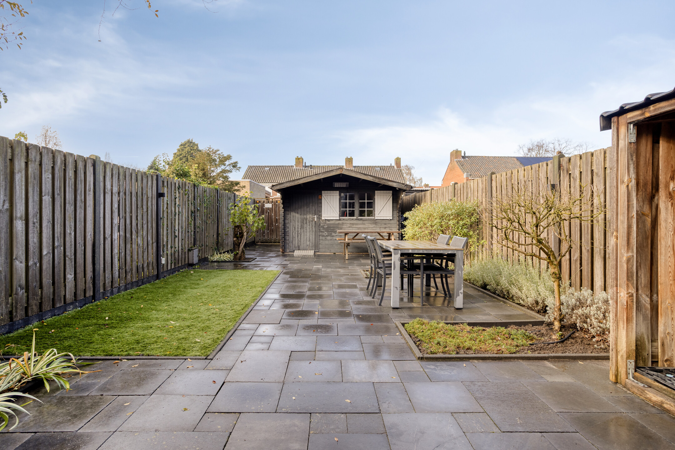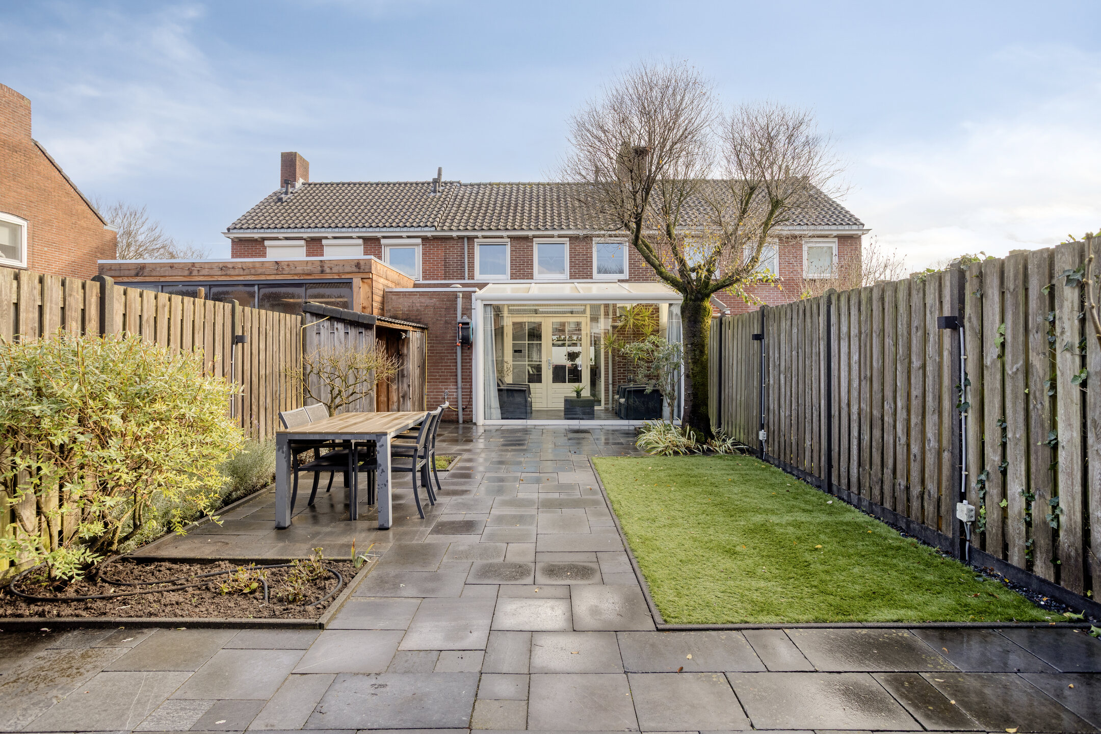 De achtertuin is maar liefst zeventien meter diep en biedt veel rust en privacy. De tuin is ingericht met nette tegelbestrating, een kunstgras gazon en plantenborders. Achterin staat een houten berging met elektra en via de poort is een achterom aanwezig. De serre vormt een heerlijke plek om van het buitenleven te genieten, ongeacht het seizoen.
