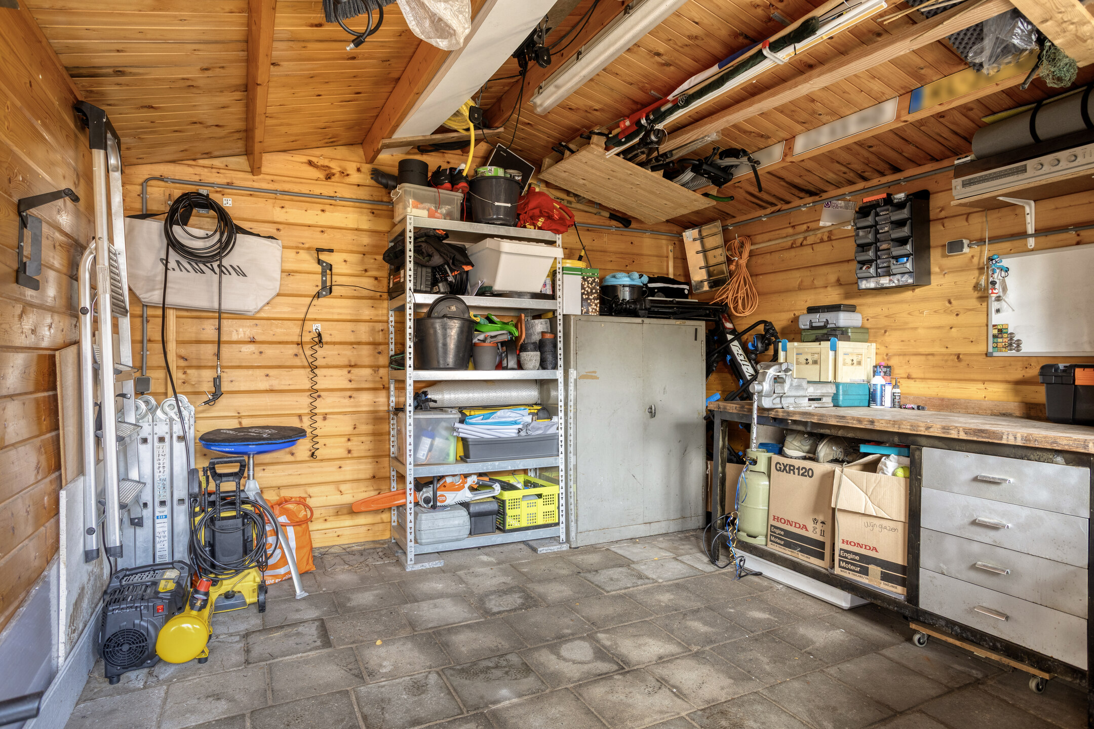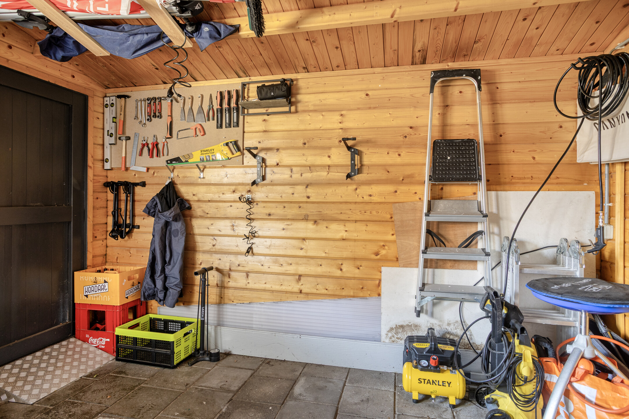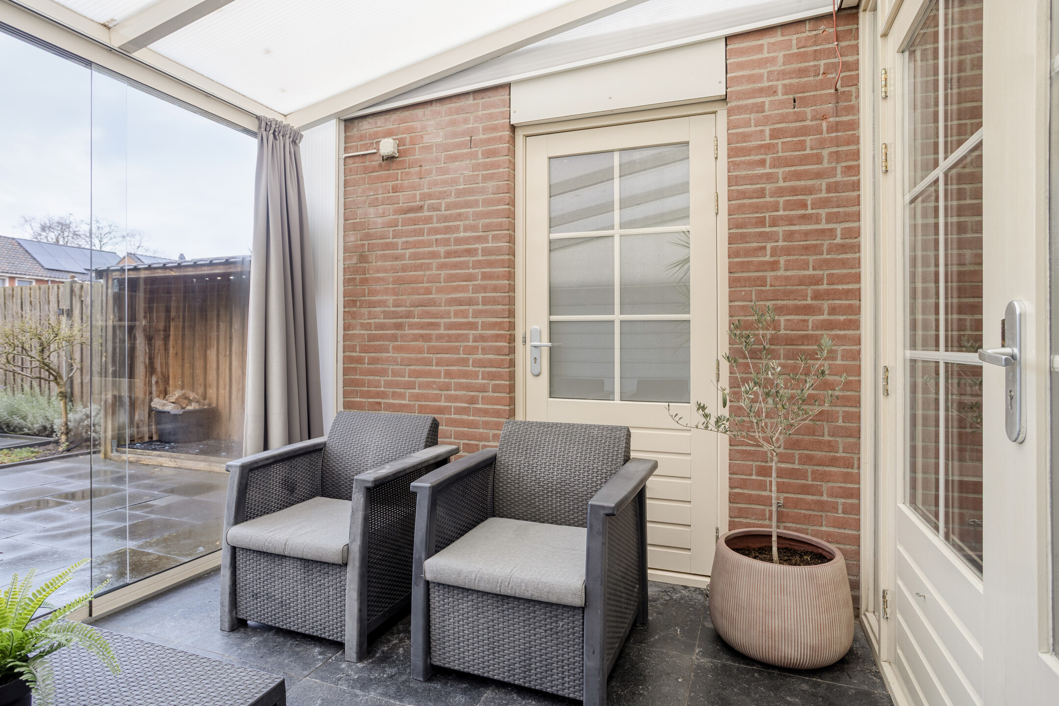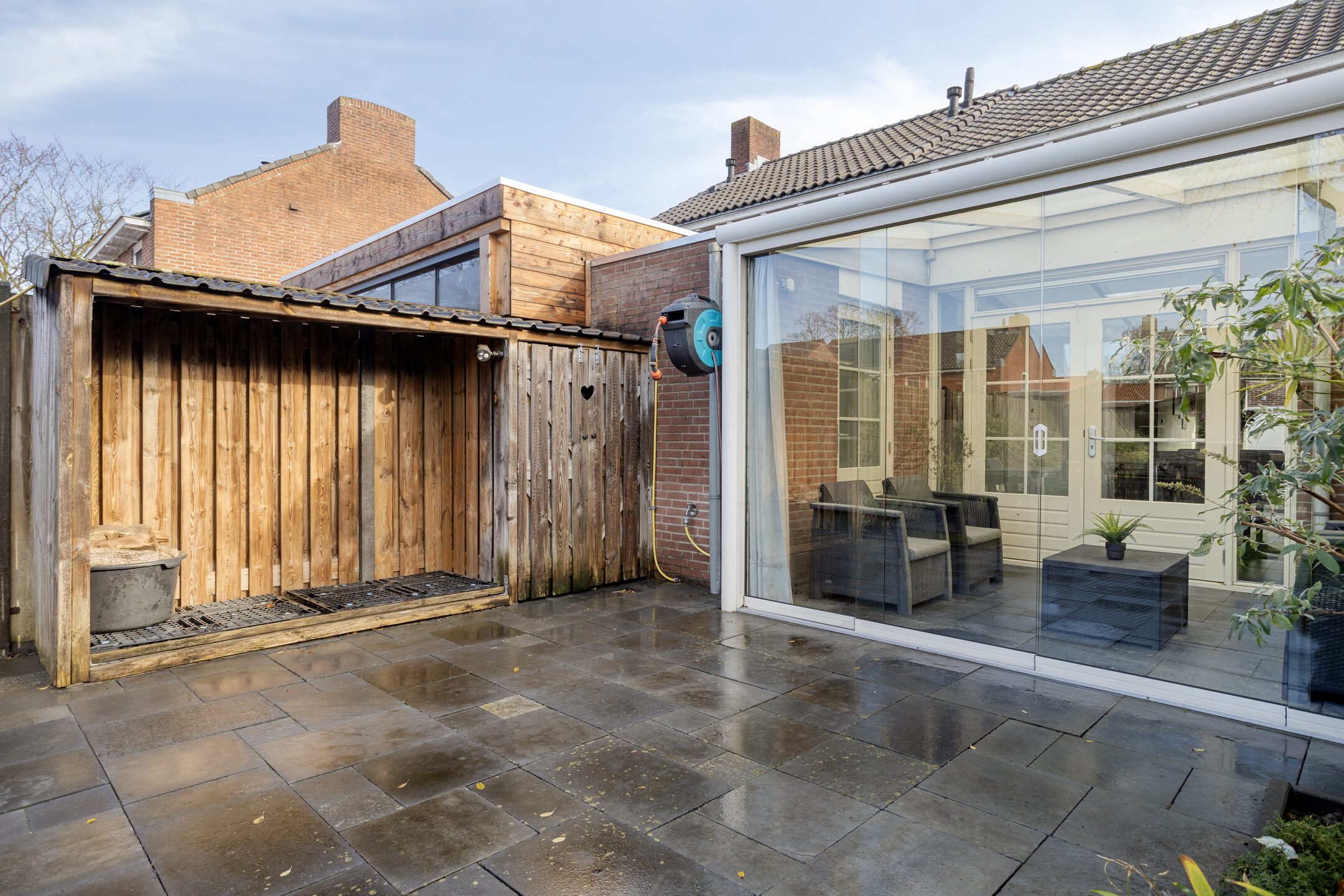 De achtertuin is maar liefst zeventien meter diep en biedt veel rust en privacy. De tuin is ingericht met nette tegelbestrating, een kunstgras gazon en plantenborders. Achterin staat een houten berging met elektra en via de poort is een achterom aanwezig. De serre vormt een heerlijke plek om van het buitenleven te genieten, ongeacht het seizoen.