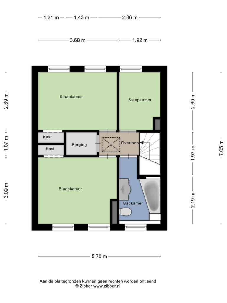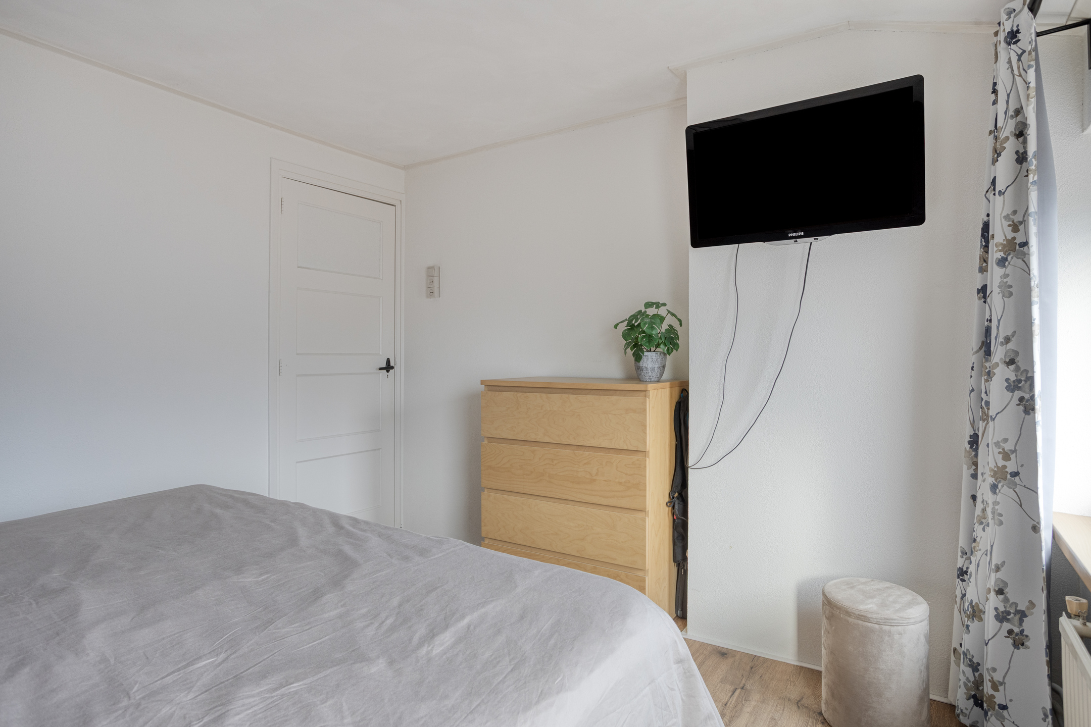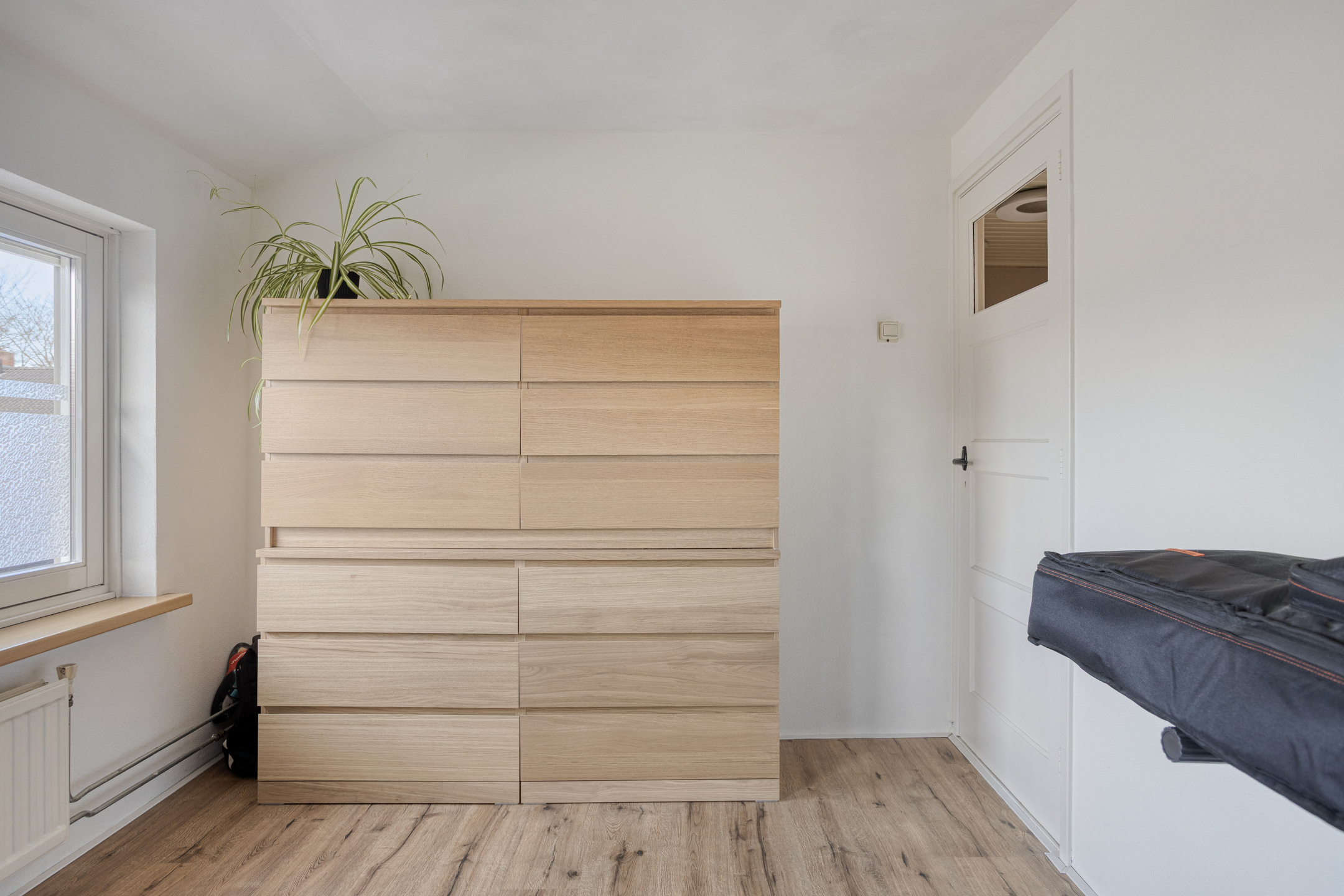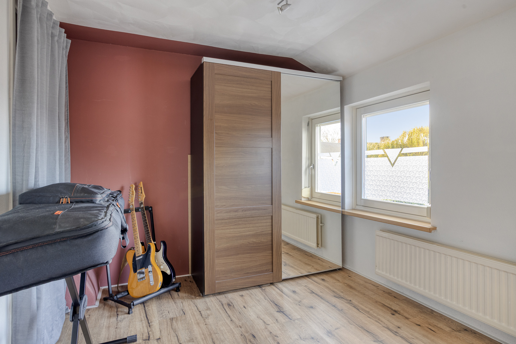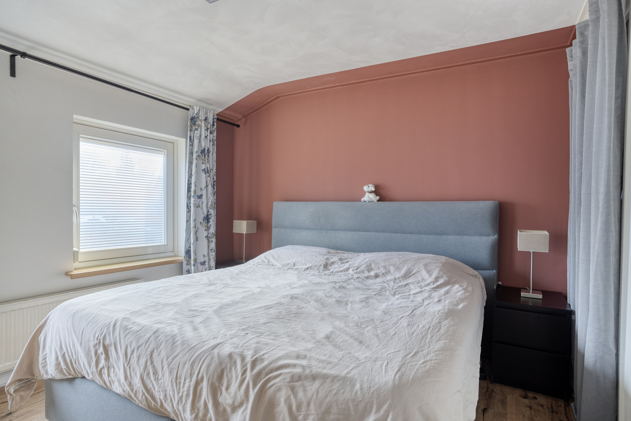De overloop biedt toegang tot de badkamer, drie slaapkamers en een bergkast. Via een vlizoluik is de bergzolder bereikbaar. De hoofdslaapkamer aan de voorzijde beschikt over een vaste kast. Aan de achterzijde liggen twee slaapkamers. De gehele verdieping is in 2022 voorzien van nieuwe laminaatvloeren en afgewerkt met wanden met fijne korrel en plafonds in schuurwerk.