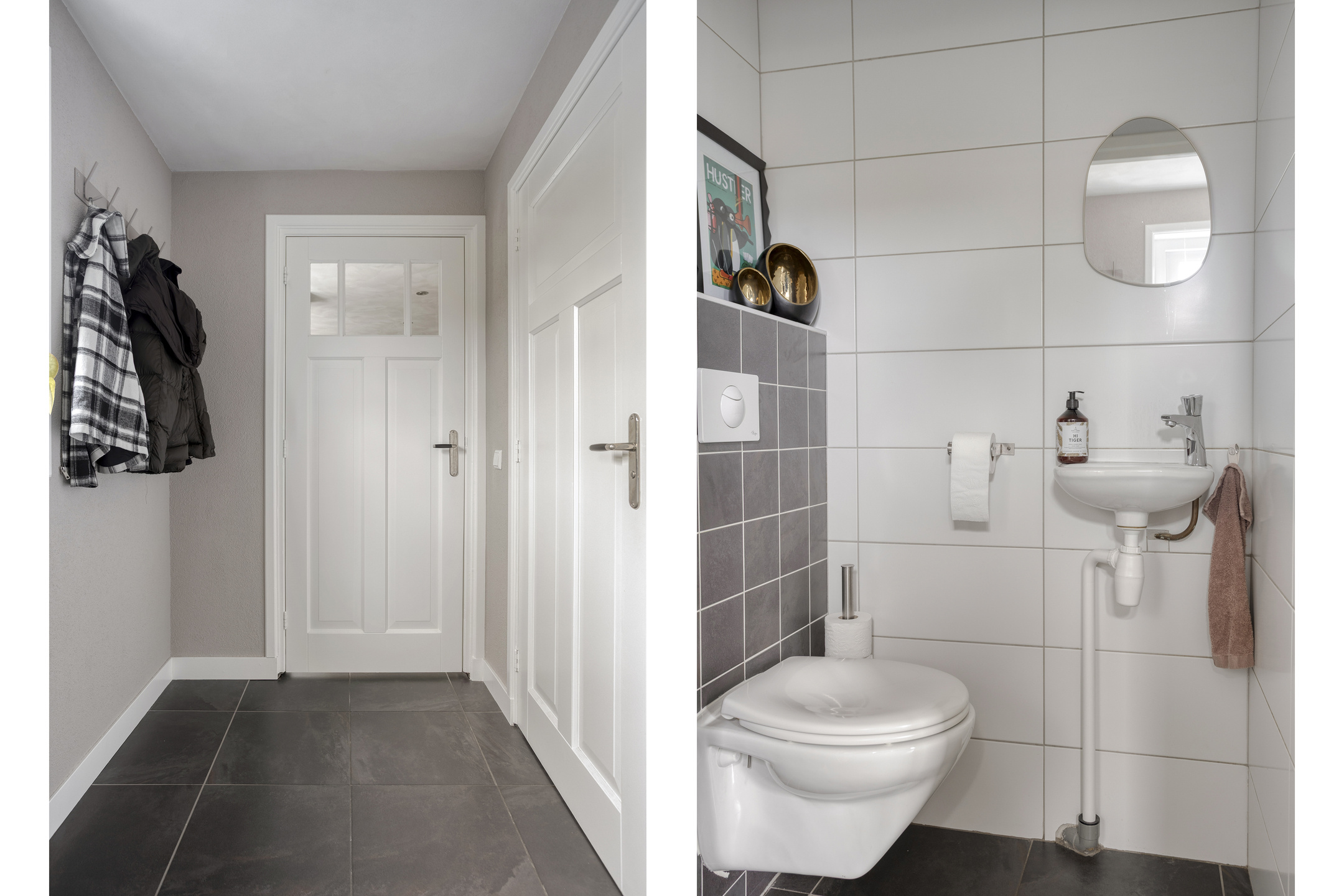 Aansluitend bevindt zich de bijkeuken. Hier zijn de wasmachine en droger netjes weggewerkt in een ingebouwde kast, wat zorgt voor een opgeruimd geheel. Daarnaast is er een toiletruimte aanwezig en bevindt zich hier de opstelplaats van de cv-ketel .