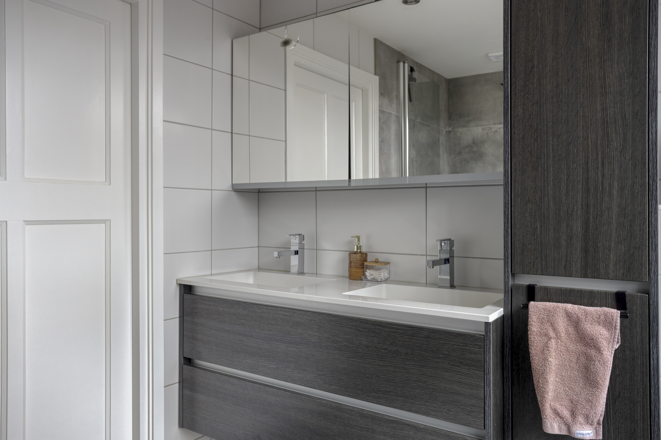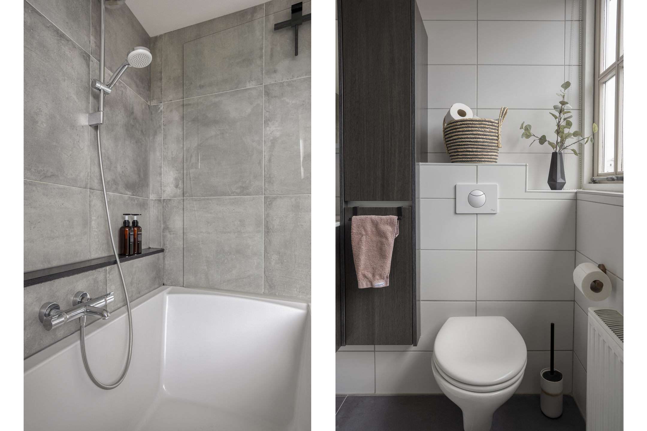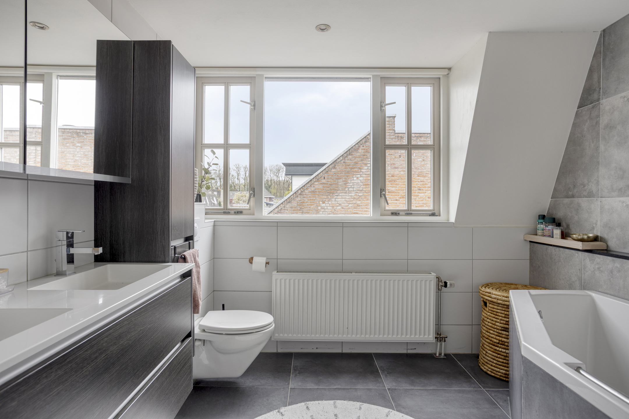 De badkamer is modern en compleet uitgevoerd met een ligbad, douche, dubbele wastafel met meubel en een toilet.