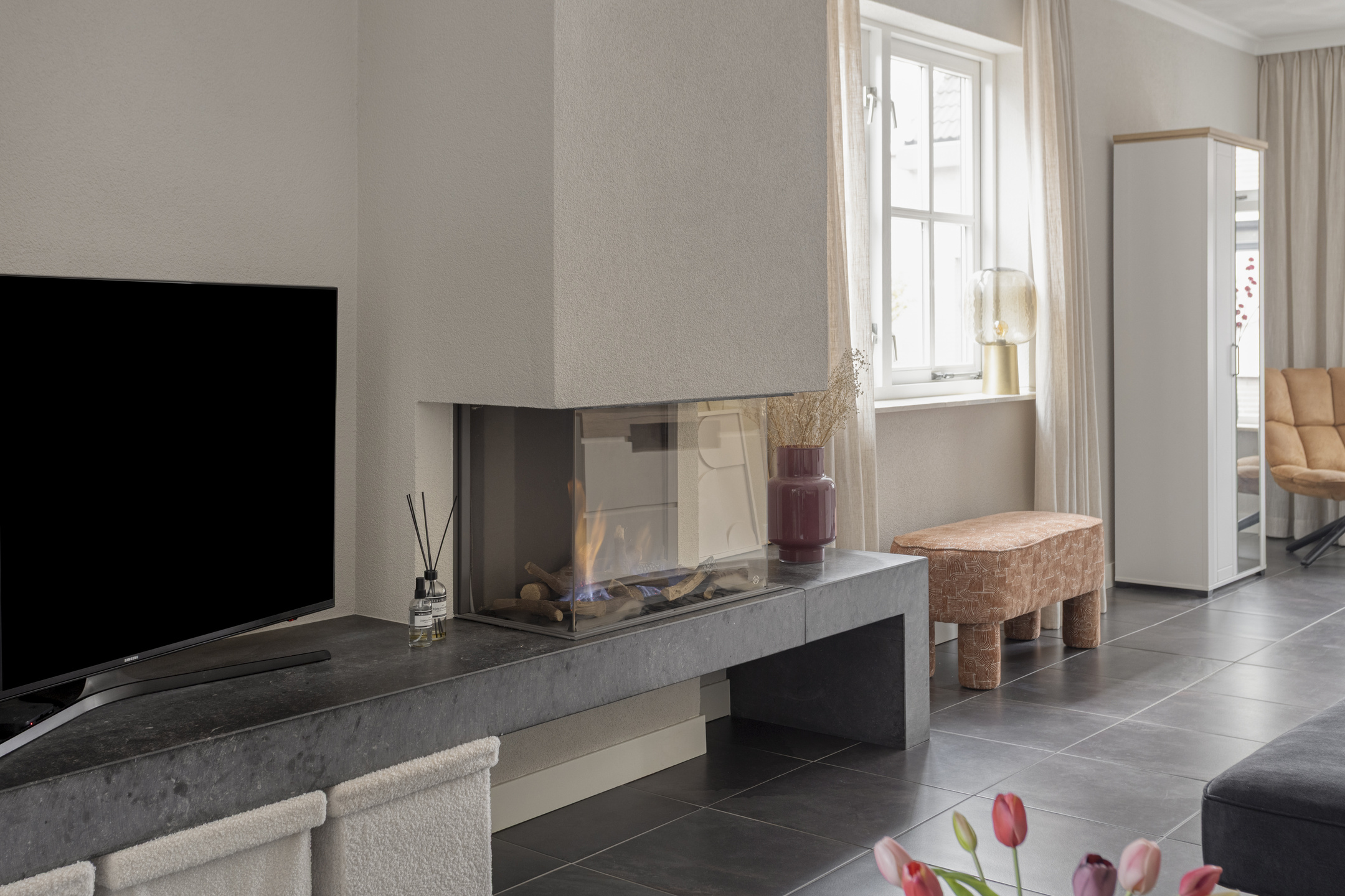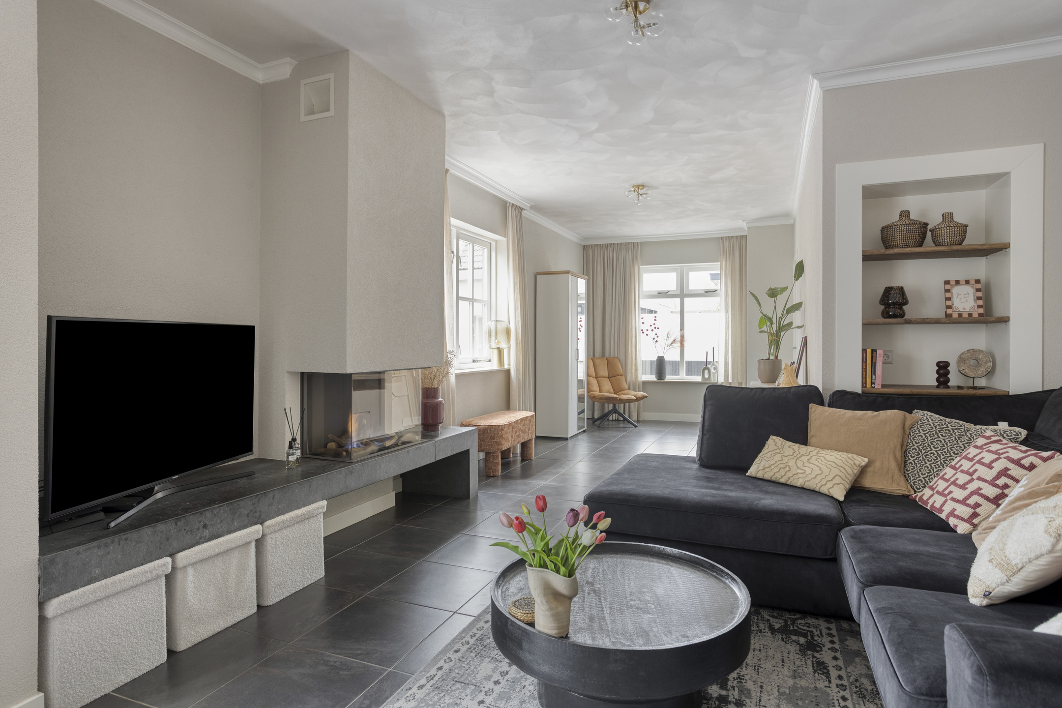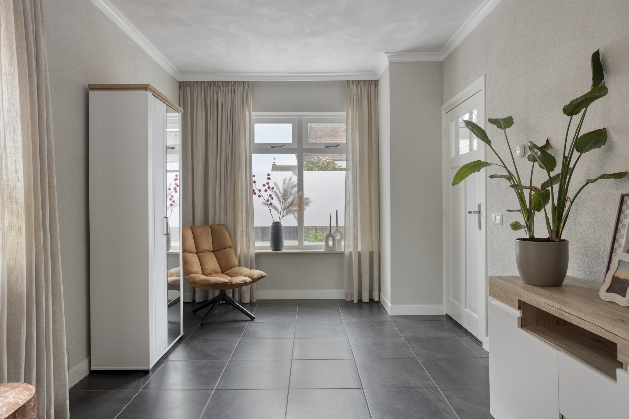 Via de entree komt u in de hal met meterkast en toegang tot de woonkamer. De woonkamer is sfeervol ingericht en beschikt over een gashaard die zorgt voor een warm en gezellig middelpunt. De begane grond is voorzien van vloerverwarming, wat zorgt voor extra comfort.